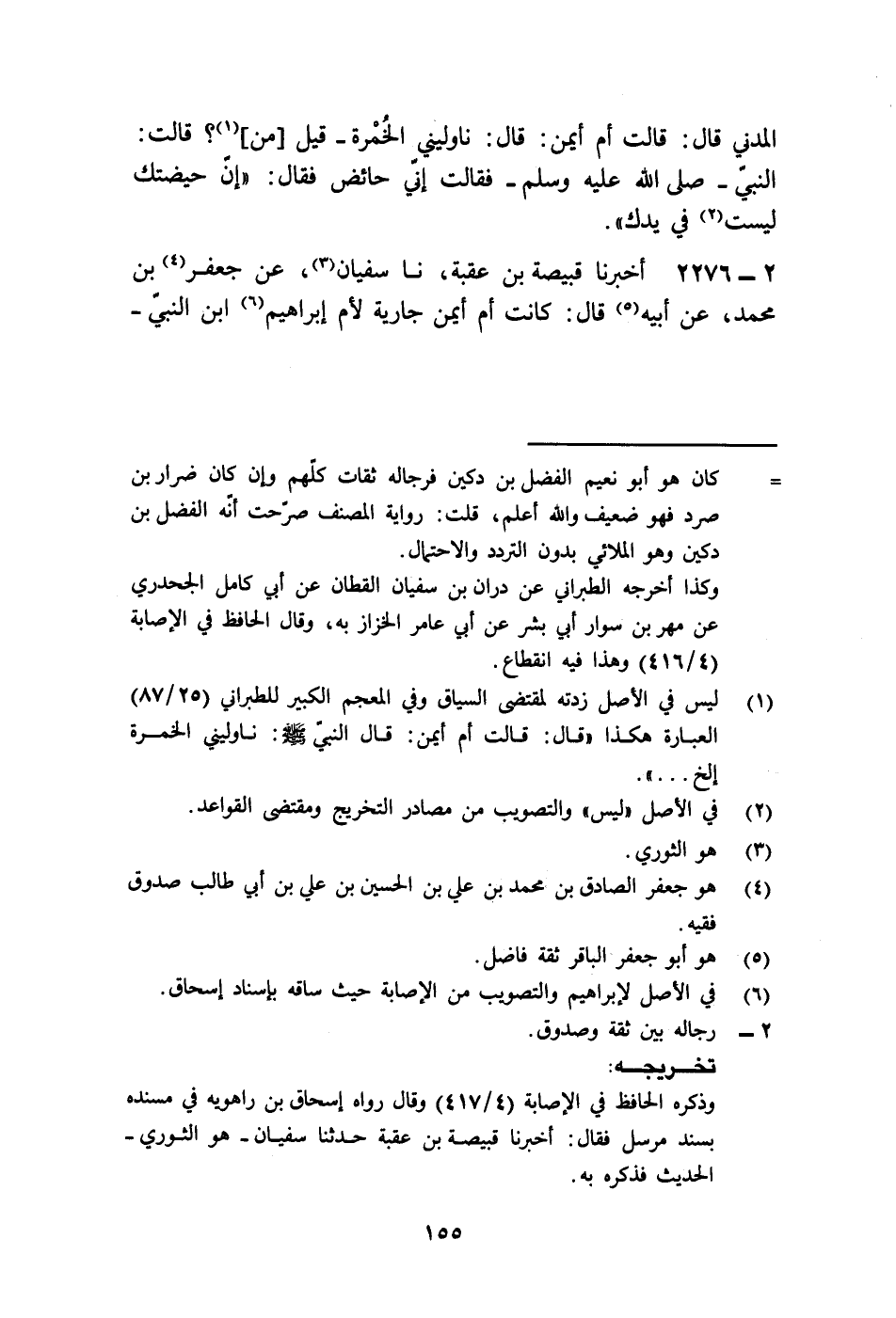 2276 - أَخْبَرَنَا قَبِيصَةُ بْنُ عُقْبَةَ، نا سُفْيَانُ، عَنْ جَعْفَرِ بْنِ مُحَمَّدٍ، عَنْ أَبِيهِ قَالَ: كَانَتْ أُمُّ أَيْمَنَ جَارِيَةً لِأُمِّ إِبْرَاهِيمَ بْنِ النَّبِيِّ صَلَّى اللهُ عَلَيْهِ وَسَلَّمَ -[156]-، فَكَانَتْ إِذَا دَخَلَتْ قَالَتْ: السَّلَامُ لَا عَلَيْكُمُ، §فَرَخَّصَ لَهَا رَسُولُ اللَّهِ صَلَّى اللهُ عَلَيْهِ وَسَلَّمَ أَنْ تَقُولَ: «السَّلَامُ» وَقَالَ قَيْسٌ: عَنْ طَارِقِ بْنِ شِهَابٍ قَالَ: لَمَّا قُتِلَ عُمَرُ قَالَتْ أُمُّ أَيْمَنَ: الْيَوْمَ وَهِيَ الْإِسْلَامُ قَالَ: وَكَانَ سُفْيَانُ رُبَّمَا ذُكِرَ فِي حَدِيثِ قَيْسٍ قَالَ: قُلْ لَهَا: لَا تَبْكِينَ، فَقَالَتْ: إِنَّمَا أَبْكِي عَلَى خَبَرِ السَّمَاءِ قَالَ إِسْحَاقُ: نَرَاهُ وَهْمًا مِنْ سُفْيَانَ
