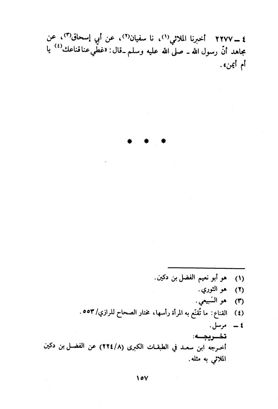 2277 - أَخْبَرَنَا الْمُلَائِيُّ، نا سُفْيَانُ، عَنْ أَبِي إِسْحَاقَ، عَنْ مُجَاهِدٍ، أَنَّ رَسُولَ اللَّهِ صَلَّى اللهُ عَلَيْهِ وَسَلَّمَ قَالَ: «§غَطِّي عَنَّا قِنَاعَكَ يَا أُمَّ أَيْمَنَ»