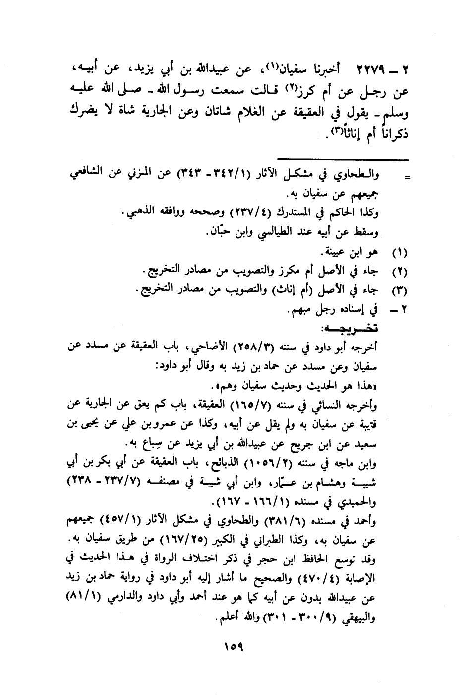 2279 - أَخْبَرَنَا سُفْيَانُ، عَنْ عُبَيْدِ اللَّهِ بْنِ أَبِي يَزِيدَ، عَنْ أَبِيهِ، عَنْ رَجُلٍ، عَنْ أُمِّ كُرْزٍ قَالَتْ: سَمِعْتُ رَسُولَ اللَّهِ صَلَّى اللهُ عَلَيْهِ وَسَلَّمَ يَقُولُ فِي الْعَقِيقَةِ: «§عَنِ الْغُلَامِ شَاتَانِ، وَعَنِ الْجَارِيَةِ شَاةٌ لَا يَضُرُّكَ ذُكْرَانًا أَمْ إِنَاثًا»