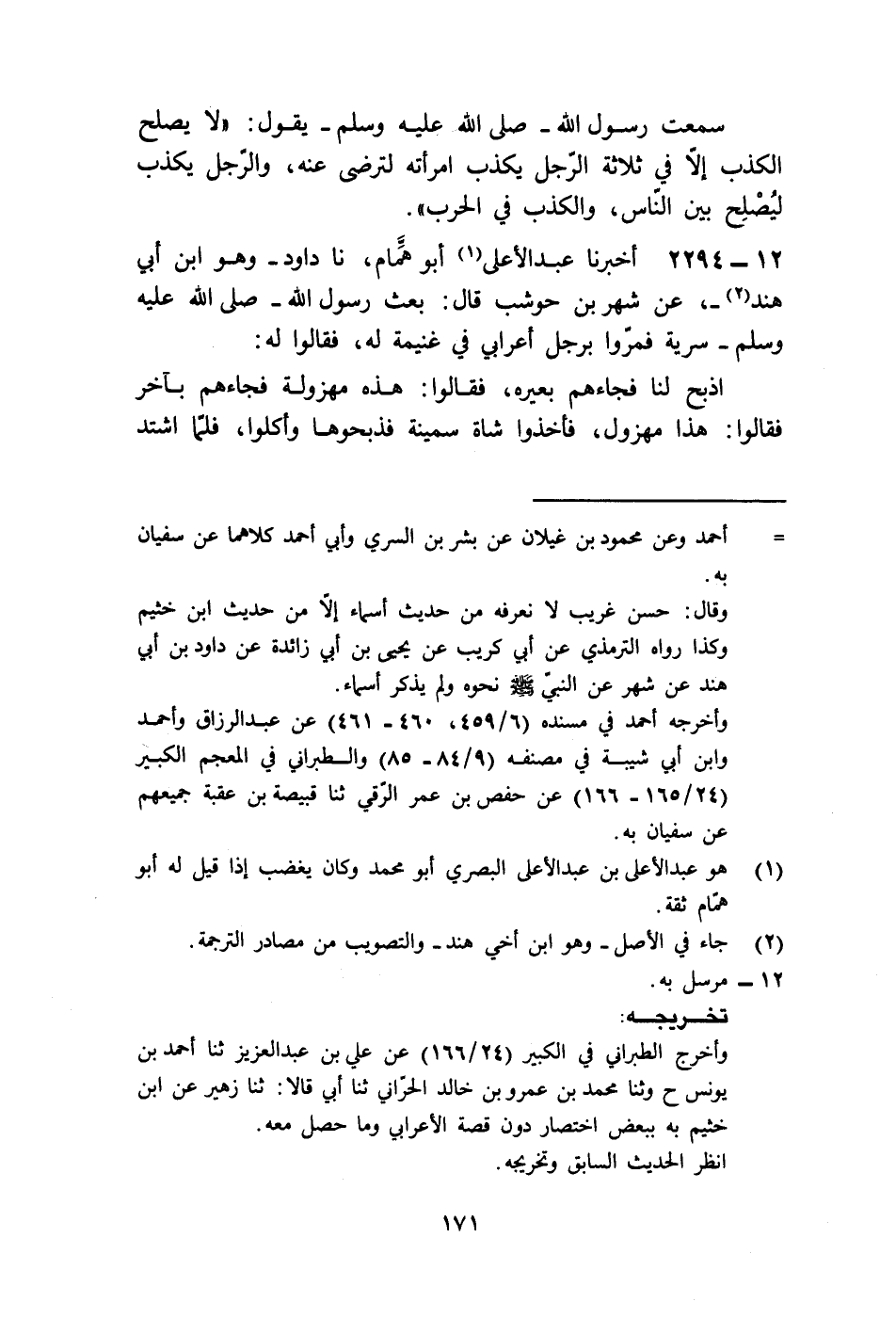 2294 - أَخْبَرَنَا عَبْدُ الْأَعْلَى أَبُو هَمَّامٍ، نا دَاوُدُ وَهُوَ ابْنُ أَبِي هِنْدَ , عَنْ شَهْرِ بْنِ حَوْشَبٍ قَالَ: بَعَثَ رَسُولُ اللَّهِ صَلَّى اللهُ عَلَيْهِ وَسَلَّمَ سَرِيَّةً، فَمَرُّوا بِرَجُلٍ أَعْرَابِيٍّ فِي غَنِيمَةٍ لَهُ، فَقَالُوا لَهُ: اذْبَحْ لَنَا فَجَاءَهُمْ بَعِيرَهُ، فَقَالُوا: هَذِهِ مَهْزُولَةٌ، فَجَاءَهُمْ بِآخَرَ، فَقَالُوا: هَذَا مَهْزُولٌ، فَأَخَذُوا شَاةً سَمِينَةً فَذَبَحُوهَا، وَأَكَلُوا، فَلَمَّا اشْتَدَّ -[172]- الْحَرُّ وَكَانَ لَهُ غَنِيمَةٌ فِي ظِلٍّ لَهُ، فَقَالُوا لَهُ: أَخْرِجْ غَنَمَكَ حَتَّى نَسْتَظِلَّ فِي هَذَا الظِّلِّ، فَقَالَ: إِنَّ غَنَمِي وَلِدُوا، وَإِنِّي مَتَى مَا أَخْرَجْتُهَا فَيُصِيبُهَا السَّمُومُ تَخْدُجُ، فَقَالُوا: أَنْفُسُنَا أَحَبُّ إِلَيْنَا مِنْ غَنَمِكَ، فَأَخْرَجُوهَا، فَخَرَجَتْ، فَانْطَلَقَ إِلَى النَّبِيِّ صَلَّى اللهُ عَلَيْهِ وَسَلَّمَ، فَأَخْبَرَهُ، فَانْتَظَرَ رَسُولُ اللَّهِ صَلَّى اللهُ عَلَيْهِ وَسَلَّمَ حَتَّى جَاءَتِ السَّرِيَّةُ، فَسَأَلَهُمْ، فَجَعَلُوا يَحْلِفُونَ بِاللَّهِ مَا فَعَلُوا، فَقَالَ: وَاللَّهِ لَقَدْ فَعَلُوا الَّذِي أَخْبَرْتُكَ بِهِ، فَنَظَرَ رَسُولُ اللَّهِ صَلَّى اللهُ عَلَيْهِ وَسَلَّمَ رَجُلًا مِنَ الْقَوْمِ، فَقَالَ: «§إِنْ يَكُ فِي الْقَوْمِ خَيْرٌ فَعِنْدَ هَذَا» ، فَسَأَلَهُ فَأَخْبَرَهُ، فَقَالَ: مِثْلُ مَا قَالَ الْأَعْرَابِيُّ، فَقَالَ رَسُولُ اللَّهِ صَلَّى اللهُ عَلَيْهِ وَسَلَّمَ: " تَتَهَافَتُونَ فِي الْكَذِبِ تَهَافُتَ الْفَرَاشِ فِي النَّارِ، وَإِنَّ كُلَّ كَذِبٍ مَكْتُوبٌ لَا مَحَالَةَ كَذِبًا إِلَّا ثَلَاثَةً: الْكَذِبُ فِي الْحَرْبِ وَالْحَرْبُ خُدْعَةٌ، وَالْكَذِبُ بَيْنَ الرَّجُلَيْنِ لِيُصْلِحَ بَيْنَهُمَا، وَكَذِبُ الرَّجُلِ عَلَى امْرَأَتِهِ يُمَنِّيهَا "