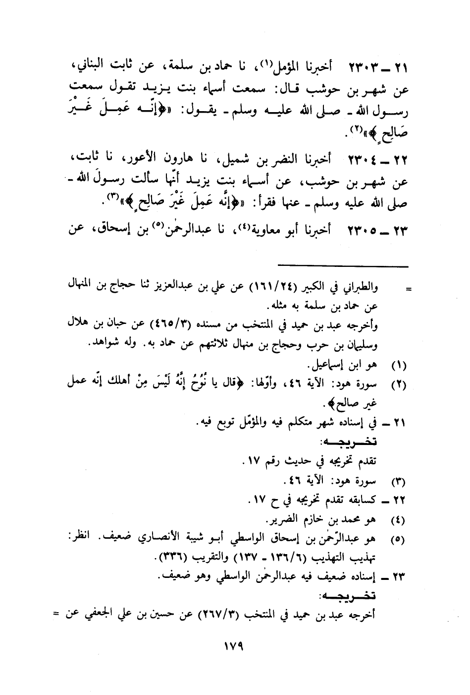 2304 - أَخْبَرَنَا النَّضْرُ بْنُ شُمَيْلٍ، نا هَارُونُ الْأَعْوَرُ، نا ثَابِتٌ، عَنْ شَهْرِ بْنِ حَوْشَبٍ، عَنْ أَسْمَاءَ بِنْتِ يَزِيدَ أَنَّهَا سَأَلَتْ رَسُولَ اللَّهِ صَلَّى اللهُ عَلَيْهِ وَسَلَّمَ عَنْهَا " §فَقَرَأَ: (إِنَّهُ عَمِلَ غَيْرَ صَالِحٍ) "