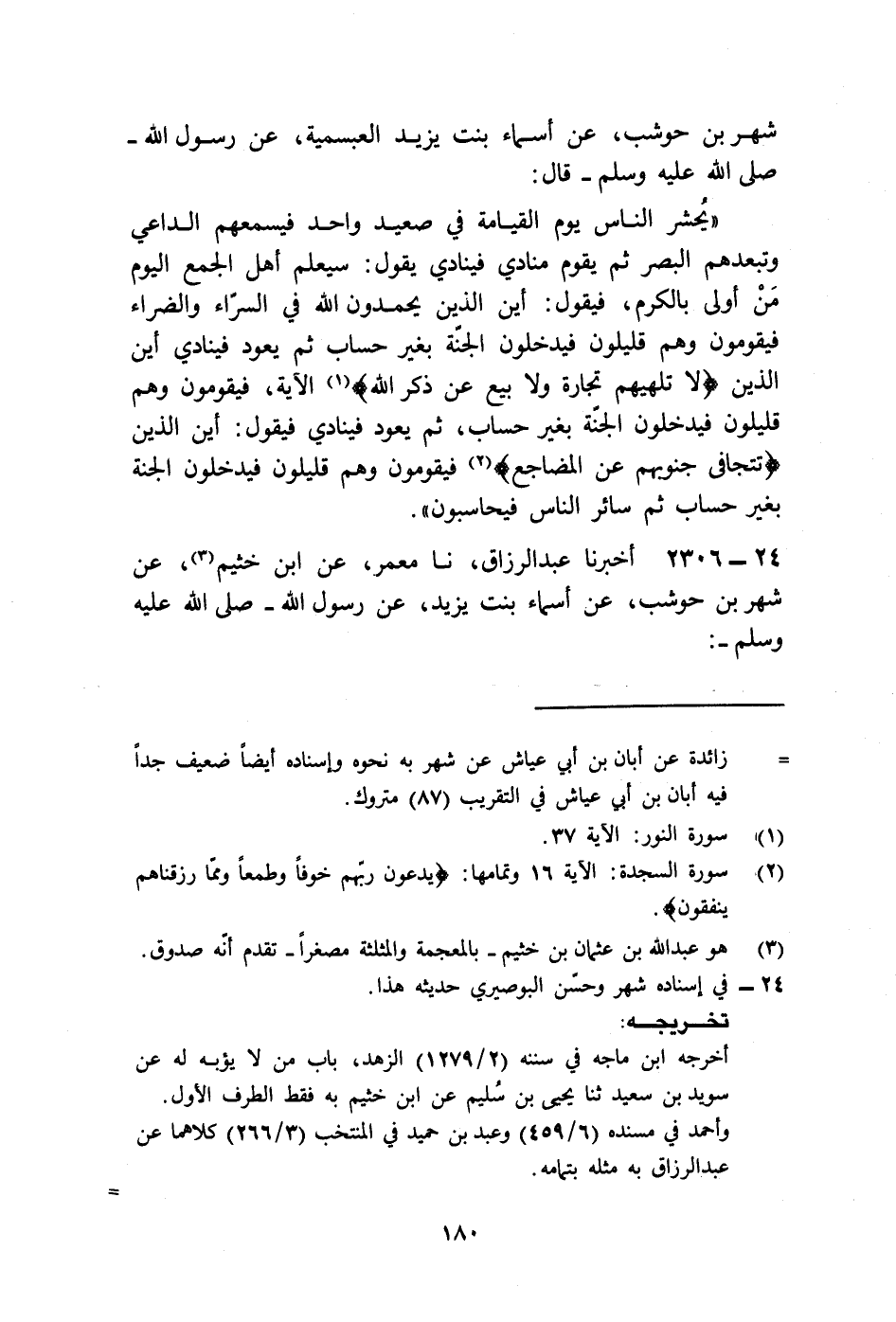 2306 - أَخْبَرَنَا عَبْدُ الرَّزَّاقِ، نا مَعْمَرٌ، عَنِ ابْنِ خُثَيْمٍ، عَنْ شَهْرِ بْنِ حَوْشَبٍ، عَنْ أَسْمَاءَ بِنْتِ يَزِيدَ عَنْ رَسُولِ اللَّهِ صَلَّى اللهُ عَلَيْهِ وَسَلَّمَ -[181]-: «§أَلَا أُخْبِرُكُمْ بِخِيَارِكُمْ؟» فَقَالُوا: بَلَى، فَقَالَ: «الَّذِينَ إِذَا رُؤُوا ذُكِرَ اللَّهُ، أَلَا أُخْبِرُكُمْ بِشِرَارِكُمْ؟» ، فَقَالُوا: بَلَى يَا رَسُولَ اللَّهِ، فَقَالَ: «الْمَاشُونَ بِالنَّمِيمَةِ الْمُفْسِدُونَ بَيْنَ الْأَحِبَّةِ، الْبَاغُونَ الْبُرَآءَ الْعَنَتَ»