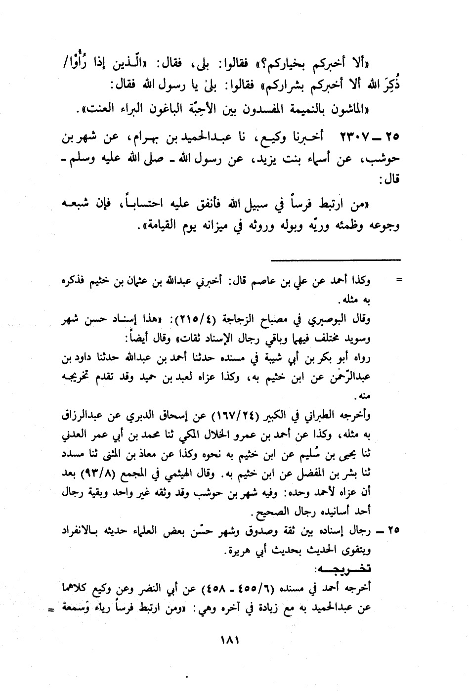 2307 - أَخْبَرَنَا وَكِيعٌ، نا عَبْدُ الْحَمِيدِ بْنُ بَهْرَامَ، عَنْ شَهْرِ بْنِ حَوْشَبٍ، عَنْ أَسْمَاءَ بِنْتِ يَزِيدَ عَنْ رَسُولِ اللَّهِ صَلَّى اللهُ عَلَيْهِ وَسَلَّمَ قَالَ: «§مَنِ ارْتَبَطَ فَرَسًا فِي سَبِيلِ اللَّهِ فَأَنْفَقَ عَلَيْهِ احْتِسَابًا، فَإِنَّ شِبَعَهُ وَجُوعَهُ وَظَمَأَهُ وَرِيَّهُ وَبَوْلَهُ وَرَوْثَهُ فِي مِيزَانِهِ يَوْمَ الْقِيَامَةِ»