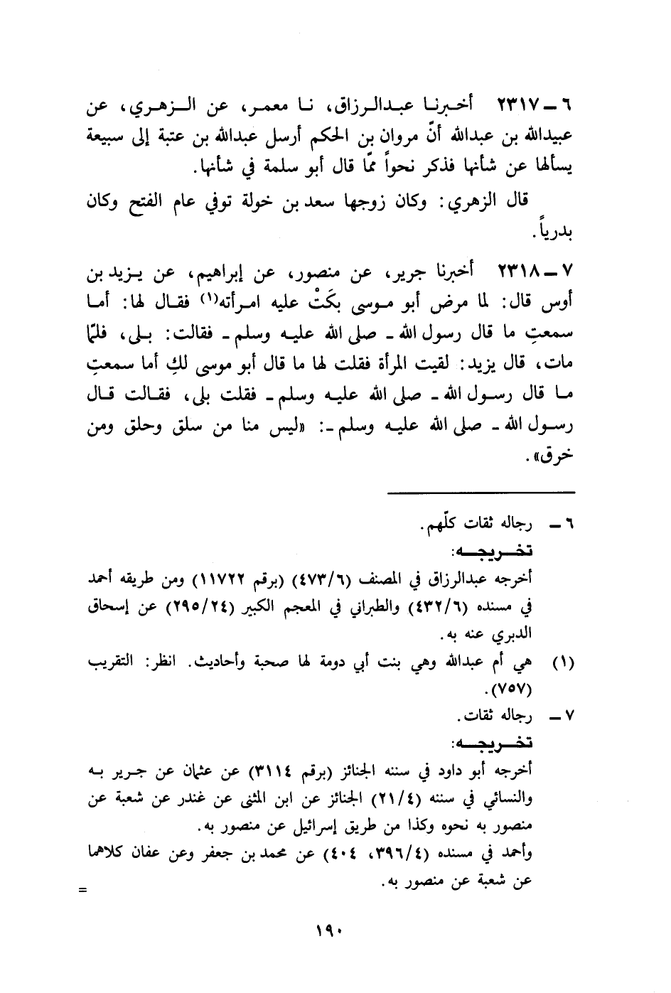 2318 - أَخْبَرَنَا جَرِيرٌ، عَنْ مَنْصُورٍ، عَنْ إِبْرَاهِيمَ، عَنْ يَزِيدَ بْنِ أَوْسٍ قَالَ: لَمَّا مَرِضَ أَبُو مُوسَى بَكَتْ عَلَيْهِ امْرَأَتُهُ فَقَالَ لَهَا: أَمَا سَمِعْتِ مَا قَالَ رَسُولُ اللَّهِ صَلَّى اللهُ عَلَيْهِ وَسَلَّمَ؟ فَقَالَتْ: بَلَى، فَلَمَّا مَاتَ قَالَ يَزِيدُ: لَقِيتُ الْمَرْأَةَ فَقُلْتُ لَهَا: مَا قَالَ أَبُو مُوسَى لَكِ: أَمَا سَمِعْتِ مَا قَالَ رَسُولُ اللَّهِ صَلَّى اللهُ عَلَيْهِ وَسَلَّمَ؟ فَقُلْتِ: بَلَى، فَقَالَتْ: قَالَ رَسُولُ اللَّهِ صَلَّى اللهُ عَلَيْهِ وَسَلَّمَ: «§لَيْسَ مِنَّا مَنْ سَلَقَ وَحَلَقَ وَمَنْ خَرَقَ»