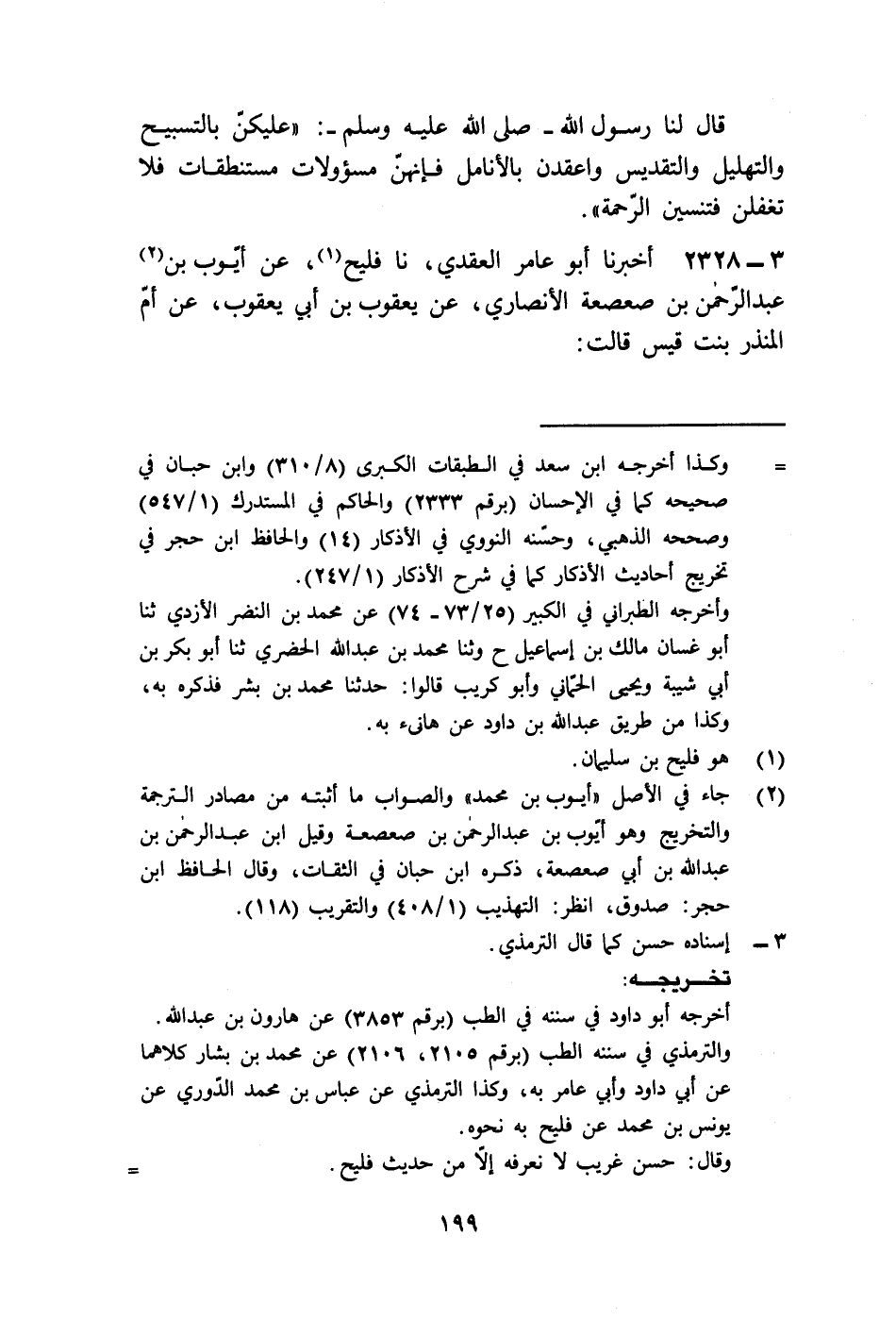 2328 - أَخْبَرَنَا أَبُو عَامِرٍ الْعَقَدِيُّ، نا فُلَيْحٌ، عَنْ أَيُّوبَ بْنِ عَبْدِ الرَّحْمَنِ بْنِ صَعْصَعَةَ الْأَنْصَارِيِّ، عَنْ يَعْقُوبَ بْنِ أَبِي يَعْقُوبَ، عَنْ أُمِّ الْمُنْذِرِ بِنْتِ قَيْسٍ قَالَتْ: دَخَلَ عَلَيَّ رَسُولُ اللَّهِ صَلَّى اللهُ عَلَيْهِ وَسَلَّمَ يَوْمًا وَعَلِيٌّ مَعَهُ، وَعَلِيٌّ نَاقِهٌ مِنْ مَرَضٍ، وَلَنَا دَوَالِي مُعَلَّقَةٌ، فَقَامَ رَسُولُ اللَّهِ وَعَلِيٌّ يَأْكُلُ مِنْهَا، فَطَفِقَ رَسُولُ اللَّهِ صَلَّى اللهُ عَلَيْهِ وَسَلَّمَ يَقُولُ لِعَلِيٍّ: «مَهْ، إِنَّكَ نَاقِهٌ» ، حَتَّى كَفَّ عَلِيٌّ، قَالَتْ: فَصَنَعْتُ شَعِيرًا وَسِلْقًا، ثُمَّ جِئْتُ بِهِ إِلَى رَسُولِ اللَّهِ صَلَّى اللهُ عَلَيْهِ وَسَلَّمَ، فَقَالَ رَسُولُ اللَّهِ صَلَّى اللهُ عَلَيْهِ وَسَلَّمَ: «يَا عَلِيُّ §مِنْ هَذَا فَأَصِبْ، فَإِنَّهُ أَنْفَعُ لَكَ»