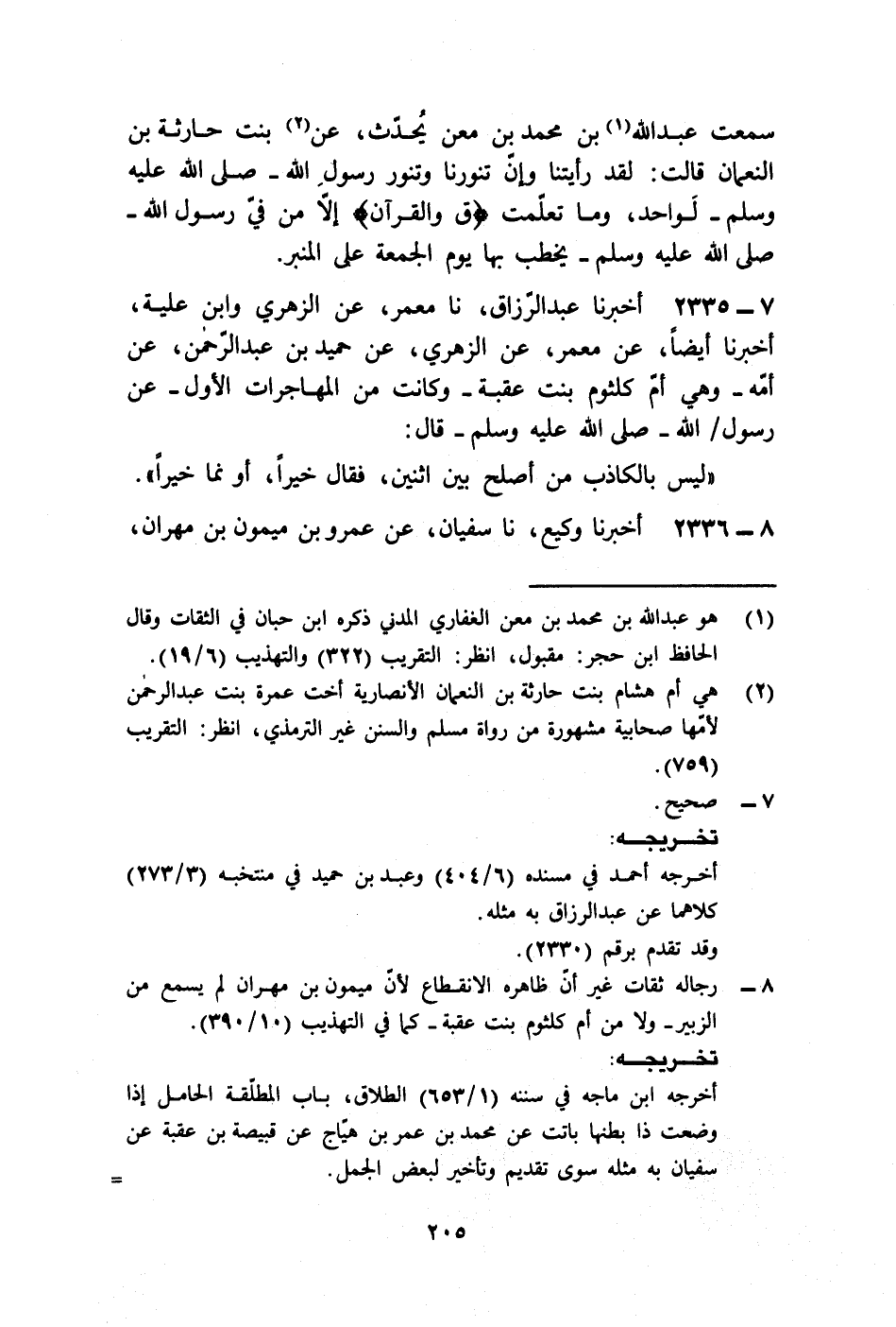 2335 - أَخْبَرَنَا عَبْدُ الرَّزَّاقِ، نا مَعْمَرٌ، عَنِ الزُّهْرِيِّ، وَابْنُ عُلَيَّةَ أَخْبَرَنَا أَيْضًا، عَنْ مَعْمَرٍ، عَنِ الزُّهْرِيِّ، عَنْ حُمَيْدِ بْنِ عَبْدِ الرَّحْمَنِ، عَنْ أُمِّهِ، وَهِيَ أُمِّ كُلْثُومٍ بِنْتِ عُقْبَةَ وَكَانَتْ مِنَ الْمُهَاجِرَاتِ الْأَوَّلِ عَنْ رَسُولِ اللَّهِ صَلَّى اللهُ عَلَيْهِ وَسَلَّمَ قَالَ: «§لَيْسَ بِالْكَاذِبِ مَنْ أَصْلَحَ بَيْنَ اثْنَيْنِ فَقَالَ أَخِيرًا أَوْ نَمَا خَيْرًا»