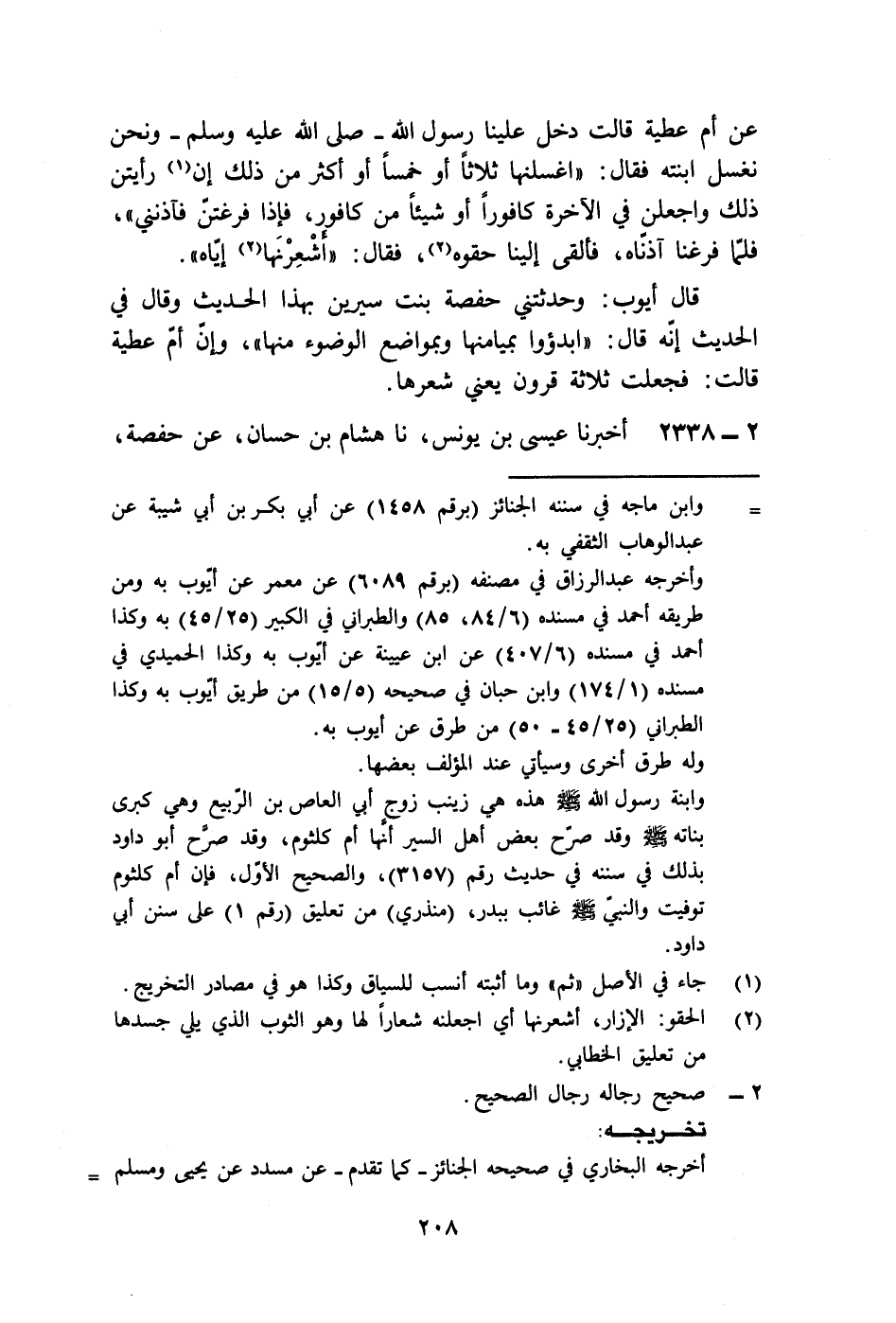 2338 - أَخْبَرَنَا عِيسَى بْنُ يُونُسَ، نا هِشَامُ بْنُ حَسَّانَ، عَنْ حَفْصَةَ -[209]-، عَنْ أُمِّ عَطِيَّةَ قَالَتْ: تُوُفِّيَ إِحْدَى بَنَاتِ النَّبِيِّ صَلَّى اللهُ عَلَيْهِ وَسَلَّمَ، فَقَالَ لَنَا رَسُولُ اللَّهِ صَلَّى اللهُ عَلَيْهِ وَسَلَّمَ: «§اغْسِلُوهَا بِمَاءٍ وَسِدْرٍ، وَاغْسِلُوهَا وِتْرًا ثَلَاثًا أَوْ خَمْسًا أَوْ أَكْثَرَ مِنْ ذَلِكَ إِنَّ رَأَيْتُنَّ، وَاجْعَلْنَ فِي الْآخِرَةِ كَافُورًا أَوْ شَيْئًا مِنْ كَافُورٍ، فَإِذَا فَرَغْتُنَّ فَآذِنَّنِي» ، فَلَمَّا فَرَغْنَا آذَنَّاهُ، فَأَلْقَى إِلَيْنَا حَقْوَهُ وَقَالَ: «أَشْعِرْنَهَا إِيَّاهُ»