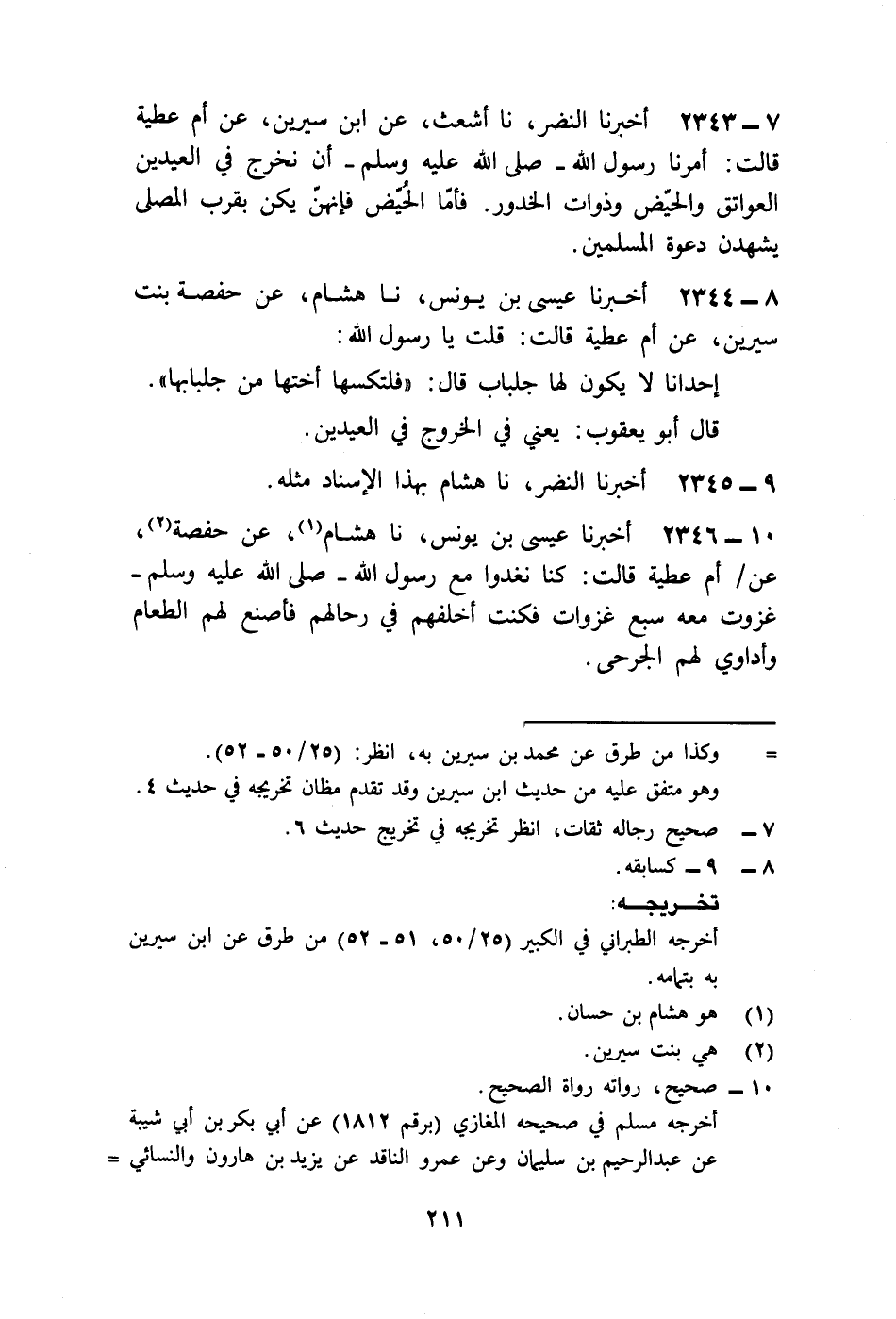 2343 - أَخْبَرَنَا النَّضْرُ، نا أَشْعَثُ، عَنِ ابْنِ سِيرِينَ، عَنْ أُمِّ عَطِيَّةَ قَالَتْ: «§أَمَرَنَا رَسُولُ اللَّهِ صَلَّى اللهُ عَلَيْهِ وَسَلَّمَ أَنَّ نُخْرِجَ فِي الْعِيدَيْنِ الْعَوَاتِقَ وَالْحُيَّضَ وَذَوَاتَ الْخُدُورِ، فَأَمَّا الْحَيْضُ فَإِنَّهُنَّ يَكُنَّ بِقُرْبِ الْمُصَلَّى يَشْهَدْنَ دَعْوَةَ الْمُسْلِمِينَ»