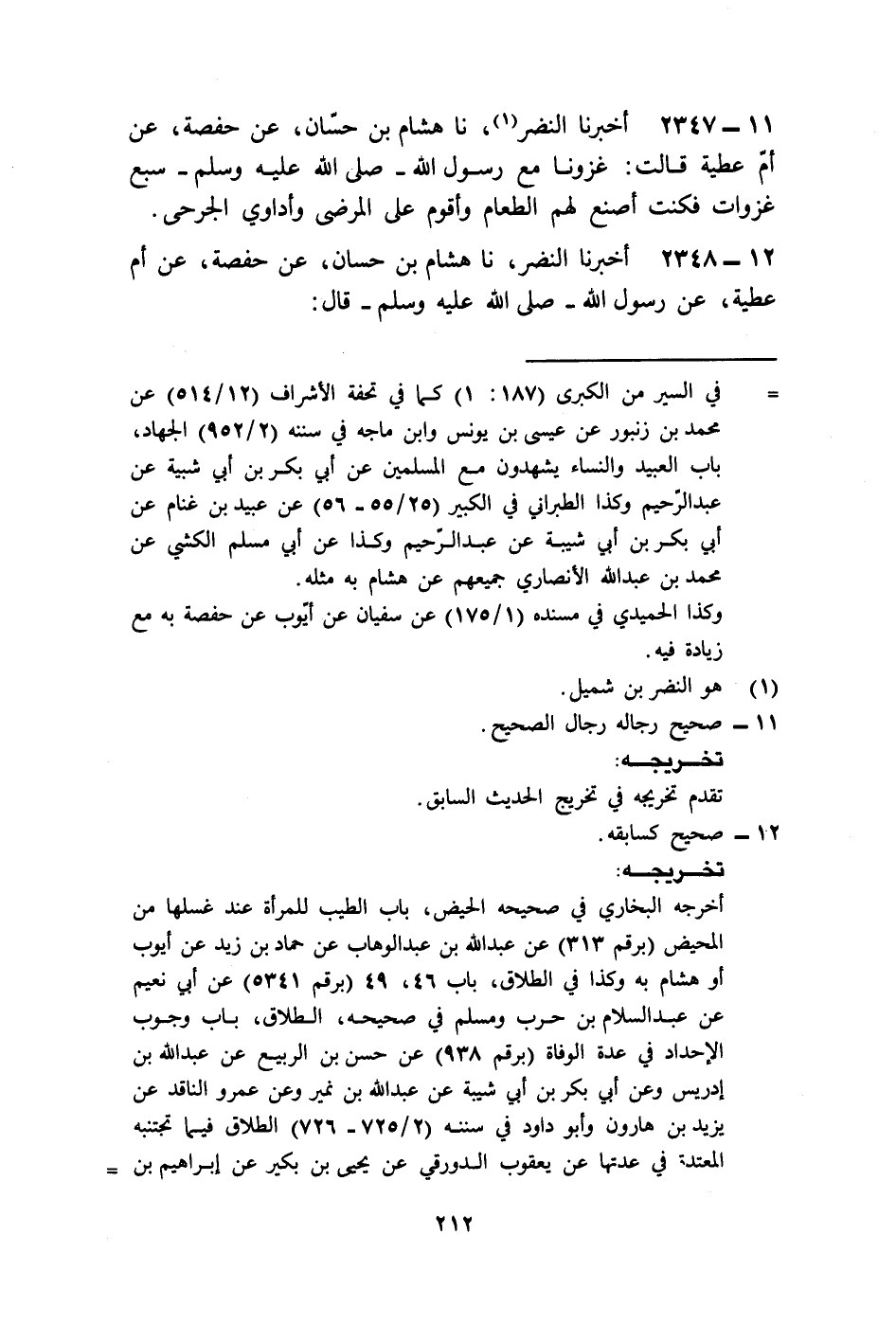 2348 - أَخْبَرَنَا النَّضْرُ، نا هِشَامُ بْنُ حَسَّانَ، عَنْ حَفْصَةَ، عَنْ أُمِّ عَطِيَّةَ قَالَتْ: «§غَزَوْنَا مَعَ رَسُولِ اللَّهِ صَلَّى اللهُ عَلَيْهِ وَسَلَّمَ سَبْعَ غَزَوَاتٍ، فَكُنْتُ أَصْنَعُ لَهُمُ الطَّعَامَ، وَأَقُومُ عَلَى الْمَرْضَى، وَأُدَاوِي الْجَرْحَى»