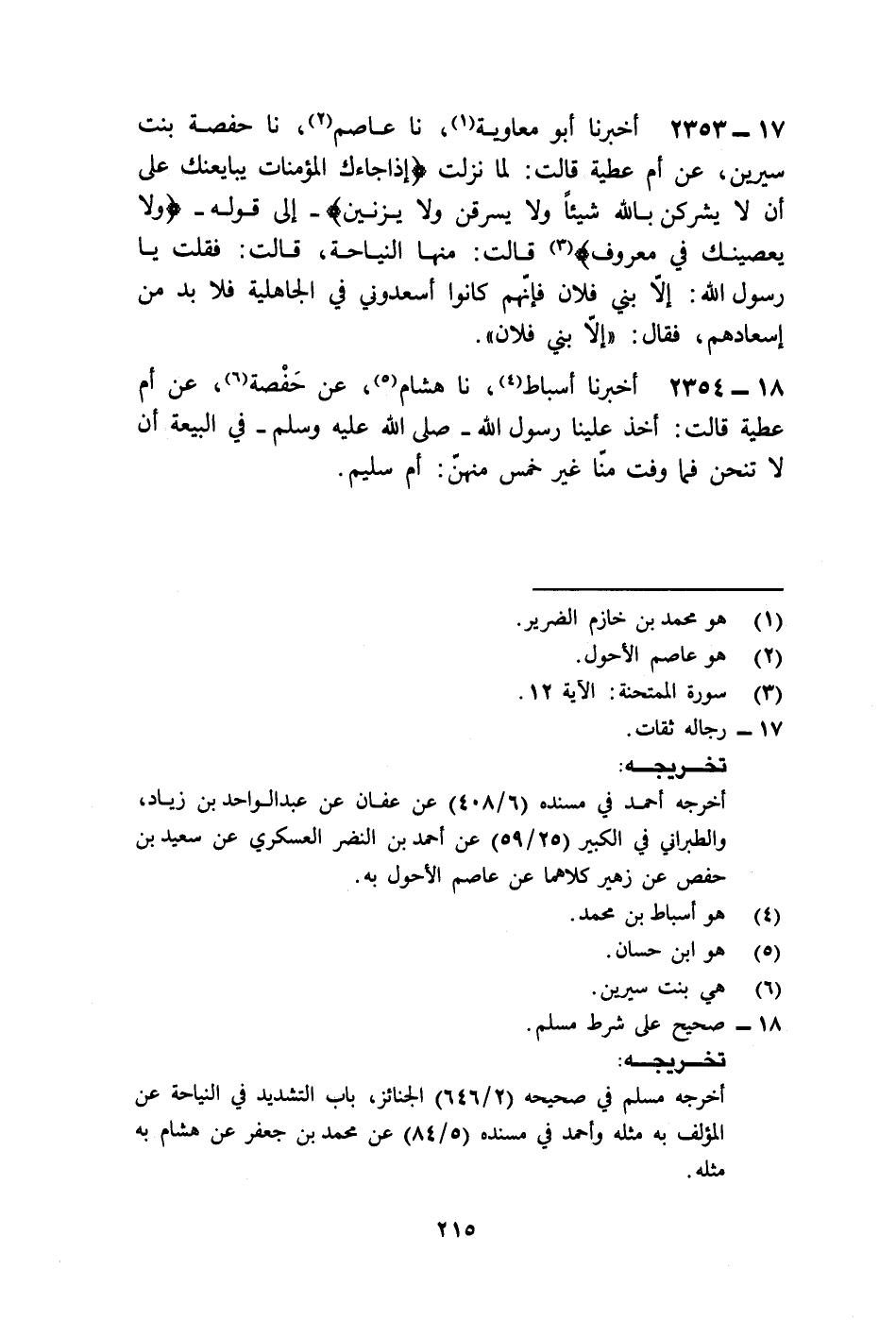 2353 - أَخْبَرَنَا أَبُو مُعَاوِيَةَ، نا عَاصِمٌ، نا حَفْصَةُ بِنْتُ سِيرِينَ، عَنْ أُمِّ عَطِيَّةَ قَالَتْ: §لَمَّا نَزَلَتْ: {إِذَا جَاءَكَ الْمُؤْمِنَاتُ يُبَايِعْنَكَ عَلَى أَنْ لَا يُشْرِكْنَ بِاللَّهِ شَيْئًا وَلَا يَسْرِقْنَ وَلَا يَزْنِينَ} [الممتحنة: 12] إِلَى قَوْلِهِ: {وَلَا يَعْصِينَكَ فِي مَعْرُوفٍ} [الممتحنة: 12] قَالَتْ: مِنْهَا النِّيَاحَةُ، قَالَتْ: فَقُلْتُ: يَا رَسُولَ اللَّهِ، إِلَّا بَنِي فُلَانٍ فَإِنَّهُمْ كَانُوا أَسْعَدُونِي فِي الْجَاهِلِيَّةِ فَلَا بُدَّ مِنْ إِسْعَادِهِمْ فَقَالَ: «إِلَّا بَنِي فُلَانٍ»