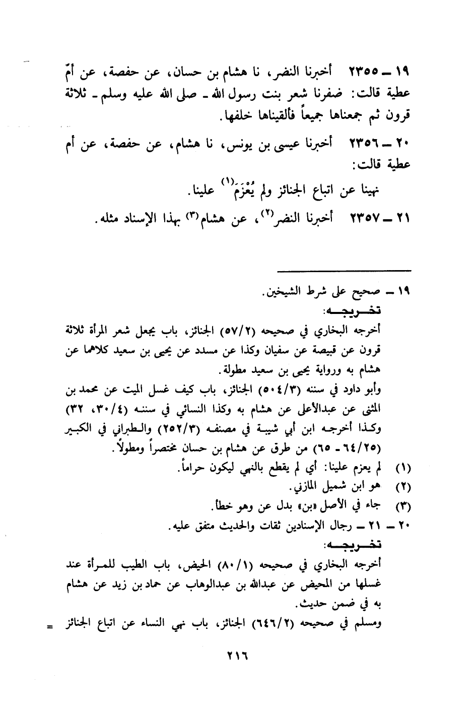 2356 - أَخْبَرَنَا عِيسَى بْنُ يُونُسَ، نا هِشَامٌ، عَنْ حَفْصَةَ، عَنْ أُمِّ عَطِيَّةَ قَالَتْ: «§نُهِينَا عَنِ اتِّبَاعِ الْجَنَائِزِ، وَلَمْ يُعْزَمْ عَلَيْنَا»