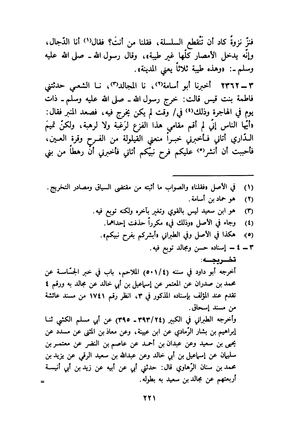 2362 - أَخْبَرَنَا أَبُو أُسَامَةَ، نا الْمُجَالِدُ، نا الشَّعْبِيُّ، حَدَّثَتْنِي فَاطِمَةُ بِنْتُ قَيْسٍ قَالَتْ: خَرَجَ رَسُولُ اللَّهِ صَلَّى اللهُ عَلَيْهِ وَسَلَّمَ ذَاتَ يَوْمٍ فِي الْهَاجِرَةِ، وَذَلِكَ فِي وَقْتٍ لَمْ يَكُنْ يَخْرُجُ فِيهِ، فَصَعِدَ الْمِنْبَرَ فَقَالَ: " أَيُّهَا النَّاسُ، إِنِّي §لَمْ أَقُمْ مَقَامِي هَذَا الْفَزَعَ لِرَغْبَةٍ وَلَا لِرَهْبَةٍ وَلَكِنَّ تَمِيمَ الدَّارِيَّ أَتَانِي فَأَخْبَرَنِي خَبَرًا مَنَعَنِي الْقَيْلُولَةَ مِنَ الْفَرَحِ وَقُرَّةِ الْعَيْنِ، فَأَحْبَبْتُ أَنْ أَنْشُرَ عَلَيْكُمْ فَرَحَ نَبِيِّكُمْ، أَتَانِي فَأَخْبَرَنِي أَنَّ رَهْطًا مِنْ بَنِي -[222]- عَمِّهِ رَكِبُوا الْبَحْرَ فَأَصَابَتْهُمْ عَاصِفٌ مِنَ الرِّيحِ، فَأَلْجَأَتْهُمْ إِلَى جَزِيرَةٍ لَا يَعْرِفُونَهَا، فَقَعَدُوا فِي قُوَيْرِبِ السَّفِينَةِ حَتَّى خَرَجُوا مِنَ الْبَحْرِ فَإِذَا هُمْ بِشَيْءٍ أَسْوَدَ وَأَهْدَبَ كَثِيرِ الشَّعْرِ لَا يَدْرُونَ أَرَجُلٌ أَمِ امْرَأَةٌ، فَقَالُوا لَهَا: مَنْ أَنْتِ؟ قَالَتْ: أَنَا الْجَسَّاسَةُ، فَقَالُوا لَهَا: أَلَا تُخْبِرُنَا بِشَيْءٍ؟ فَقَالَتْ: مَا بِمُخْبِرُكُمْ وَلَا مُسْتَخْبِرِكُمْ شَيْئًا وَلَكِنَّ هَذَا الدَّيْرَ قَدْ رَأَيْتُمُوهُ فَفِيهِ مَنْ هُوَ إِلَى خَبَرِكُمْ بِالْأَشْوَاقِ أَنْ يُخْبِرَكُمْ وَيَسْتَخْبِرَكُمْ، فَأَتَوْا الدَّيْرَ فَإِذَا هُمْ بِشَيْءٍ مُوثَقٍ شَدِيدِ الْوَثَاقِ مُظْهِرٍ الْحُزْنَ كَثِيرِ التَّشَكِّي، فَسَلَّمُوا عَلَيْهِ، فَرَدَّ السَّلَامَ ثُمَّ قَالَ لَهُمْ: مِنْ أَيْنَ أَنْتُمْ؟ فَقُلْنَا: مِنَ الشَّامِ، قَالَ: فَمَا فَعَلَتِ -[223]- الْعَرَبُ؟ أَخْرَجَ نَبِيُّهِمْ بَعْدُ؟ فَقَالُوا: نَعَمْ، قَالَ: فَمَا فَعَلَ؟ قَالَ: نَاوَءَهُ قَوْمٌ فَأَظْهَرَهُ اللَّهُ عَلَيْهِمْ فَهُمُ الْيَوْمَ جَمْعٌ، قَالَ: ذَاكَ خَيْرٌ لَهُمْ، قَالَ: فَالْعَرَبُ الْيَوْمَ إِلَهُهُمْ وَاحِدٌ وَكَلِمَتُهُمْ وَاحِدَةٌ؟ قَالُوا: نَعَمْ، قَالَ: ذَاكَ خَيْرٌ لَهُمْ، قَالَ: فَمَا فَعَلَ نَخْلٌ بَيْنَ عُمَانَ وَبَيْسَانَ؟ قَالُوا: هِيَ صَالِحَةٌ يُطْعَمُ جَنَاهُ كُلَّ عَامٍ، قَالَ: فَمَا فَعَلَ عَيْنُ زُغَرٍ؟ قَالُوا: هِيَ صَالِحَةٌ يَشْرَبُ مِنْهَا أَهْلُهَا لِسَقْيِهِمْ وَيَسْقُونَ مِنْهَا زَرْعَهُمْ وَنَخْلَهُمْ، قَالَ: فَمَا فِعْلُ بُحَيْرَةِ الطَّبَرِيَّةِ؟ قَالُوا: هِيَ مَلْأَى يَتَدَفَّقُ جَانِبَاهَا , ثُمَّ قَالَ: فَزَفَرَ زَفْرَةً ثُمَّ حَلَفَ لَوْ قَدِ انْفَلَتُّ مِنْ وَثَاقِي هَذَا مَا تَرَكْتُ أَرْضًا لِلَّهِ إِلَّا وَطِئْتُهُ بِرِجْلِيَّ هَاتَيْنِ غَيْرَ طَيْبَةَ لَيْسَ لِي عَلَيْهَا سَبِيلٌ وَلَا سُلْطَانٌ "، فَقَالَ رَسُولُ اللَّهِ صَلَّى اللهُ عَلَيْهِ وَسَلَّمَ: «إِلَى هَذِهِ انْتَهَى فَرَحِي، هَذِهِ طَيْبَةُ، وَالَّذِي نَفْسِي بِيَدِهِ، إِنَّ هَذِهِ لَطَيْبَةُ، وَقَدْ حَرَّمَ اللَّهُ حَرَمِيَ عَلَى الدَّجَّالِ - ثُمَّ حَلَفَ صَلَّى اللهُ عَلَيْهِ وَسَلَّمَ - مَا بِهَا طَرِيقٌ ضَيِّقٌ وَلَا وَاسِعٌ فِي سَهْلٍ وَلَا جَبَلٍ إِلَّا عَلَيْهِ مَلَكٌ شَاهِرُ السَّيْفِ إِلَى يَوْمِ الْقِيَامَةِ، وَلَا يَسْتَطِيعُ الدَّجَّالَ أَنْ يَدْخُلَهَا»