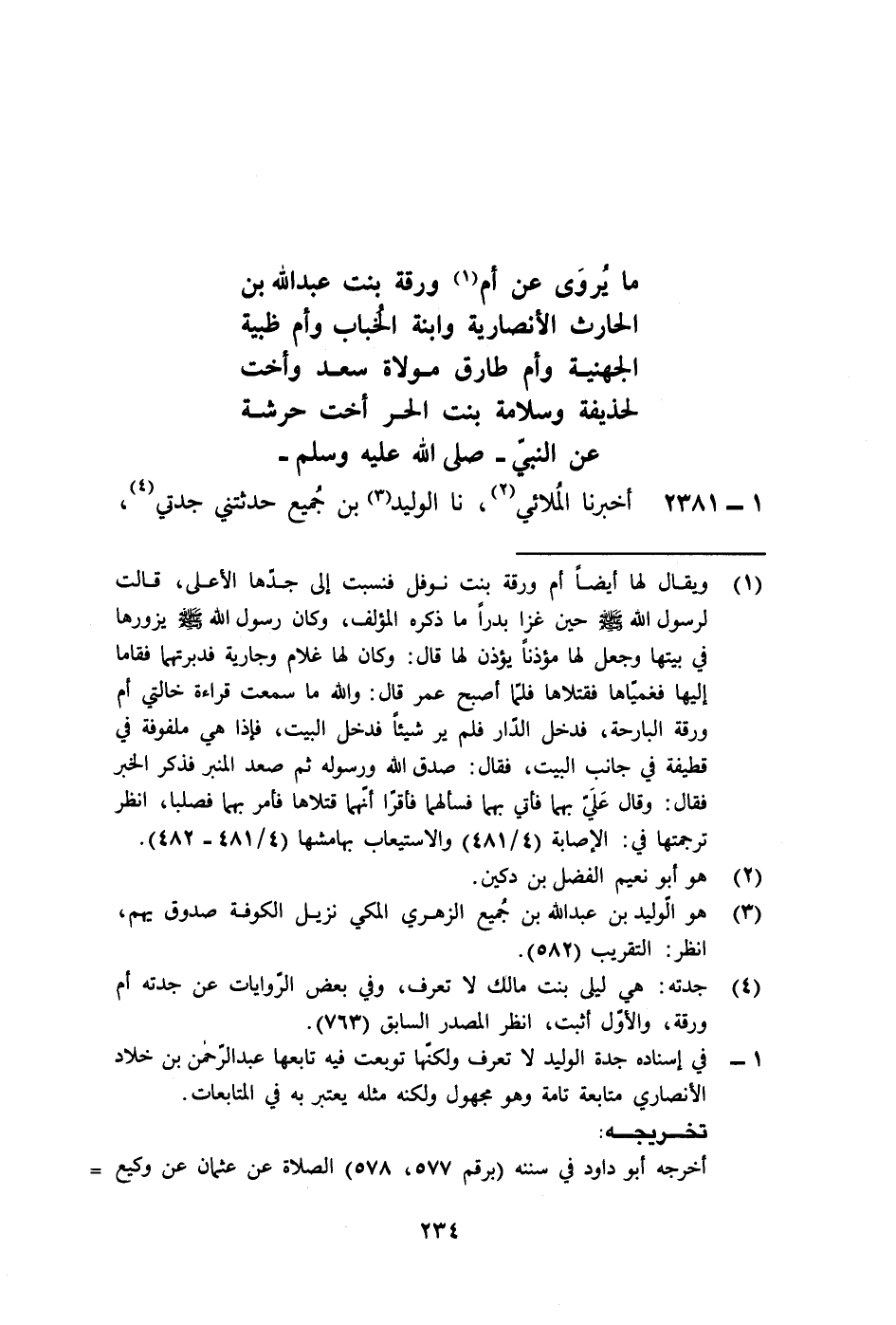 §مَا يُرْوَى عَنْ أُمِّ وَرَقَةَ بِنْتِ عَبْدِ اللَّهِ بْنِ الْحَارِثِ الْأَنْصَارِيَّةِ، وَابْنَةِ الْخَبَّابِ، وَأُمِّ ظَبْيَةَ الْجُهَنِيَّةِ، وَأُمِّ طَارِقٍ مَوْلَاةِ سَعْدٍ، وَأُخْتٍ لِحُذَيْفَةَ، وَسَلَامَةَ بِنْتِ الْحُرِّ أُخْتِ حَرَشَةَ عَنِ النَّبِيِّ صَلَّى اللهُ عَلَيْهِ وَسَلَّمَ