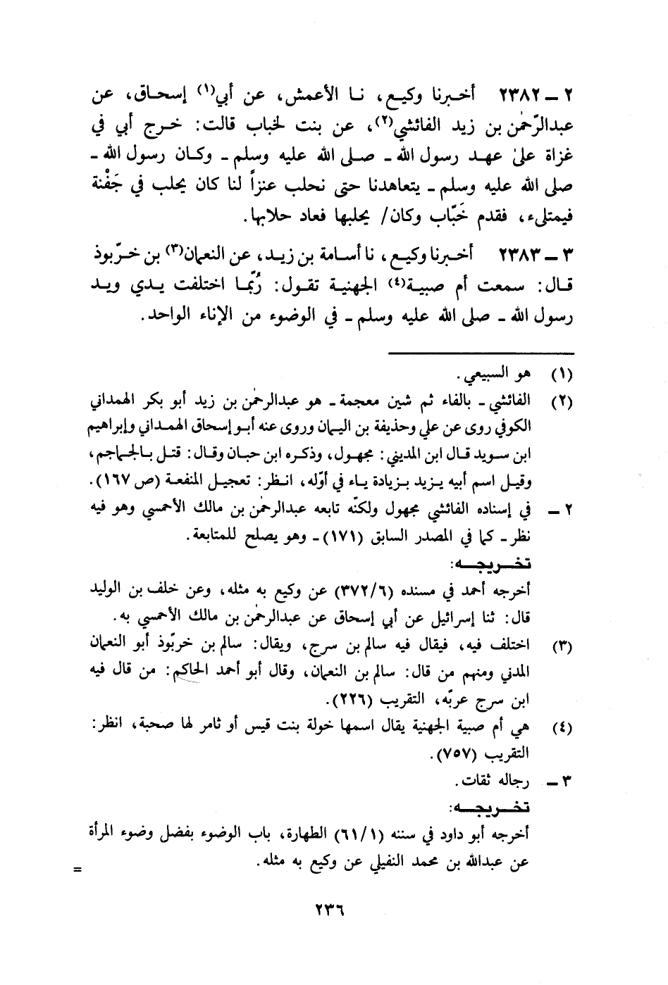 2383 - أَخْبَرَنَا وَكِيعٌ، نا أُسَامَةُ بْنُ زَيْدٍ، عَنِ النُّعْمَانِ بْنِ خَرَّبُوذٍ قَالَ: سَمِعْتُ أُمَّ صُبَيَّةَ الْجُهَنِيَّةَ تَقُولُ: «§رُبَّمَا اخْتَلَفَتْ يَدِي وَيَدُ رَسُولُ اللَّهِ صَلَّى اللهُ عَلَيْهِ وَسَلَّمَ فِي الْوُضُوءِ مِنَ الْإِنَاءِ الْوَاحِدِ»