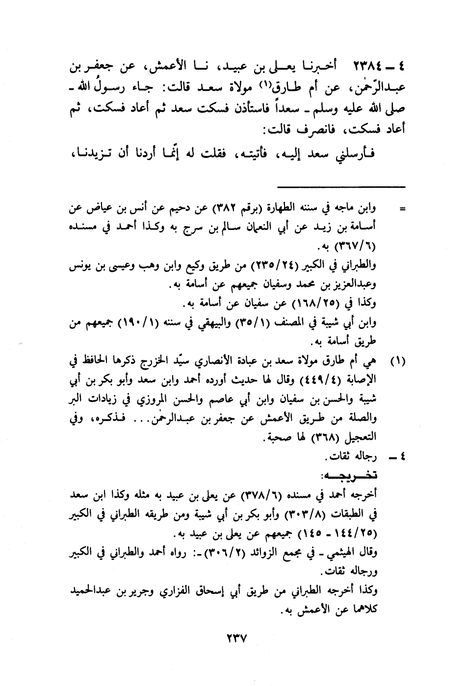 2384 - أَخْبَرَنَا يَعْلَى بْنُ عُبَيْدٍ، نا الْأَعْمَشُ، عَنْ جَعْفَرِ بْنِ عَبْدِ الرَّحْمَنِ، عَنْ أُمِّ طَارِقٍ مَوْلَاةِ سَعْدٍ قَالَتْ: جَاءَ رَسُولُ اللَّهِ صَلَّى اللهُ عَلَيْهِ وَسَلَّمَ سَعْدًا فَاسْتَأْذَنَ، فَسَكَتَ سَعْدٌ، ثُمَّ أَعَادَ فَسَكَتَ، ثُمَّ أَعَادَ فَسَكَتَ، فَانْصَرَفَ، قَالَتْ: فَأَرْسَلَنِي سَعْدٌ إِلَيْهِ، فَأَتَيْتُهُ، فَقُلْتُ لَهُ: إِنَّمَا أَرَدْنَا أَنْ تُزِيدَنَا -[238]-، فَسَمِعْتُ صَوْتًا بِالْبَابِ يَسْتَأْذِنُ وَلَا أَرَى شَيْئًا، فَقَالَ رَسُولُ اللَّهِ صَلَّى اللهُ عَلَيْهِ وَسَلَّمَ: «مَنْ أَنْتِ؟» فَقَالَتْ: أَنَا أُمُّ مُلْدَمٍ، فَقَالَ: «§لَا مَرْحَبًا بِكِ، وَلَا أَهْلًا أَتُهْدِينَ إِلَيَّ قُبَاءً؟» ، قَالَتْ: نَعَمْ، فَقَالَ: «ائْتِيهِمْ»