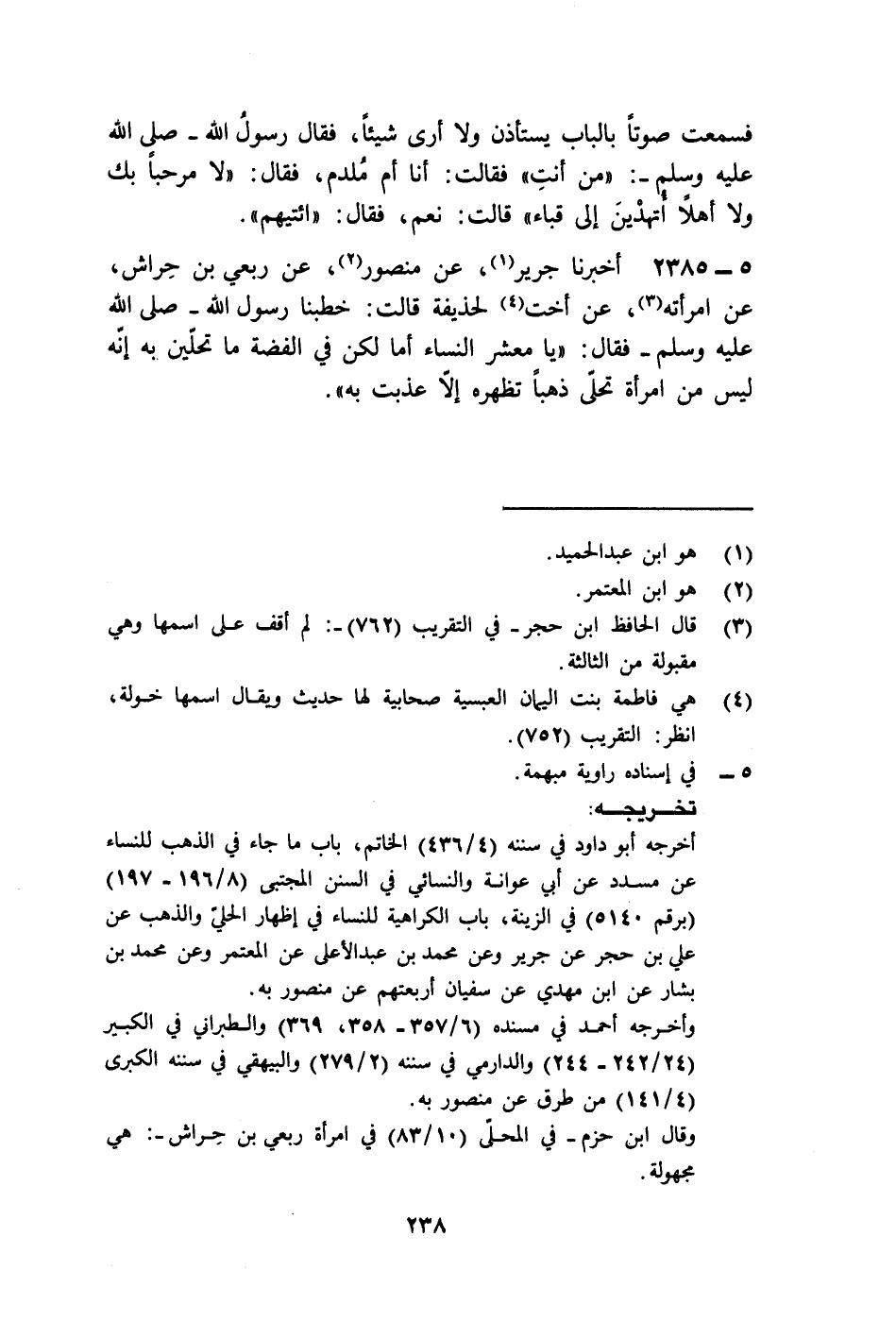 2385 - أَخْبَرَنَا جَرِيرٌ، عَنْ مَنْصُورٍ، عَنْ رِبْعِيِّ بْنِ حِرَاشٍ، عَنِ امْرَأَتِهِ، عَنْ أُخْتٍ لِحُذَيْفَةَ قَالَتْ: خَطَبَنَا رَسُولُ اللَّهِ صَلَّى اللهُ عَلَيْهِ وَسَلَّمَ، فَقَالَ: «يَا مَعْشَرَ النِّسَاءِ، §أَمَا لَكُنَّ فِي الْفِضَّةِ مَا تَحَلَّيْنَ بِهِ، إِنَّهُ لَيْسَ مِنَ امْرَأَةٍ تَحَلَّى ذَهَبًا تُظْهِرُهُ إِلَّا عُذِّبَتْ بِهِ»