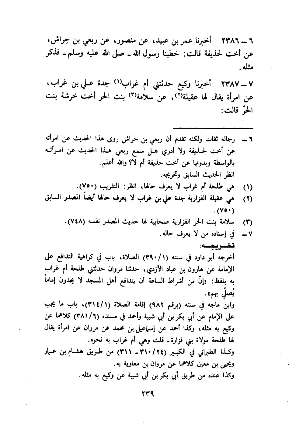 2387 - أَخْبَرَنَا وَكِيعٌ، حَدَّثَتْنِي أُمُّ غُرَابٍ جَدَّةُ عَلِيِّ بْنِ غُرَابٍ , عَنِ امْرَأَةٍ يُقَالُ لَهَا عَقِيلَةُ، عَنْ سَلَّامَةَ بِنْتِ الْحُرِّ أُخْتِ خَرَشَةَ بِنْتِ الْحُرِّ قَالَتْ -[240]-: سَمِعْتُ رَسُولَ اللَّهِ صَلَّى اللهُ عَلَيْهِ وَسَلَّمَ يَقُولُ: «يَأْتِي عَلَى النَّاسِ §زَمَانٌ يَمْكُثُونَ سَاعَةً لَا يَجِدُونَ إِمَامًا يُصَلِّي بِهِمْ»