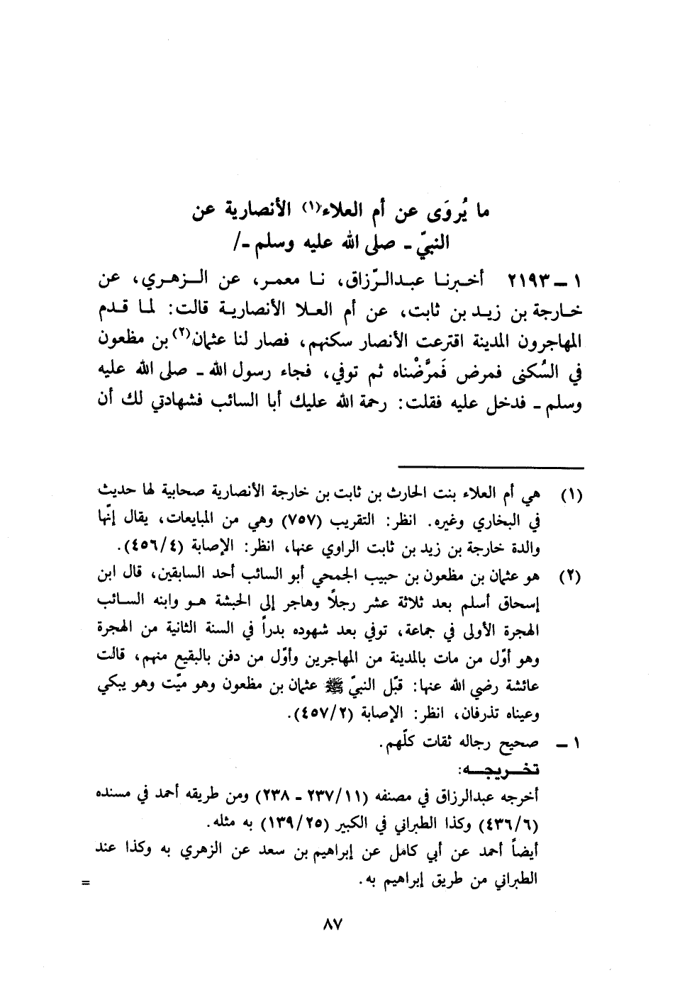 2193 - أَخْبَرَنَا عَبْدُ الرَّزَّاقِ، نا مَعْمَرٌ، عَنِ الزُّهْرِيِّ، عَنْ خَارِجَةَ بْنِ زَيْدِ بْنِ ثَابِتٍ، عَنْ أُمِّ الْعُلَا الْأَنْصَارِيَّةِ قَالَتْ: لَمَّا قَدِمَ الْمُهَاجِرُونَ الْمَدِينَةَ اقْتَرَعَتِ الْأَنْصَارُ سُكْنَهُمْ , فَصَارَ لَنَا عُثْمَانُ بْنُ مَظْعُونٍ فِي السُّكْنَى , فَمَرِضَ فَمَرَّضْنَاهُ , ثُمَّ تُوُفِّيَ , فَجَاءَ رَسُولُ اللَّهِ صَلَّى اللهُ عَلَيْهِ وَسَلَّمَ فَدَخَلَ عَلَيْهِ , فَقُلْتُ: رَحْمَةُ اللَّهُ عَلَيْكَ أَبَا السَّائِبِ , فَشَهَادَتِي لَكَ أَنْ -[88]- قَدْ أَكْرَمَكَ اللَّهُ , فَقَالَ رَسُولُ اللَّهِ صَلَّى اللهُ عَلَيْهِ وَسَلَّمَ: «§وَمَا يُدْرِيكِ أَنَّ اللَّهَ قَدْ أَكْرَمَهُ؟» قَالَتْ: فَقُلْتُ: لَا أَدْرِي وَاللَّهِ , فَقَالَ رَسُولُ اللَّهِ صَلَّى اللهُ عَلَيْهِ وَسَلَّمَ: «أَمَّا هُوَ فَقَدْ أَتَاهُ الْيَقِينُ مِنْ رَبِّهِ , وَإِنِّي لَأَرْجُو لَهُ الْخَيْرَ وَاللَّهِ لَا أَدْرِي وَأَنَا رَسُولُ اللَّهِ مَاذَا يُفْعَلُ بِهِ وَبِكُمْ» , قَالَتْ: فَوَاللَّهِ لَا أُزَكِّي أَحَدًا بَعْدَهُ أَبَدًا , ثُمَّ رَأَيْتُ لِعُثْمَانَ فِي النَّوْمِ عَيْنًا يَجْرِي فَقَصَصْتُهَا عَلَى رَسُولِ اللَّهِ صَلَّى اللهُ عَلَيْهِ وَسَلَّمَ فَقَالَ: «ذَاكَ عَمَلُهُ»