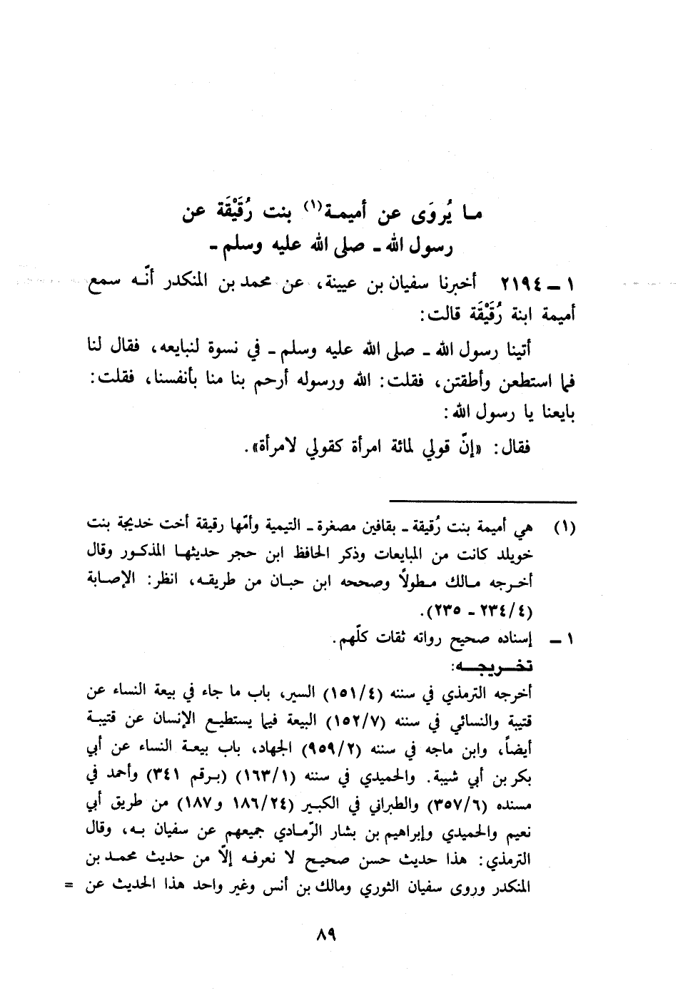 2194 - أَخْبَرَنَا سُفْيَانُ بْنُ عُيَيْنَةَ، عَنْ مُحَمَّدِ بْنِ الْمُنْكَدِرِ أَنَّهُ سَمِعَ أُمَيْمَةَ ابْنَةَ رُقَيْقَةَ قَالَتْ: أَتَيْنَا رَسُولَ اللَّهِ صَلَّى اللهُ عَلَيْهِ وَسَلَّمَ فِي نِسْوَةٍ لِنُبَايِعَهُ فَقَالَ لَنَا: «فَمَا اسْتَطَعْنَ وَأَطَقْتُنَّ؟» فَقُلْتُ: اللَّهُ وَرَسُولُهُ أَرْحَمُ بِنَا مِنَّا بِأَنْفُسِنَا , فَقُلْتُ: بَايِعْنَا يَا رَسُولَ اللَّهِ , فَقَالَ: «§إِنَّ قَوْلِي لِمِائَةِ امْرَأَةٍ كَقَوْلِي لِامْرَأَةٍ»