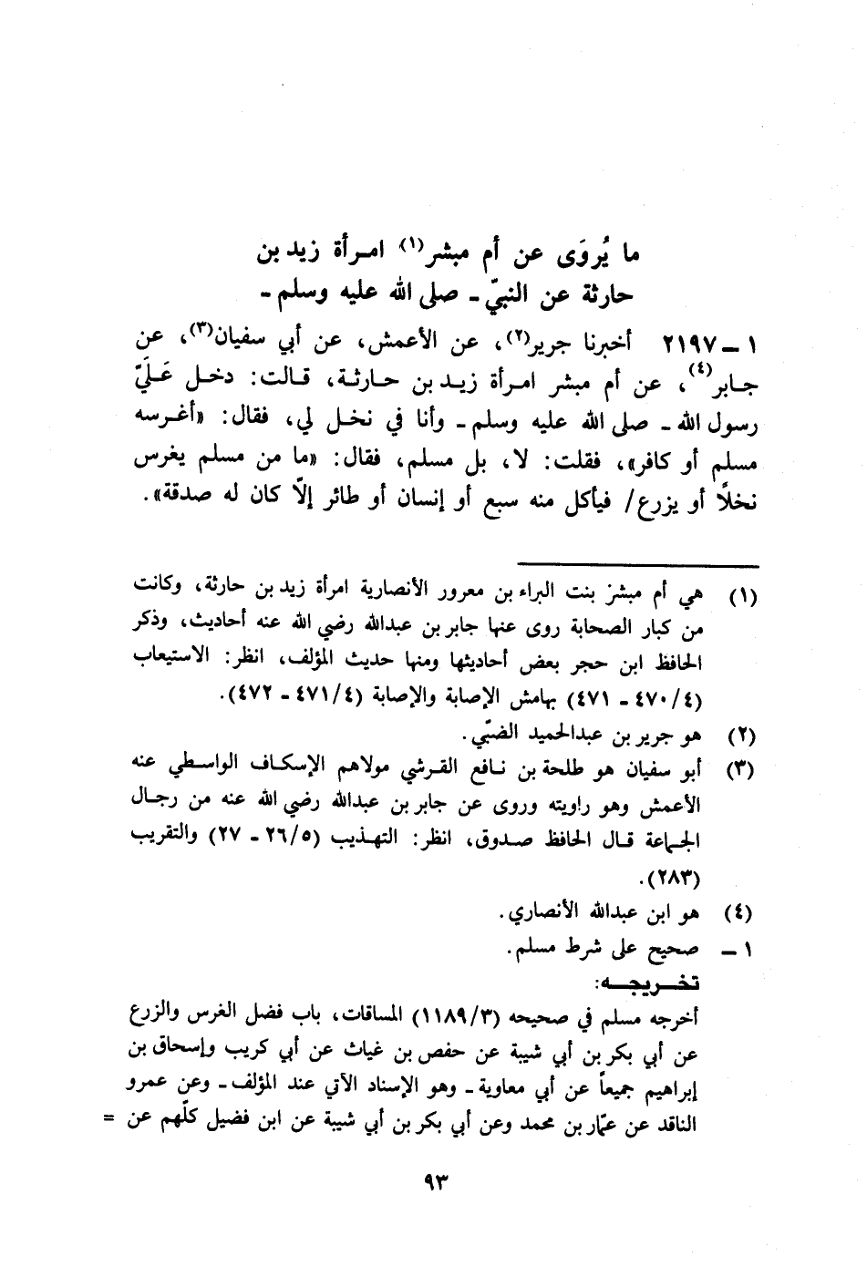 2197 - أَخْبَرَنَا جَرِيرٌ، عَنِ الْأَعْمَشِ، عَنْ أَبِي سُفْيَانَ، عَنْ جَابِرٍ، عَنْ أُمِّ مُبَشِّرٍ امْرَأَةِ زَيْدِ بْنِ حَارِثَةَ قَالَتْ: دَخَلَ عَلَيَّ رَسُولُ اللَّهِ صَلَّى اللهُ عَلَيْهِ وَسَلَّمَ وَأَنَا فِي نَخْلٍ لِي , فَقَالَ: «§أَغَرَسَهُ مُسْلِمٌ أَوْ كَافِرٌ؟» فَقُلْتُ: لَا , بَلْ مُسْلِمٌ , فَقَالَ: «مَا مِنْ مُسْلِمٍ يَغْرِسُ نَخْلًا أَوْ يَزْرَعُ فَيَأْكُلُ مِنْهُ سَبْعٌ أَوْ إِنْسَانٌ أَوْ طَائِرٌ إِلَّا كَانَ لَهُ صَدَقَةٌ»