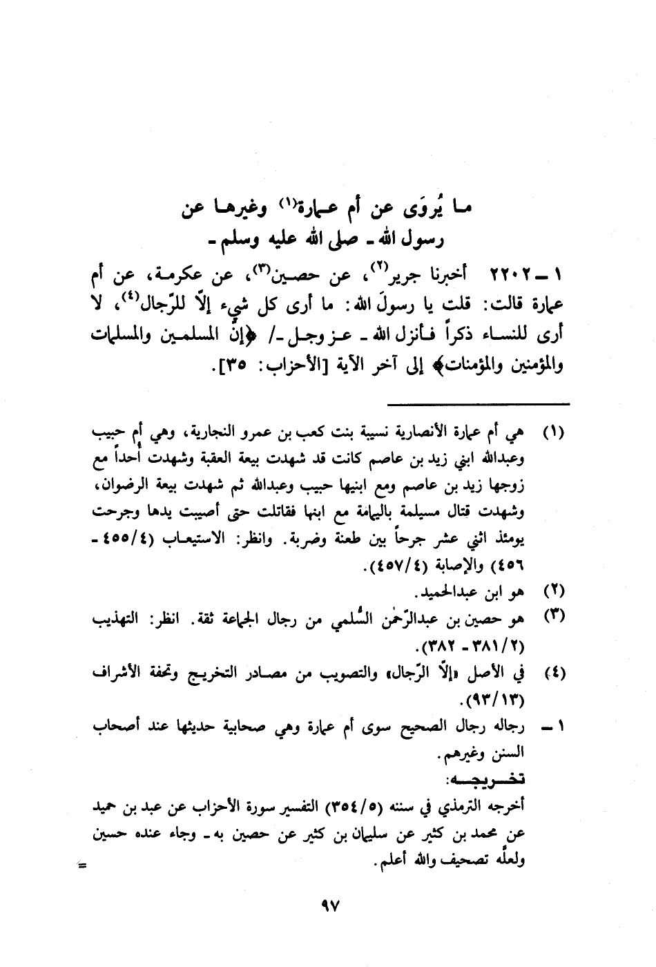 2202 - أَخْبَرَنَا جَرِيرٌ، عَنْ حُصَيْنٍ، عَنْ عِكْرِمَةَ، عَنْ أُمِّ عُمَارَةَ قَالَتْ: قُلْتُ: يَا رَسُولَ اللَّهِ , §مَا أَرَى كُلَّ شَيْءٍ إِلَّا لِلرِّجَالِ , لَا أَرَى لِلنِّسَاءِ ذِكْرًا , فَأَنْزَلَ اللَّهُ عَزَّ وَجَلَّ: {إِنَّ الْمُسْلِمِينَ وَالْمُسْلِمَاتِ وَالْمُؤْمِنِينَ وَالْمُؤْمِنَاتِ} [الأحزاب: 35] إِلَى آخِرِ الْآيَةِ "