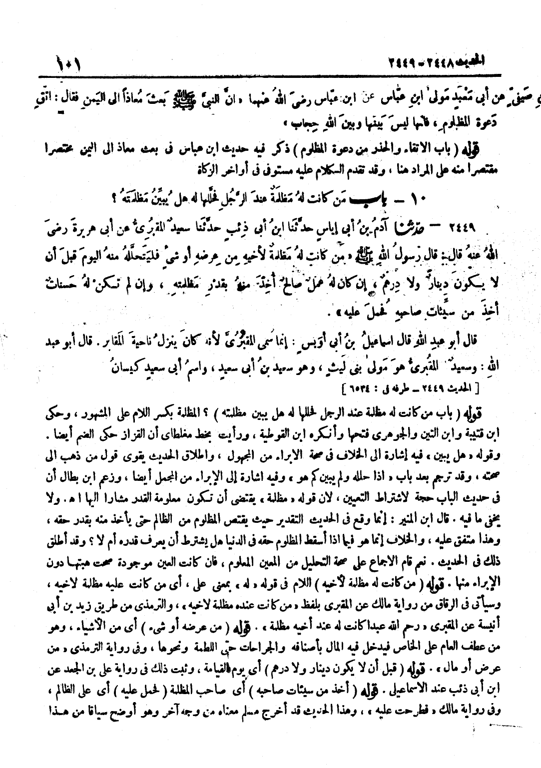 [2449] قَوْلَهُ مَظْلِمَةٌ يَقْتَضِي أَنْ تَكُونَ مَعْلُومَةَ الْقَدْرِ مُشَارًا إِلَيْهَا أه وَلَا يَخْفَى مَا فِيهِ قَالَ بن الْمُنِيرِ إِنَّمَا وَقَعَ فِي الْحَدِيثِ التَّقْدِيرُ حَيْثُ يَقْتَصُّ الْمَظْلُومُ مِنَ الظَّالِمِ حَتَّى يَأْخُذَ مِنْهُ بِقَدْرِ حَقِّهِ وَهَذَا مُتَّفَقٌ عَلَيْهِ وَالْخِلَافُ إِنَّمَا هُوَ فِيمَا إِذَا أَسْقَطَ الْمَظْلُومُ حَقَّهُ فِي الدُّنْيَا هَلْ يُشْتَرَطُ أَنْ يَعْرِفَ قَدْرَهُ أَمْ لَا وَقَدْ أُطْلِقَ ذَلِكَ فِي الْحَدِيثِ نَعَمْ قَامَ الْإِجْمَاعُ عَلَى صِحَّةِ التَّحْلِيلِ مِنَ الْمُعَيَّنِ الْمَعْلُومِ فَإِنْ كَانَتِ الْعَيْنُ مَوْجُودَةً صَحَّتْ هِبَتُهَا دُونَ الْإِبْرَاءِ مِنْهَا قَوْلُهُ مَنْ كَانَتْ لَهُ مَظْلِمَةٌ لِأَخِيهِ اللَّامُ فِي قَوْلِهِ لَهُ بِمَعْنَى عَلَى أَيْ مَنْ كَانَتْ عَلَيْهِ مَظْلِمَةٌ لِأَخِيهِ وَسَيَأْتِي فِي الرِّقَاقِ مِنْ رِوَايَةِ مَالِكٍ عَنِ الْمَقْبُرِيِّ بِلَفْظِ مَنْ كَانَتْ عِنْدَهُ مَظْلِمَةٌ لِأَخِيهِ وَالتِّرْمِذِيِّ مِنْ طَرِيقِ زَيْدِ بْنِ أَبِي أُنَيْسَةَ عَنِ الْمَقْبُرِيِّ رَحِمَ اللَّهُ عَبْدًا كَانَتْ لَهُ عِنْدَ أَخِيهِ مَظْلِمَةٌ قَوْلُهُ مِنْ عِرْضِهِ أَوْ شَيْءٍ أَيْ مِنَ الْأَشْيَاءِ وَهُوَ مِنْ عَطْفِ الْعَامِّ عَلَى الْخَاصِّ فَيَدْخُلُ فِيهِ الْمَالُ بِأَصْنَافِهِ وَالْجِرَاحَاتُ حَتَّى اللَّطْمَةُ وَنَحْوُهَا وَفِي رِوَايَةِ التِّرْمِذِيِّ مِنْ عِرْضٍ أَوْ مَالٍ قَوْلُهُ قَبْلَ أَنْ لَا يَكُونَ دِينَارٌ وَلَا دِرْهَمٌ أَيْ يَوْمَ الْقِيَامَةِ وَثَبَتَ ذَلِكَ فِي رِوَايَةِ عَلِيِّ بْنِ الْجَعْد عَن بن أَبِي ذِئْبٍ عِنْدَ الْإِسْمَاعِيلِيِّ قَوْلُهُ أُخِذَ مِنْ سَيِّئَاتِ صَاحِبِهِ أَيْ صَاحِبِ الْمَظْلِمَةِ فَحُمِلَ عَلَيْهِ أَيْ عَلَى الظَّالِمِ وَفِي رِوَايَةِ مَالِكٍ فَطُرِحَتْ عَلَيْهِ وَهَذَا الْحَدِيثُ قَدْ أَخْرَجَ مُسْلِمٌ مَعْنَاهُ مِنْ وَجْهٍ آخَرَ وَهُوَ أَوْضَحُ سِيَاقًا مِنْ هَذَا