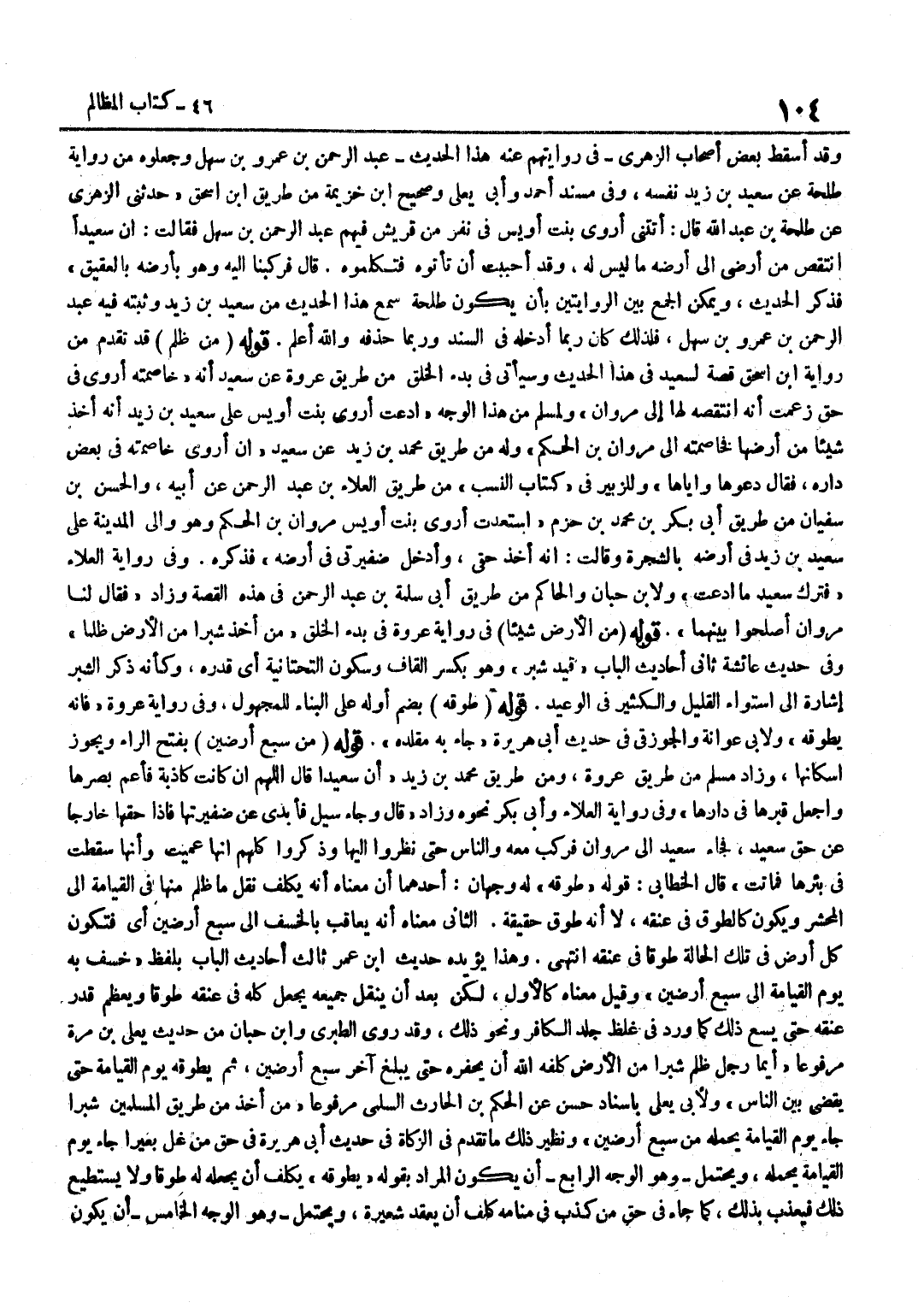 وَقَدْ أَسْقَطَ بَعْضُ أَصْحَابِ الزُّهْرِيِّ فِي رِوَايَتِهِمْ عَنْهُ هَذَا الْحَدِيثَ عَبْدَ الرَّحْمَنِ بْنَ عَمْرِو بْنِ سَهْلٍ وَجَعَلُوهُ مِنْ رِوَايَةِ طَلْحَةَ عَنْ سَعِيدِ بْنِ زَيْدٍ نَفْسِهِ وَفِي مُسْنَدِ أَحْمَدَ وَأبي يعلى وصحيح بن خُزَيْمَة من طَرِيق بن إِسْحَاقَ حَدَّثَنِي الزُّهْرِيُّ عَنْ طَلْحَةَ بْنِ عَبْدِ اللَّهِ قَالَ أَتَتْنِي أَرْوَى بِنْتُ أُوَيْسٍ فِي نَفَرٍ مِنْ قُرَيْشٍ فِيهِمْ عَبْدُ الرَّحْمَنِ بْنُ سَهْلٍ فَقَالَتْ إِنَّ سَعِيدًا انْتَقَصَ مِنْ أَرْضِي إِلَى أَرْضِهِ مَا لَيْسَ لَهُ وَقَدْ أَحْبَبْتُ أَنْ تَأْتُوهُ فَتُكَلِّمُوهُ قَالَ فَرَكِبْنَا إِلَيْهِ وَهُوَ بِأَرْضِهِ بِالْعَقِيقِ فَذَكَرَ الْحَدِيثَ وَيُمْكِنُ الْجَمْعُ بَيْنَ الرِّوَايَتَيْنِ بِأَنْ يَكُونَ طَلْحَةُ سَمِعَ هَذَا الْحَدِيثَ مِنْ سَعِيدِ بْنِ زَيْدٍ وَثَبَّتَهُ فِيهِ عَبْدُ الرَّحْمَنِ بْنُ عَمْرِو بْنِ سَهْلٍ فَلِذَلِكَ كَانَ رُبَّمَا أَدْخَلَهُ فِي السَّنَدِ وَرُبَّمَا حَذَفَهُ وَاللَّهُ أَعْلَمُ قَوْلُهُ مَنْ ظَلَمَ قَدْ تَقَدَّمَ مِنْ رِوَايَة بن إِسْحَاقَ قِصَّةٌ لِسَعِيدٍ فِي هَذَا الْحَدِيثِ وَسَيَأْتِي فِي بَدْءِ الْخَلْقِ مِنْ طَرِيقِ عُرْوَةَ عَنْ سَعِيدٍ أَنَّهُ خَاصَمَتْهُ أَرْوَى فِي حَقٍّ زَعَمَتْ أَنَّهُ انْتَقَصَهُ لَهَا إِلَى مَرْوَانَ وَلِمُسْلِمٍ مِنْ هَذَا الْوَجْهِ ادَّعَتْ أَرْوَى بِنْتُ أُوَيْسٍ عَلَى سَعِيدِ بْنِ زَيْدٍ أَنَّهُ أَخَذَ شَيْئًا مِنْ أَرْضِهَا فَخَاصَمَتْهُ إِلَى مَرْوَانَ بْنِ الْحَكَمِ وَلَهُ مِنْ طَرِيقِ مُحَمَّدِ بْنِ زَيْدٍ عَنْ سَعِيدٍ أَنَّ أَرْوَى خَاصَمَتْهُ فِي بَعْضِ دَارِهِ فَقَالَ دَعُوهَا وَإِيَّاهَا وَلِلزُّبَيْرِ فِي كِتَابِ النَّسَبِ مِنْ طَرِيقِ الْعَلَاءِ بْنِ عَبْدِ الرَّحْمَنِ عَنْ أَبِيهِ وَالْحَسَنِ بْنِ سُفْيَانَ مِنْ طَرِيقِ أَبِي بَكْرِ بْنِ مُحَمَّدِ بْنِ حَزْمٍ اسْتَعْدَتْ أَرْوَى بِنْتُ أُوَيْسٍ مَرْوَانَ بْنَ الْحَكَمِ وَهُوَ وَالِي الْمَدِينَةِ عَلَى سَعِيدِ بْنِ زَيْدٍ فِي أَرْضِهِ بِالشَّجَرَةِ وَقَالَتْ إِنَّهُ أَخَذَ حَقِّي وَأَدْخَلَ ضَفِيرَتِي فِي أَرْضِهِ فَذَكَرَهُ وَفِي رِوَايَةِ الْعَلَاءِ فَتَرَكَ سَعِيدٌ مَا ادَّعَتْ وَلِابْنِ حِبَّانَ وَالْحَاكِمِ مِنْ طَرِيقِ أَبِي سَلَمَةَ بْنِ عَبْدِ الرَّحْمَنِ فِي هَذِهِ الْقِصَّةِ وَزَادَ فَقَالَ لَنَا مَرْوَانُ أَصْلِحُوا بَيْنَهُمَا قَوْلُهُ مِنَ الْأَرْضِ شَيْئًا فِي رِوَايَةِ عُرْوَةَ فِي بَدْءِ الْخَلْقِ مَنْ أَخَذَ شِبْرًا مِنَ الْأَرْضِ ظُلْمًا وَفِي حَدِيثِ عَائِشَةَ ثَانِيَ أَحَادِيثِ الْبَابِ قِيدَ شِبْرٍ وَهُوَ بِكَسْرِ الْقَافِ وَسُكُونِ التَّحْتَانِيَّةِ أَيْ قَدْرَهُ وَكَأَنَّهُ ذَكَرَ الشِّبْرَ إِشَارَةً إِلَى اسْتِوَاءِ الْقَلِيلِ وَالْكَثِيرِ فِي الْوَعِيدِ قَوْلُهُ طُوِّقَهُ بِضَمِّ أَوَّلِهِ عَلَى الْبِنَاءِ لِلْمَجْهُولِ وَفِي رِوَايَةِ عُرْوَةَ فَإِنَّهُ يُطَوَّقُهُ وَلِأَبِي عَوَانَةَ وَالْجَوْزَقِيِّ فِي حَدِيثِ أَبِي هُرَيْرَةَ جَاءَ بِهِ مُقَلَّدَهُ قَوْلُهُ مِنْ سَبْعِ أَرَضِينَ بِفَتْحِ الرَّاءِ وَيَجُوزُ إِسْكَانُهَا وَزَادَ مُسْلِمٌ مِنْ طَرِيقِ عُرْوَةَ وَمِنْ طَرِيقِ مُحَمَّدِ بْنِ زَيْدٍ أَنَّ سَعِيدًا قَالَ اللَّهُمَّ إِنْ كَانَتْ كَاذِبَةً فَأَعْمِ بَصَرَهَا وَاجْعَلْ قَبْرَهَا فِي دَارِهَا وَفِي رِوَايَةِ الْعَلَاءِ وَأَبِي بَكْرٍ نَحْوُهُ وَزَادَ قَالَ وَجَاءَ سَيْلٌ فَأَبْدَى عَنْ ضَفِيرَتِهَا فَإِذَا حَقُّهَا خَارِجًا عَنْ حَقِّ سَعِيدٍ فَجَاءَ سَعِيدٌ إِلَى مَرْوَانَ فَرَكِبَ مَعَهُ وَالنَّاسُ حَتَّى نَظَرُوا إِلَيْهَا وَذَكَرُوا كُلُّهُمْ أَنَّهَا عَمِيَتْ وَأَنَّهَا سَقَطَت