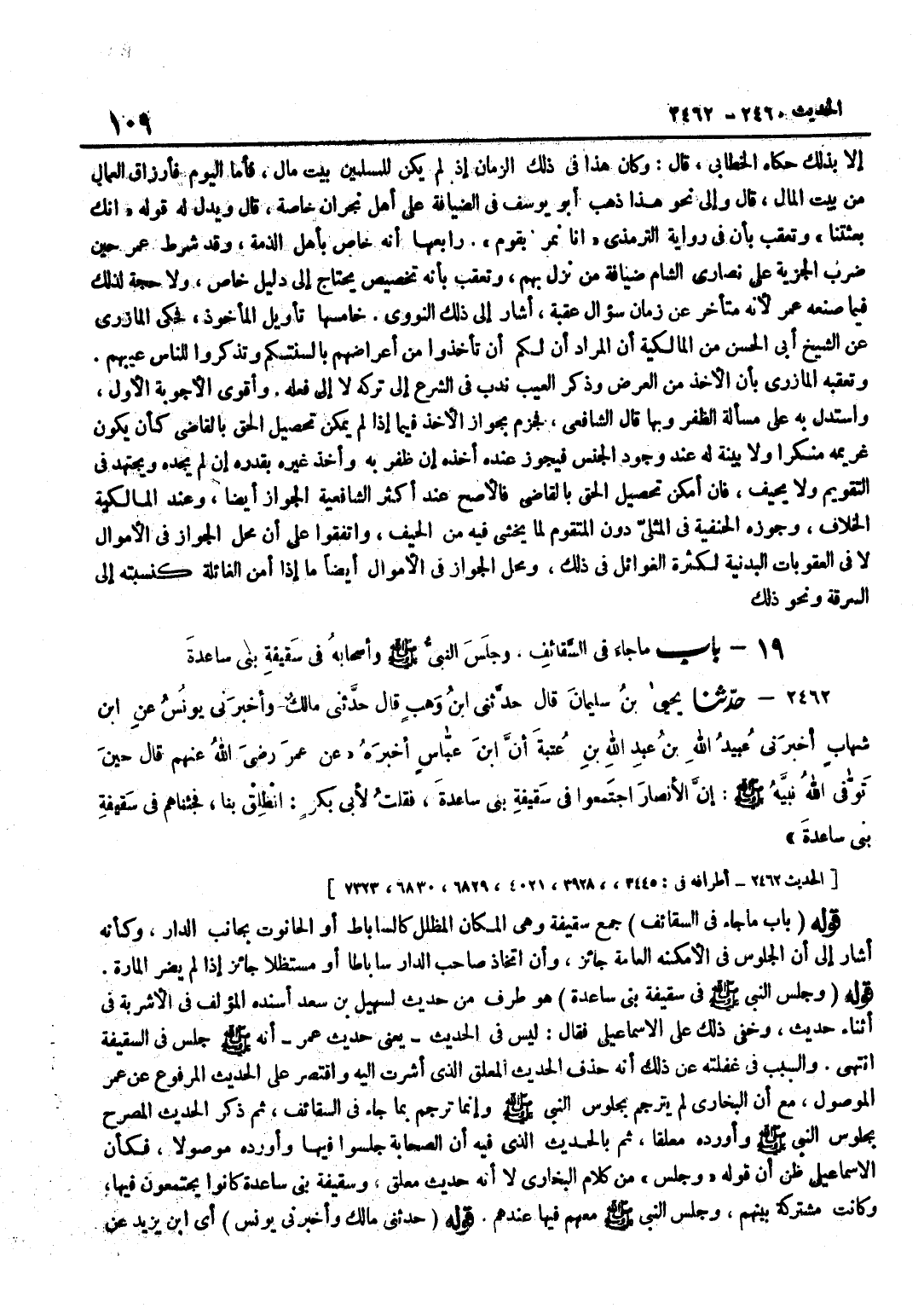 [2462] قَوْلُهُ حَدَّثَنِي مَالِكٌ وَأَخْبَرَنِي يُونُسُ أَي بن يزِيد عَن بن شِهَابٍ يَعْنِي أَنَّ كُلًّا مِنْهُمَا رَوَاهُ لِابْنِ وهب عَن بن شهَاب وَكَانَ بن وَهْبٍ حَرِيصًا عَلَى التَّفْرِقَةِ بَيْنَ التَّحْدِيثِ وَالْإِخْبَارِ مُرَاعَاةً لِلِاصْطِلَاحِ وَيُقَالُ إِنَّهُ أَوَّلُ مَنِ اصْطَلَحَ عَلَى ذَلِكَ بِمِصْرَ قَوْلُهُ إِنَّ الْأَنْصَارَ اجْتَمَعُوا فِي سَقِيفَةِ بَنِي سَاعِدَةَ هُوَ مُخْتَصَرٌ مِنْ قِصَّةِ بَيْعَةِ أَبِي بَكْرٍ الصِّدِّيقِ وَسَيَأْتِي فِي الْهِجْرَةِ وَفِي كِتَابِ الْحُدُودِ بِطُولِهِ وَنَسْتَوْفِي شَرْحَهُ هُنَاكَ إِنْ شَاءَ اللَّهُ تَعَالَى وَالْغَرَضُ مِنْهُ أَنَّ الصَّحَابَةَ اسْتَمَرُّوا عَلَى الْجُلُوسِ فِي السَّقِيفَةِ الْمَذْكُورَةِ وَقَالَ الْكَرْمَانِيُّ مُطَابَقَةُ الْحَدِيثِ لِلتَّرْجَمَةِ أَنَّ الْجُلُوس فِي السَّقِيفَة الْعَامَّة لَيْسَ ظلما