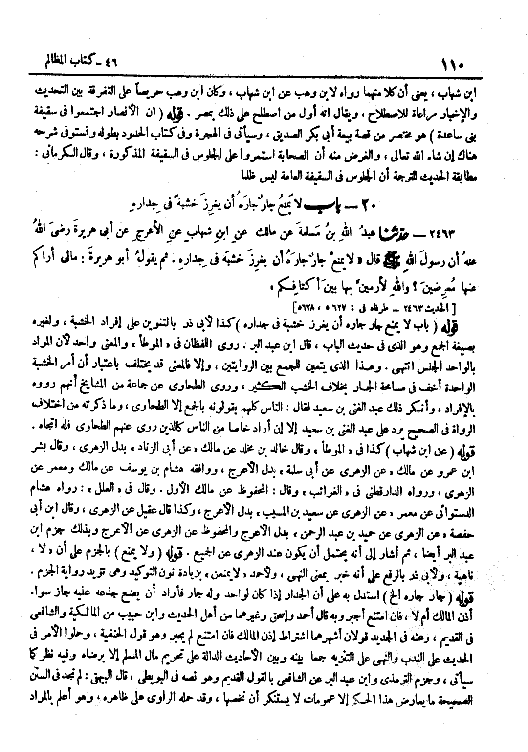 [2463] قَوْلُهُ عَنِ بن شِهَابٍ كَذَا فِي الْمُوَطَّأِ وَقَالَ خَالِدُ بْنُ مَخْلَدٍ عَنْ مَالِكٍ عَنْ أَبِي الزِّنَادِ بَدَلَ الزُّهْرِيِّ وَقَالَ بِشْرُ بْنُ عَمْرٍو عَنْ مَالِكٍ عَنِ الزُّهْرِيِّ عَنْ أَبِي سَلَمَةَ بَدَلَ الْأَعْرَجِ وَوَافَقَهُ هِشَامُ بْنُ يُوسُفَ عَنْ مَالِكٍ وَمَعْمَرٌ عَنِ الزُّهْرِيِّ وَرَوَاهُ الدَّارَقُطْنِيُّ فِي الْغَرَائِبِ وَقَالَ الْمَحْفُوظُ عَنْ مَالِكٍ الْأَوَّلُ وَقَالَ فِي الْعِلَلِ رَوَاهُ هِشَامٌ الدَّسْتُوَائِيُّ عَنْ مَعْمَرٍ عَنِ الزُّهْرِيِّ عَنْ سَعِيدِ بْنِ الْمُسَيَّبِ بَدَلَ الْأَعْرَجِ وَكَذَا قَالَ عقيل عَن الزُّهْرِيّ وَقَالَ بن أَبِي حَفْصَةَ عَنِ الزُّهْرِيِّ عَنْ حُمَيْدِ بْنِ عَبْدِ الرَّحْمَنِ بَدَلَ الْأَعْرَجِ وَالْمَحْفُوظُ عَنِ الزُّهْرِيِّ عَن الْأَعْرَج وَبِذَلِك جزم بن عَبْدِ الْبَرِّ أَيْضًا ثُمَّ أَشَارَ إِلَى أَنَّهُ يُحْتَمَلُ أَنْ يَكُونَ عِنْدَ الزُّهْرِيِّ عَنِ الْجَمِيعِ قَوْلُهُ وَلَا يَمْنَعْ بِالْجَزْمِ عَلَى أَنَّ لَا نَاهِيَةٌ وَلِأَبِي ذَرٍّ بِالرَّفْعِ عَلَى أَنَّهُ خَبَرٌ بِمَعْنَى النَّهْيِ وَلِأَحْمَدَ لَا يَمْنَعَنَّ بِزِيَادَةِ نُونِ التَّوْكِيدِ وَهِيَ تُؤَيِّدُ رِوَايَةَ الْجَزْمِ قَوْلُهُ جَارٌ جَارَهُ إِلَخْ اسْتُدِلَّ بِهِ عَلَى أَنَّ الْجِدَارَ إِذَا كَانَ لِوَاحِدٍ وَلَهُ جَارٌ فَأَرَادَ أَنْ يَضَعَ جِذْعَهُ عَلَيْهِ جَازَ سَوَاءٌ أَذِنَ الْمَالِكُ أَمْ لَا فَإِنِ امْتَنَعَ أُجْبِرَ وَبِهِ قَالَ أَحْمد وَإِسْحَاق وَغَيرهمَا من أهل الحَدِيث وبن حَبِيبٍ مِنَ الْمَالِكِيَّةِ وَالشَّافِعِيُّ فِي الْقَدِيمِ وَعَنْهُ فِي الْجَدِيدِ قَوْلَانِ أَشْهَرُهُمَا اشْتِرَاطُ إِذْنِ الْمَالِكِ فَإِنِ امْتَنَعَ لَمْ يُجْبَرْ وَهُوَ قَوْلُ الْحَنَفِيَّةِ وَحَمَلُوا الْأَمْرَ فِي الْحَدِيثِ عَلَى النَّدْبِ وَالنَّهْيَ عَلَى التَّنْزِيهِ جَمْعًا بَيْنَهُ وَبَيْنَ الْأَحَادِيثِ الدَّالَّةِ عَلَى تَحْرِيمِ مَالِ الْمُسْلِمِ إِلَّا بِرِضَاهُ وَفِيهِ نظر كَمَا سَيَأْتِي وَجزم التِّرْمِذِيّ وبن عَبْدِ الْبَرِّ عَنِ الشَّافِعِيِّ بِالْقَوْلِ الْقَدِيمِ وَهُوَ نَصُّهُ فِي الْبُوَيْطِيِّ قَالَ الْبَيْهَقِيُّ لَمْ نَجِدْ فِي السُّنَنِ الصَّحِيحَةِ مَا يُعَارِضُ هَذَا الْحُكْمَ إِلَّا عُمُومَاتٍ لَا يُسْتَنْكَرُ أَنْ نَخُصَّهَا وَقَدْ حَمَلَهُ الرَّاوِي عَلَى ظَاهِرِهِ وَهُوَ أَعْلَمُ بِالْمُرَادِ