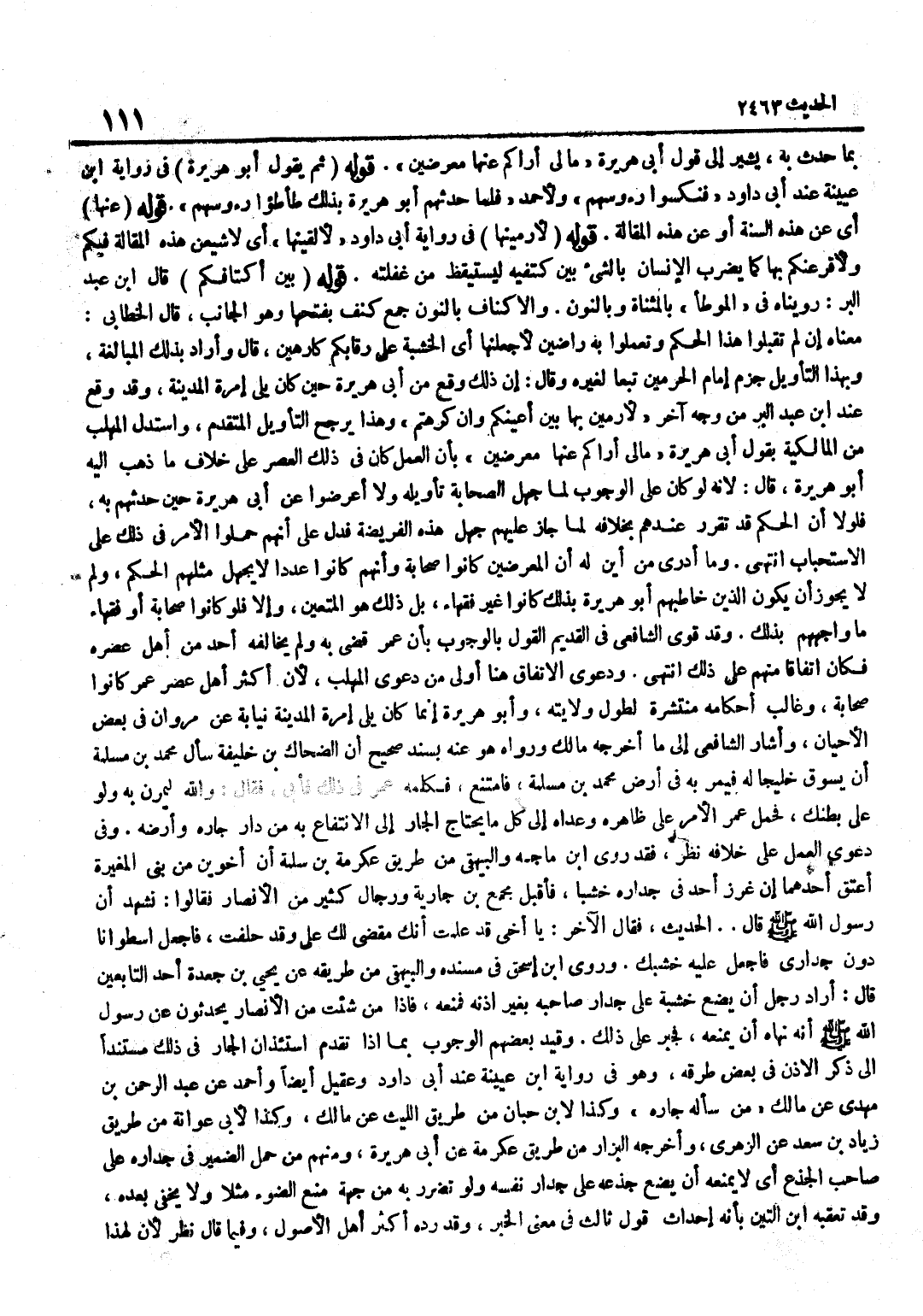 بِمَا حَدَّثَ بِهِ يُشِيرُ إِلَى قَوْلِ أَبِي هُرَيْرَةَ مَا لِي أَرَاكُمْ عَنْهَا مُعْرِضِينَ قَوْلُهُ ثمَّ يَقُول أَبُو هُرَيْرَة فِي رِوَايَة بن عُيَيْنَة عِنْد أبي دَاوُد فنكسوا رؤوسهم وَلأَحْمَد فَلَمَّا حَدثهمْ أَبُو هُرَيْرَة بذلك طأطؤا رؤوسهم قَوْلُهُ عَنْهَا أَيْ عَنْ هَذِهِ السُّنَّةِ أَوْ عَنْ هَذِهِ الْمَقَالَةِ قَوْلُهُ لَأَرْمِيَنَّهَا فِي رِوَايَةِ أَبِي دَاوُدَ لَأُلْقِيَنَّهَا أَيْ لَأُشِيعَنَّ هَذِهِ الْمَقَالَةَ فِيكُمْ وَلَأُقَرِّعَنَّكُمْ بِهَا كَمَا يُضْرَبُ الْإِنْسَانُ بِالشَّيْءِ بَيْنَ كَتِفَيْهِ لِيَسْتَيْقِظَ مِنْ غَفْلَتِهِ قَوْلُهُ بَيْنَ أكتافكم قَالَ بن عَبْدِ الْبَرِّ رُوِّينَاهُ فِي الْمُوَطَّأِ بِالْمُثَنَّاةِ وَبِالنُّونِ وَالْأَكْنَافُ بِالنُّونِ جَمْعُ كَنَفٍ بِفَتْحِهَا وَهُوَ الْجَانِبُ قَالَ الْخَطَّابِيُّ مَعْنَاهُ إِنْ لَمْ تَقْبَلُوا هَذَا الْحُكْمَ وَتَعْمَلُوا بِهِ رَاضِينَ لَأَجْعَلَنَّهَا أَيِ الْخَشَبَةَ عَلَى رِقَابِكُمْ كَارِهِينَ قَالَ وَأَرَادَ بِذَلِكَ الْمُبَالَغَةَ وَبِهَذَا التَّأْوِيلِ جَزَمَ إِمَامُ الْحَرَمَيْنِ تَبَعًا لِغَيْرِهِ وَقَالَ إِنَّ ذَلِكَ وَقَعَ مِنْ أَبِي هُرَيْرَةَ حِينَ كَانَ يَلِي إِمْرَةَ الْمَدِينَةِ وَقَدْ وَقَعَ عِنْد بن عَبْدِ الْبَرِّ مِنْ وَجْهٍ آخَرَ لَأَرْمِيَنَّ بِهَا بَيْنَ أَعْيُنِكُمْ وَإِنْ كَرِهْتُمْ وَهَذَا يُرَجِّحُ التَّأْوِيلَ الْمُتَقَدِّمَ وَاسْتَدَلَّ الْمُهَلَّبُ مِنَ الْمَالِكِيَّةِ بِقَوْلِ أَبِي هُرَيْرَة مَالِي أَرَاكُمْ عَنْهَا مُعْرِضِينَ بِأَنَّ الْعَمَلَ كَانَ فِي ذَلِكَ الْعَصْرِ عَلَى خِلَافِ مَا ذَهَبَ إِلَيْهِ أَبُو هُرَيْرَةَ قَالَ لِأَنَّهُ لَوْ كَانَ عَلَى الْوُجُوبِ لَمَا جَهِلَ الصَّحَابَةُ تَأْوِيلَهُ وَلَا أَعْرَضُوا عَنْ أَبِي هُرَيْرَةَ حِينَ حَدَّثَهُمْ بِهِ فَلَوْلَا أَنَّ الْحُكْمَ قَدْ تَقَرَّرَ عِنْدَهُمْ بِخِلَافِهِ لَمَا جَازَ عَلَيْهِمْ جَهْلُ هَذِهِ الْفَرِيضَةِ فَدَلَّ عَلَى أَنَّهُمْ حَمَلُوا الْأَمْرَ فِي ذَلِكَ عَلَى الِاسْتِحْبَابِ انْتَهَى وَمَا أَدْرِي مِنْ أَيْنَ لَهُ أَنَّ الْمُعْرِضِينَ كَانُوا صَحَابَةً وَأَنَّهُمْ كَانُوا عَدَدًا لَا يَجْهَلُ مِثْلُهُمُ الْحُكْمَ وَلِمَ لَا يَجُوزُ أَنْ يَكُونَ الَّذِينَ خَاطَبَهُمْ أَبُو هُرَيْرَةَ بِذَلِكَ كَانُوا غَيْرَ فُقَهَاءَ بَلْ ذَلِكَ هُوَ الْمُتَعَيَّنُ وَإِلَّا فَلَوْ كَانُوا صَحَابَةً أَوْ فُقَهَاءَ مَا وَاجَهَهُمْ بِذَلِكَ وَقَدْ قَوَّى الشَّافِعِيُّ فِي الْقَدِيمِ الْقَوْلَ بِالْوُجُوبِ بِأَنَّ عُمَرَ قَضَى بِهِ وَلَمْ يُخَالِفْهُ أَحَدٌ مِنْ أَهْلِ عَصْرِهِ فَكَانَ اتِّفَاقًا مِنْهُمْ عَلَى ذَلِكَ انْتَهَى وَدَعْوَى الِاتِّفَاقِ هُنَا أَوْلَى مِنْ دَعْوَى الْمُهَلَّبِ لِأَنَّ أَكْثَرَ أَهْلِ عَصْرِ عُمَرَ كَانُوا صَحَابَةً وَغَالِبَ أَحْكَامِهِ مُنْتَشِرَةٌ لِطُولِ وِلَايَتِهِ وَأَبُو هُرَيْرَةَ إِنَّمَا كَانَ يَلِي إِمْرَةَ الْمَدِينَةِ نِيَابَةً عَنْ مَرْوَانَ فِي بَعْضِ الْأَحْيَانِ وَأَشَارَ الشَّافِعِيُّ إِلَى مَا أَخْرَجَهُ مَالِكٌ وَرَوَاهُ هُوَ عَنْهُ بِسَنَدٍ صَحِيحٍ أَنَّ الضَّحَّاكَ بْنَ خَلِيفَةَ سَأَلَ مُحَمَّدَ بْنَ مَسْلَمَةَ أَنْ يَسُوقَ خَلِيجًا لَهُ فَيَمُرَّ بِهِ فِي أَرْضِ مُحَمَّدِ بن مسلمة فَامْتنعَ فَكَلَّمَهُ عُمَرُ فِي ذَلِكَ فَأَبَى فَقَالَ وَاللَّهُ لَيَمُرَّنَّ بِهِ وَلَوْ عَلَى بَطْنِكَ فَحَمَلَ عُمَرُ الْأَمْرَ عَلَى ظَاهِرِهِ وَعَدَّاهُ إِلَى كُلِّ مَا يَحْتَاجُ الْجَارُّ إِلَى الِانْتِفَاعِ بِهِ مِنْ دَارِ جَارِهِ وَأَرْضِهِ وَفِي دَعْوَى الْعَمَلِ عَلَى خِلَافِهِ نظر فقد روى بن مَاجَهْ وَالْبَيْهَقِيُّ مِنْ طَرِ