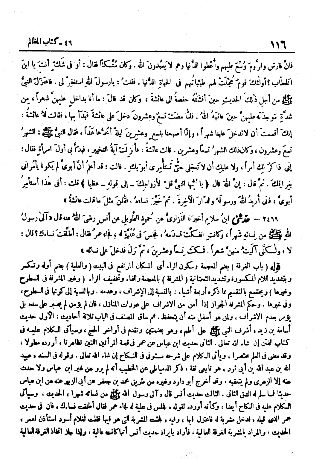 [2467] فِي السَّنَدِ عُبَيْدِ اللَّهِ بْنِ عَبْدِ اللَّهِ بْنِ أَبِي ثَوْر هُوَ تَابِعِيٌّ ثِقَةٌ ذَكَرَ الدِّمْيَاطِيُّ عَنِ الْخَطِيبِ أَنَّهُ لم يرو عَن غير بن عَبَّاسٍ وَلَا حَدَّثَ عَنْهُ إِلَّا الزُّهْرِيُّ وَلَمْ يَتَعَقَّبْهُ وَقَدْ أَخْرَجَ أَبُو دَاوُدَ وَغَيْرُهُ مِنْ طَرِيقِ مُحَمَّدِ بْنِ جَعْفَرٍ عَنْ أَبِي الزُّبَيْرِ عَنهُ عَن بن عَبَّاسٍ حَدِيثًا فَمَا سَلِمَ لَهُ الشِّقُّ الثَّانِي الثَّالِثُ حَدِيثُ أَنَسٍ قَالَ إِلَى رَسُولِ اللَّهِ صَلَّى اللَّهُ عَلَيْهِ وَسَلَّمَ مِنْ نِسَائِهِ شَهْرًا الْحَدِيثَ وَسَيَأْتِي الْكَلَامُ عَلَيْهِ فِي النِّكَاحِ أَيْضًا وَكَأَنَّهُ أَوْرَدَهُ لِقَوْلِهِ فَجَلَسَ فِي عُلِّيَّةٍ لَهُ فَجَاءَ عُمَرُ فَقَالَ أَطَلَّقْتَ نِسَاءَكَ فَإِنَّ فِي حَدِيثِ عُمَرَ الَّذِي قَبْلَهُ فَدَخَلَ مَشْرُبَةً لَهُ فَاعْتَزَلَ فِيهَا وَفِيهِ فَجِئْتُ الْمَشْرُبَةَ الَّتِي هُوَ فِيهَا فَقُلْتُ لِغُلَامٍ أَسْوَدَ اسْتَأْذِنْ لِعُمَرَ الْحَدِيثَ وَالْمُرَادُ بِالْمَشْرُبَةِ الْغُرْفَةُ الْعَالِيَةُ فَأَرَادَ بِإِيرَادِ حَدِيثِ أَنَسٍ أَنَّهَا كَانَتْ عَالِيَةً وَإِذَا جَازَ اتِّخَاذُ الغرفة الْعَالِيَة