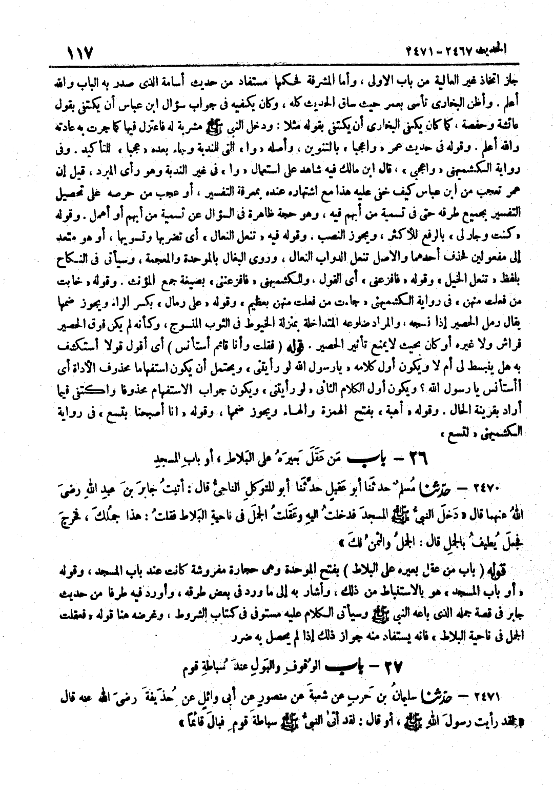 [2470] قَوْله فعقلت الْجَمَلَ فِي نَاحِيَةِ الْبَلَاطِ فَإِنَّهُ يُسْتَفَادُ مِنْهُ جَوَازُ ذَلِكَ إِذَا لَمْ يَحْصُلْ بِهِ ضَرَرٌ