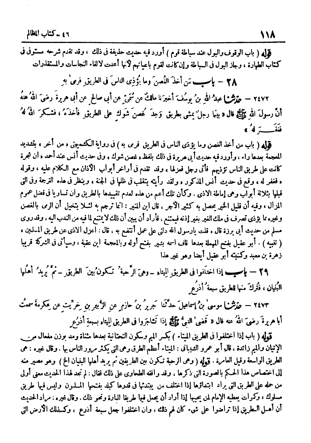 أَوْرَدَ فِيهِ حَدِيثَ حُذَيْفَةَ فِي ذَلِكَ وَقَدْ تَقَدَّمَ شَرْحُهُ مُسْتَوْفًى فِي كِتَابِ الطَّهَارَةِ وَجَازَ الْبَوْلُ فِي السُّبَاطَةِ وَإِنْ كَانَتْ لِقَوْمٍ بِأَعْيَانِهِمْ لِأَنَّهَا أعدت لالقاء النَّجَاسَات والمستقذرات قَوْلُهُ بَابُ مَنْ أَخَذَ الْغُصْنَ وَمَا يُؤْذِي النَّاسَ فِي الطَّرِيقِ فَرَمَى بِهِ فِي رِوَايَةِ الْكُشْمِيهَنِيِّ مَنْ أَخَّرَ بِتَشْدِيدِ الْمُعْجَمَةِ بَعْدَهَا رَاءٌ وَأَوْرَدَ فِيهِ حَدِيثَ أَبِي هُرَيْرَةَ فِي ذَلِكَ بِلَفْظِ غُصْنَ شَوْكٍ وَفِي حَدِيثِ أَنَسٍ عِنْدَ أَحْمَدَ أَنَّ شَجَرَةً كَانَتْ عَلَى طَرِيقِ النَّاسِ تُؤْذِيهِمْ فَأَتَى رَجُلٌ فَعَزَلَهَا وَقَدْ تَقَدَّمَ فِي أَوَاخِرِ أَبْوَابِ الْأَذَانِ مَعَ الْكَلَامِ عَلَيْهِ وَقَوْلُهُ فَغَفَرَ لَهُ وَقَعَ فِي حَدِيثِ أَنَسٍ الْمَذْكُورِ وَلَقَدْ رَأَيْتُهُ يَتَقَلَّبُ فِي ظِلِّهَا فِي الْجَنَّةِ وَيُنْظَرُ فِي هَذِهِ التَّرْجَمَةِ وَفِي الَّتِي قَبْلَهَا بِثَلَاثَةِ أَبْوَابٍ وَهِيَ إِمَاطَةُ الْأَذَى وَكَأَنَّ تِلْكَ أَعَمُّ مِنْ هَذِهِ لِعَدَمِ تَقْيِيدِهَا بِالطَّرِيقِ وَإِنْ تَسَاوَيَا فِي فَضْلِ عُمُومِ الْمُزَالِ وَفِيهِ أَنَّ قَلِيلَ الْخَيْرِ يَحْصُلُ بِهِ كَثِيرُ الْأَجْرِ قَالَ بن الْمُنِيرِ إِنَّمَا تَرْجَمَ بِهِ لِئَلَّا يَتَخَيَّلَ أَنَّ الرَّمْيَ بِالْغُصْنِ وَغَيْرِهِ مِمَّا يُؤْذِي تَصَرُّفٌ فِي مِلْكِ الْغَيْرِ بِغَيْرِ إِذْنِهِ فَيَمْتَنِعَ فَأَرَادَ أَنْ يُبَيِّنَ أَنَّ ذَلِكَ لَا يَمْتَنِعُ لِمَا فِيهِ مِنَ النَّدْبِ إِلَيْهِ وَقَدْ رَوَى مُسْلِمٌ مِنْ حَدِيثِ أَبِي بَرْزَةَ قَالَ قُلْتُ يَا رَسُولَ اللَّهِ دُلَّنِي عَلَى عَمَلٍ أَنْتَفِعُ بِهِ قَالَ اعْزِلِ الْأَذَى عَنْ طَرِيقِ الْمُسْلِمِينَ تَنْبِيهٌ أَبُو عَقِيلٍ بِفَتْحِ الْمُهْمَلَةِ بَعْدَهَا قَافٌ اسْمُهُ بَشِيرٌ بِفَتْح أَوله وبالمعجمة بن عُقْبَةَ وَسَيَأْتِي فِي الشَّرِكَةِ قَرِيبًا زُهْرَةُ بْنُ مَعْبَدٍ وَكُنْيَتُهُ أَبُو عَقِيلٍ أَيْضًا وَهُوَ غَيْرُ هَذَا