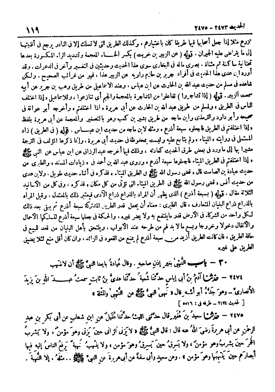 [2473] قَوْلُهُ عَنِ الزُّبَيْرِ بْنِ خِرِّيتٍ بِكَسْرِ الْخَاءِ الْمُعْجَمَةِ وَتَشْدِيدِ الرَّاءِ الْمَكْسُورَةِ بَعْدَهَا تَحْتَانِيَّةٌ سَاكِنَةٌ ثُمَّ مُثَنَّاةٌ بَصْرِيٌّ مَا لَهُ فِي الْبُخَارِيِّ سِوَى هَذَا الْحَدِيثِ وَحَدِيثَيْنِ فِي التَّفْسِيرِ وَآخَرَ فِي الدَّعَوَاتِ وَقَدْ أورد بن عَدِيٍّ هَذَا الْحَدِيثَ فِي أَفْرَادِ جَرِيرِ بْنِ حَازِمٍ رَاوِيهِ عَنِ الزُّبَيْرِ هَذَا فَهُوَ مِنْ غَرَائِبِ الصَّحِيحِ وَلَكِنَّ شَاهِدَهُ فِي مُسْلِمٍ مِنْ حَدِيث عبد الله بن الْحَارِث عَن بن عَبَّاسٍ وَعِنْدَ الْإِسْمَاعِيلِيِّ مِنْ طَرِيقِ وَهْبِ بْنِ جَرِيرٍ عَنْ أَبِيهِ سَمِعْتُ الزُّبَيْرَ قَوْلُهُ إِذَا تَشَاجَرُوا تَفَاعَلُوا مِنَ الْمُشَاجَرَةِ بِالْمُعْجَمَةِ وَالْجِيمِ أَيْ تَنَازَعُوا وَلِلْإِسْمَاعِيلِيِّ إِذَا اخْتَلَفَ النَّاسُ فِي الطَّرِيقِ وَلِمُسْلِمٍ مِنْ طَرِيقِ عَبْدِ اللَّهِ بْنِ الْحَارِثِ عَنْ أَبِي هُرَيْرَةَ إِذَا اخْتَلَفْتُمْ وَأَخْرَجَهُ أَبُو عوَانَة فِي صَحِيحه وَأَبُو دَاوُد وَالتِّرْمِذِيّ وبن مَاجَهْ مِنْ طَرِيقِ بَشِيرِ بْنِ كَعْبٍ وَهُوَ بِالتَّصْغِيرِ وَالْمُعْجَمَةِ عَنْ أَبِي هُرَيْرَةَ بِلَفْظِ إِذَا اخْتَلَفْتُمْ فِي الطَّرِيقِ فَاجْعَلُوهُ سَبْعَةَ أَذْرُعٍ وَمِثْلُهُ لِابْنِ ماجة من حَدِيث بن عَبَّاسٍ قَوْلُهُ فِي الطَّرِيقِ زَادَ الْمُسْتَمْلِي فِي رِوَايَتِهِ الْمِيتَاءَ وَلَمْ يُتَابَعْ عَلَيْهِ وَلَيْسَتْ بِمَحْفُوظَةٍ فِي حَدِيثِ أَبِي هُرَيْرَةَ وَإِنَّمَا ذَكَرَهَا الْمُؤَلِّفُ فِي التَّرْجَمَةِ مُشِيرًا بِهَا إِلَى مَا وَرَدَ فِي بَعْضِ طُرُقِ الْحَدِيثِ كَعَادَتِهِ وَذَلِكَ فِيمَا أخرجه عبد الرَّزَّاق عَن بن عَبَّاسٍ عَنِ النَّبِيِّ صَلَّى اللَّهُ عَلَيْهِ وَسَلَّمَ إِذَا اخْتَلَفْتُمْ فِي الطَّرِيقِ الْمِيتَاءِ فَاجْعَلُوهَا سَبْعَةَ أَذْرُعٍ وَرَوَى عَبْدُ اللَّهِ بْنُ أَحْمَدَ فِي زِيَادَاتِ الْمُسْنَدِ وَالطَّبَرِيُّ مِنْ حَدِيثِ عُبَادَةَ بْنِ الصَّامِتِ قَالَ قَضَى رَسُولُ اللَّهِ صَلَّى اللَّهُ عَلَيْهِ وَسَلَّمَ فِي الطَّرِيقِ الْمِيتَاءِ فَذَكَرَهُ فِي أَثْنَاءِ حَدِيثٍ طَوِيلٍ وَلِابْنِ عَدِيٍّ مِنْ حَدِيثِ أَنَسٍ قَضَى رَسُولُ اللَّهِ صَلَّى اللَّهُ عَلَيْهِ وَسَلَّمَ فِي الطَّرِيقِ الْمِيتَاءِ الَّتِي تُؤْتَى مِنْ كُلِّ مَكَانٍ فَذَكَرَهُ وَفِي كُلٍّ مِنَ الْأَسَانِيدِ الثَّلَاثَةِ مَقَالٌ قَوْلُهُ بِسَبْعَةِ أَذْرُعٍ الَّذِي يَظْهَرُ أَنَّ الْمُرَادَ بِالذِّرَاعِ ذِرَاعُ الْآدَمِيِّ فَيُعْتَبَرُ ذَلِكَ بِالْمُعْتَدِلِ وَقِيلَ الْمُرَادُ بِالذِّرَاعِ ذِرَاعُ الْبُنْيَانِ الْمُتَعَارَفِ قَالَ الطَّبَرِيُّ مَعْنَاهُ أَنْ يُجْعَلَ قَدْرُ الطَّرِيقِ الْمُشْتَرَكَةِ سَبْعَةَ أَذْرُعٍ ثُمَّ يَبْقَى بَعْدَ ذَلِكَ لِكُلِّ وَاحِدٍ مِنَ الشُّرَكَاءِ فِي الْأَرْضِ قَدْرُ مَا يَنْتَفِعُ بِهِ وَلَا يَضُرُّ غَيْرَهُ وَالْحِكْمَةُ فِي جَعْلِهَا سَبْعَةَ أَذْرُعٍ لِتَسْلُكَهَا الْأَحْمَالُ وَالْأَثْقَالُ دُخُولًا وَخُرُوجًا وَيَسَعَ مَا لَا بُدَّ لَهُمْ مِنْ طَرْحِهِ عِنْدَ الْأَبْوَابِ وَيَلْتَحِقُ بِأَهْلِ الْبُنْيَانِ مَنْ قَعَدَ لِلْبَيْعِ فِي حَافَّةِ الطَّرِيقِ فَإِنْ كَانَت الطَّرِيقُ أَزْيَدَ مِنْ سَبْعَةِ أَذْرُعٍ لَمْ يُمْنَعْ مِنَ الْقُعُودِ فِي الزَّائِدِ وَإِنْ كَانَ أَقَلَّ منع لِئَلَّا يضيق الطَّرِيق على غَيره