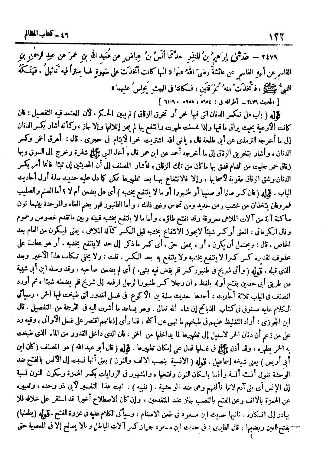 لَمْ يُبَيِّنِ الْحُكْمَ لِأَنَّ الْمُعْتَمَدَ فِيهِ التَّفْصِيلُ فَإِنْ كَانَتِ الْأَوْعِيَةُ بِحَيْثُ يُرَاقُ مَا فِيهَا وَإِذَا غُسِلَتْ طَهُرَتْ وَانْتُفِعَ بِهَا لَمْ يَجُزْ إِتْلَافُهَا وَإِلَّا جَازَ وَكَأَنَّهُ أَشَارَ بِكَسْرِ الدِّنَانِ إِلَى مَا أَخْرَجَهُ التِّرْمِذِيُّ عَنْ أَبِي طَلْحَةَ قَالَ يَا نَبِيَّ اللَّهِ اشْتَرَيْتُ خَمْرًا لِأَيْتَامٍ فِي حِجْرِي قَالَ أهرق الْخمر وَكسر الدِّنَانَ وَأَشَارَ بِتَخْرِيقِ الزِّقَاقِ إِلَى مَا أَخْرَجَهُ أَحْمد عَن بن عُمَرَ قَالَ أَخَذَ النَّبِيُّ صَلَّى اللَّهُ عَلَيْهِ وَسَلَّمَ شَفْرَةً وَخَرَجَ إِلَى السُّوقِ وَبِهَا زِقَاقُ خَمْرٍ جُلِبَتْ مِنَ الشَّامِ فَشَقَّ بِهَا مَا كَانَ مِنْ تِلْكَ الزِّقَاقِ فَأَشَارَ الْمُصَنِّفُ إِلَى أَنَّ الْحَدِيثَيْنِ إِنْ ثَبَتَا فَإِنَّمَا أَمَرَ بِكَسْرِ الدِّنَانِ وَشَقِّ الزِّقَاقِ عُقُوبَةً لِأَصْحَابِهَا وَإِلَّا فَالِانْتِفَاعُ بِهَا بَعْدَ تَطْهِيرِهَا مُمْكِنٌ كَمَا دَلَّ عَلَيْهِ حَدِيثُ سَلَمَةَ أَوَّلَ أَحَادِيثِ الْبَابِ قَوْلُهُ فَإِنْ كَسَرَ صَنَمًا أَوْ صَلِيبًا أَوْ طُنْبُورًا أَوْ مَا لَا يُنْتَفَعُ بِخَشَبِهِ أَيْ هَلْ يَضْمَنُ أَمْ لَا أَمَّا الصَّنَمُ وَالصَّلِيبُ فَمَعْرُوفَانِ يُتَّخَذَانِ مِنْ خَشَبٍ وَمِنْ حَدِيدٍ وَمِنْ نُحَاسٍ وَغَيْرِ ذَلِكَ وَأَمَّا الطُّنْبُورُ فَهُوَ بِضَمِّ الطَّاءِ وَالْمُوَحَّدَةِ بَيْنَهُمَا نُونٌ سَاكِنَةٌ آلَةٌ مِنْ آلَاتِ الْمَلَاهِي مَعْرُوفَةٌ وَقَدْ تُفْتَحُ طَاؤُهُ وَأَمَّا مَا لَا يُنْتَفَعُ بِخَشَبِهِ فَبَيْنَهُ وَبَيْنَ مَا تَقَدَّمَ خُصُوصٌ وَعُمُومٌ وَقَالَ الْكَرْمَانِيُّ الْمَعْنَى أَوْ كَسَرَ شَيْئًا لَا يَجُوزُ الِانْتِفَاعُ بِخَشَبِهِ قَبْلَ الْكَسْرِ كَآلَةِ الْمَلَاهِي يَعْنِي فَيَكُونُ مِنَ الْعَامِّ بَعْدَ الْخَاصِّ قَالَ وَيُحْتَمَلُ أَنْ يَكُونَ أَوْ بِمَعْنَى حَتَّى أَيْ كَسَرَ مَا ذُكِرَ إِلَى حَدٍّ لَا يُنْتَفَعُ بِخَشَبِهِ أَوْ هُوَ عَطْفٌ عَلَى مَحْذُوفٍ تَقْدِيرُهُ كَسَرَ كَسْرًا لَا يُنْتَفَعُ بِخَشَبِهِ وَلَا يُنْتَفَعُ بِهِ بَعْدَ الْكَسْرِ قُلْتُ وَلَا يَخْفَى تَكَلُّفُ هَذَا الْأَخِيرِ وَبُعْدُ الَّذِي قَبْلَهُ قَوْلُهُ وَأُتِيَ شُرَيْحٌ فِي طُنْبُورٍ كُسِرَ فَلَمْ يَقْضِ فِيهِ بِشَيْءٍ أَيْ لَمْ يُضَمِّنْ صَاحِبَهُ وَقَدْ وَصله بن أَبِي شَيْبَةَ مِنْ طَرِيقِ أَبِي حَصِينٍ بِفَتْحِ أَوَّلِهِ بِلَفْظِ أَنَّ رَجُلًا كَسَرَ طُنْبُورًا لِرَجُلٍ فَرَفَعَهُ إِلَى شُرَيْحٍ فَلَمْ يُضَمِّنْهُ شَيْئًا ثُمَّ أَوْرَدَ الْمُصَنِّفُ فِي الْبَابِ ثَلَاثَةَ أَحَادِيثَ أَحَدُهَا حَدِيثُ سَلَمَةَ بْنِ الْأَكْوَعِ فِي غَسْلِ الْقُدُورِ الَّتِي طُبِخَتْ فِيهَا الْخَمْرُ وَسَيَأْتِي الْكَلَامُ عَلَيْهِ مُسْتَوْفًى فِي كِتَابِ الذَّبَائِحِ إِنْ شَاءَ اللَّهُ تَعَالَى وَهُوَ يُسَاعِدُ مَا أَشَرْتُ إِلَيْهِ فِي التَّرْجَمَة من التَّفْصِيل قَالَ بن الْجَوْزِيِّ أَرَادَ التَّغْلِيظَ عَلَيْهِمْ فِي طَبْخِهِمْ مَا نُهِيَ عَنْ أَكْلِهِ فَلَمَّا رَأَى إِذْعَانَهُمُ اقْتَصَرَ عَلَى غَسْلِ الْأَوَانِي وَفِيهِ رَدٌّ عَلَى مَنْ زَعَمَ أَنَّ دِنَانَ الْخَمْرِ لَا سَبِيلَ إِلَى تَطْهِيرِهَا لِمَا يُدَاخِلُهَا مِنَ الْخَمْرِ فَإِنَّ الَّذِي دَاخِلَ الْقُدُورِ مِنَ الْمَاءِ الَّذِي طُبِخَتْ بِهِ الْخَمْرُ يُطَهِّرُهُ وَقَدْ أَذِنَ صَلَّى اللَّهُ عَلَيْهِ وَسَلَّمَ فِي غَسْلِهَا فَدَلَّ عَلَى إِمْكَانِ تَطْهِيرِهَا قَوْلُهُ قَالَ أَبُو عَبْدِ اللَّهِ هُوَ الْمُصَنِّفُ كَانَ بن أَبِي أُوَيْسٍ يَعْنِي شَيْخَهُ إِسْمَاعِيلَ