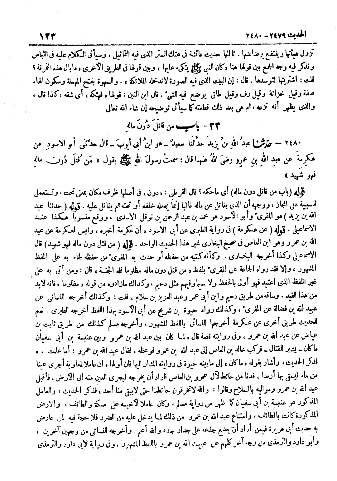 [2480] قَوْلُهُ حَدَّثَنَا عَبْدُ اللَّهِ بْنُ يَزِيدَ هُوَ الْمُقْرِئُ وَأَبُو الْأَسْوَدِ هُوَ مُحَمَّدُ بْنُ عَبْدِ الرَّحْمَنِ بْنِ نَوْفَلٍ الْأَسَدِيُّ وَوَقَعَ مَنْسُوبًا هَكَذَا عِنْدَ الْإِسْمَاعِيلِيِّ قَوْلُهُ عَنْ عِكْرِمَةَ فِي رِوَايَةِ الطَّبَرِيِّ عَنْ أَبِي الْأَسْوَدِ أَنَّ عِكْرِمَةَ أَخْبَرَهُ وَلَيْسَ لِعِكْرِمَةَ عَنْ عَبْدِ اللَّهِ بن عَمْرو وَهُوَ بن الْعَاصِ فِي صَحِيحِ الْبُخَارِيِّ غَيْرُ هَذَا الْحَدِيثِ الْوَاحِدِ قَوْلُهُ مَنْ قُتِلَ دُونَ مَالِهِ فَهُوَ شَهِيدٌ قَالَ الْإِسْمَاعِيلِيُّ وَكَذَا أَخْرَجَهُ الْبُخَارِيُّ وَكَأَنَّهُ كَتَبَهُ مِنْ حِفْظِهِ أَوْ حَدَّثَ بِهِ الْمُقْرِئُ مِنْ حِفْظِهِ فَجَاءَ بِهِ عَلَى اللَّفْظِ الْمَشْهُورِ وَإِلَّا فَقَدْ رَوَاهُ الْجَمَاعَةُ عَنِ الْمُقْرِئِ بِلَفْظِ مَنْ قُتِلَ دُونَ مَالِهِ مَظْلُومًا فَلَهُ الْجَنَّةُ قَالَ وَمَنْ أَتَى بِهِ عَلَى غَيْرِ اللَّفْظِ الَّذِي اعْتِيدَ فَهُوَ أَوْلَى بِالْحِفْظِ وَلَا سِيَّمَا وَفِيهِمْ مِثْلُ دُحَيْمٍ وَكَذَلِكَ مَا زَادُوهُ مِنْ قَوْلِهِ مَظْلُومًا فَإِنَّهُ لَا بُدَّ مِنْ هَذَا الْقَيْد وَسَاقه من طَرِيق دُحَيْم وبن أَبِي عُمَرَ وَعَبْدِ الْعَزِيزِ بْنِ سَلَّامٍ قُلْتُ وَكَذَلِكَ أَخْرَجَهُ النَّسَائِيُّ عَنْ عُبَيْدِ اللَّهِ بْنِ فَضَالَةَ عَنِ الْمُقْرِئِ وَكَذَلِكَ رَوَاهُ حَيْوَةُ بْنُ شُرَيْحٍ عَنْ أَبِي الْأَسْوَدِ بِهَذَا اللَّفْظِ أَخْرَجَهُ الطَّبَرِيُّ نَعَمْ لِلْحَدِيثِ طَرِيقٌ أُخْرَى عَنْ عِكْرِمَةَ أَخْرَجَهَا النَّسَائِيُّ بِاللَّفْظِ الْمَشْهُورِ وَأَخْرَجَهُ مُسْلِمٌ كَذَلِكَ مِنْ طَرِيقِ ثَابِتِ بْنِ عِيَاضٍ عَنْ عَبْدِ اللَّهِ بْنِ عَمْرٍو وَفِي رِوَايَتِهِ قِصَّةٌ قَالَ لَمَّا كَانَ بَيْنَ عَبْدِ اللَّهِ بْنِ عَمْرٍو وَبَيْنَ عَنْبَسَةَ بْنِ أَبِي سُفْيَانَ مَا كَانَ يُشِيرُ لِلْقِتَالِ فَرَكِبَ خَالِدُ بْنُ الْعَاصِ إِلَى عَبْدِ اللَّهِ بْنِ عَمْرٍو فَوَعَظَهُ فَقَالَ عَبْدُ اللَّهِ بْنُ عَمْرٍو أَمَا عَلِمْتَ فَذَكَرَ الْحَدِيثَ وَأَشَارَ بِقَوْلِهِ مَا كَانَ إِلَى مَا بَيَّنَهُ حَيْوَةُ فِي رِوَايَتِهِ الْمُشَارُ إِلَيْهَا فَإِنَّ أَوَّلَهَا أَنَّ عَامِلًا لِمُعَاوِيَةَ أَجْرَى عَيْنًا مِنْ مَاءٍ لِيَسْقِيَ بِهَا أَرْضًا فَدَنَا مِنْ حَائِطٍ لِآلِ عَمْرِو بْنِ الْعَاصِ فَأَرَادَ أَنْ يُخْرِجَهُ لِيُجْرِيَ الْعَيْنَ مِنْهُ إِلَى الْأَرْضِ فَأَقْبَلَ عَبْدُ اللَّهِ بْنُ عَمْرٍو وَمَوَالِيهِ بِالسِّلَاحِ وَقَالُوا وَاللَّهِ لَا تَخْرِقُونَ حَائِطَنَا حَتَّى لَا يَبْقَى مِنَّا أَحَدٌ فَذَكَرَ الْحَدِيثَ وَالْعَامِلُ الْمَذْكُورُ هُوَ عَنْبَسَةُ بْنُ أَبِي سُفْيَانَ كَمَا ظَهَرَ مِنْ رِوَايَةِ مُسْلِمٍ وَكَانَ عَامِلًا لِأَخِيهِ عَلَى مَكَّةَ وَالطَّائِفِ وَالْأَرْضُ الْمَذْكُورَةُ كَانَتْ بِالطَّائِفِ وَامْتِنَاعُ عَبْدِ اللَّهِ بْنِ عَمْرٍو مِنْ ذَلِكَ لِمَا يَدْخُلُ عَلَيْهِ مِنَ الضَّرَرِ فَلَا حُجَّةَ فِيهِ لِمَنْ عَارَضَ بِهِ حَدِيثَ أَبِي هُرَيْرَةَ فِيمَنْ أَرَادَ أَنْ يَضَعَ جِذْعَهُ عَلَى جِدَارِ جَارِهِ وَاللَّهُ أَعْلَمُ وَأَخْرَجَهُ النَّسَائِيُّ مِنْ وَجْهَيْنِ آخَرَيْنِ وَأَبُو دَاوُدَ وَالتِّرْمِذِيُّ مِنْ وَجْهٍ آخَرَ كُلُّهُمْ عَنْ عُبَيْدِ اللَّهِ بْنِ عَمْرٍو بِاللَّفْظِ الْمَشْهُورِ وَفِي رِوَايَةٍ لِأَبِي دَاوُد وَالتِّرْمِذِيّ