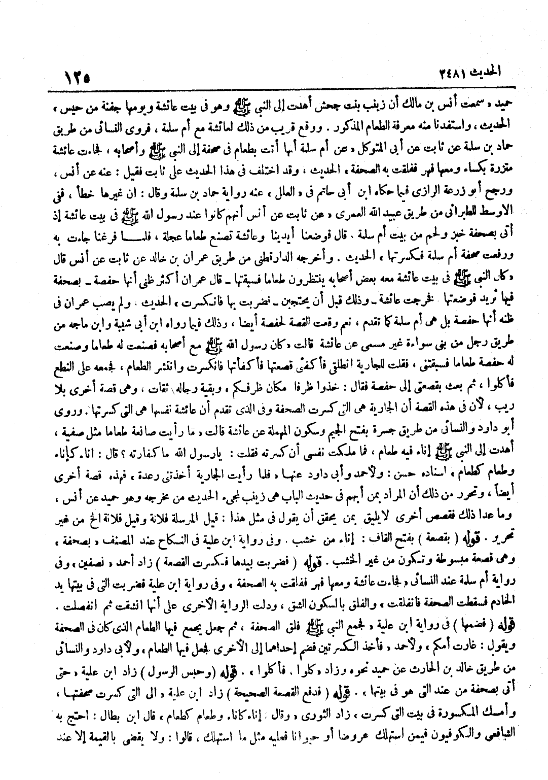 حُمَيْدٍ سَمِعْتُ أَنَسَ بْنَ مَالِكٍ أَنَّ زَيْنَبَ بِنْتَ جَحْشٍ أَهْدَتْ إِلَى النَّبِيِّ صَلَّى اللَّهُ عَلَيْهِ وَسَلَّمَ وَهُوَ فِي بَيْتِ عَائِشَةَ وَيَوْمِهَا جَفْنَةً مَنْ حَيْسٍ الْحَدِيثَ وَاسْتَفَدْنَا مِنْهُ مَعْرِفَةَ الطَّعَامِ الْمَذْكُورِ وَوَقَعَ قَرِيبٌ مِنْ ذَلِكَ لِعَائِشَةَ مَعَ أُمِّ سَلَمَةَ فَرَوَى النَّسَائِيُّ مِنْ طَرِيقِ حَمَّادِ بْنِ سَلَمَةَ عَنْ ثَابِتٍ عَنْ أَبِي الْمُتَوَكِّلِ عَنْ أُمِّ سَلَمَةَ أَنَّهَا أَتَتْ بِطَعَامٍ فِي صَحْفَةٍ إِلَى النَّبِيِّ صَلَّى اللَّهُ عَلَيْهِ وَسَلَّمَ وَأَصْحَابِهِ فَجَاءَتْ عَائِشَةُ مُتَّزِرَةً بِكِسَاءٍ وَمَعَهَا فِهْرٌ فَفَلَقَتْ بِهِ الصَّحْفَةَ الْحَدِيثَ وَقَدِ اخْتُلِفَ فِي هَذَا الْحَدِيثِ عَلَى ثَابِتٍ فَقِيلَ عَنْهُ عَنْ أَنَسٍ وَرَجَّحَ أَبُو زُرْعَةَ الرَّازِيُّ فِيمَا حَكَاهُ بن أَبِي حَاتِمٍ فِي الْعِلَلِ عَنْهُ رِوَايَةَ حَمَّادِ بْنِ سَلَمَةَ وَقَالَ إِنَّ غَيْرَهَا خَطَأٌ فَفِي الْأَوْسَطِ لِلطَّبَرَانِيِّ مِنْ طَرِيقِ عُبَيْدِ اللَّهِ الْعُمَرِيِّ عَنْ ثَابِتٍ عَنْ أَنَسٍ أَنَّهُمْ كَانُوا عِنْدَ رَسُولِ اللَّهِ صَلَّى اللَّهُ عَلَيْهِ وَسَلَّمَ فِي بَيْتِ عَائِشَةَ إِذْ أُتِيَ بِصَحْفَةِ خُبْزٍ وَلَحْمٍ مِنْ بَيْتِ أُمِّ سَلَمَةَ قَالَ فَوَضَعْنَا أَيْدِيَنَا وَعَائِشَةُ تَصْنَعُ طَعَامًا عَجِلَةً فَلَمَّا فَرَغْنَا جَاءَتْ بِهِ وَرَفَعَتْ صَحْفَةَ أُمِّ سَلَمَةَ فَكَسَرَتْهَا الْحَدِيثَ وَأَخْرَجَهُ الدَّارَقُطْنِيُّ مِنْ طَرِيقِ عِمْرَانَ بْنِ خَالِدٍ عَنْ ثَابِتٍ عَنْ أَنَسٌ قَالَ كَانَ النَّبِيُّ صَلَّى اللَّهُ عَلَيْهِ وَسَلَّمَ فِي بَيْتِ عَائِشَةَ مَعَهُ بَعْضُ أَصْحَابِهِ يَنْتَظِرُونَ طَعَامًا فَسَبَقَتْهَا قَالَ عِمْرَانُ أَكْثَرُ ظَنِّي أَنَّهَا حَفْصَةُ بِصَحْفَةٍ فِيهَا ثَرِيدٌ فَوَضَعَتْهَا فَخَرَجَتْ عَائِشَةُ وَذَلِكَ قَبْلَ أَنْ يَحْتَجِبْنَ فَضَرَبَتْ بِهَا فَانْكَسَرَتِ الْحَدِيثَ وَلَمْ يُصِبْ عِمْرَانُ فِي ظَنِّهِ أَنَّهَا حَفْصَةُ بَلْ هِيَ أُمُّ سَلَمَةَ كَمَا تَقَدَّمَ نَعَمْ وَقَعَتِ الْقِصَّةُ لحفصة أَيْضا وَذَلِكَ فِيمَا رَوَاهُ بن أبي شيبَة وبن مَاجَهْ مِنْ طَرِيقِ رَجُلٍ مِنْ بَنِي سُوَاءَةَ غَيْرِ مُسَمًّى عَنْ عَائِشَةَ قَالَتْ كَانَ رَسُولُ اللَّهِ صَلَّى اللَّهُ عَلَيْهِ وَسَلَّمَ مَعَ أَصْحَابِهِ فَصَنَعْتُ لَهُ طَعَامًا وَصَنَعَتْ لَهُ حَفْصَةُ طَعَامًا فَسَبَقَتْنِي فَقُلْتُ لِلْجَارِيَةِ انْطَلِقِي فَأَكْفِئِي قَصْعَتَهَا فَأَكْفَأَتْهَا فَانْكَسَرَتْ وَانْتَشَرَ الطَّعَامُ فَجَمَعَهُ عَلَى النِّطَعِ فَأَكَلُوا ثُمَّ بَعَثَ بِقَصْعَتِي إِلَى حَفْصَةَ فَقَالَ خُذُوا ظَرْفًا مَكَانَ ظَرْفِكُمْ وَبَقِيَّةُ رِجَالِهِ ثِقَاتٌ وَهِيَ قِصَّةٌ أُخْرَى بِلَا رَيْبٍ لِأَنَّ فِي هَذِهِ الْقِصَّةِ أَنَّ الْجَارِيَةَ هِيَ الَّتِي كَسَرَتِ الصَّحْفَةَ وَفِي الَّذِي تَقَدَّمَ أَنَّ عَائِشَةَ نَفْسَهَا هِيَ الَّتِي كَسَرَتْهَا وَرَوَى أَبُو دَاوُدَ وَالنَّسَائِيُّ مِنْ طَرِيقِ جَسْرَةَ بِفَتْحِ الْجِيمِ وَسُكُونِ الْمُهْمَلَةِ عَنْ عَائِشَة قَالَت مَا رَأَيْت صانعة طَعَاما مِثْلَ صَفِيَّةَ أَهَدَتْ إِلَى النَّبِيِّ صَلَّى اللَّهُ عَلَيْهِ وَسَلَّمَ إِنَاءً فِيهِ طَعَامٌ فَمَا مَلَكْتُ نَفْسِي أَنْ كَسَرْتُهُ فَقُلْتُ يَا رَسُولَ اللَّهِ مَا كَفَّارَتُهُ قَالَ إِنَاءٌ كَإِنَاءٍ وَطَعَامٌ كَطَعَامٍ إِسْنَادُهُ حَسَنٌ وَلِأَحْمَدَ وَأَبِي دَاوُدَ عَنْهَا فَلَمَّا رَأَيْتُ الْجَارِيَةَ أَخَذَتْنِي رِعْدَةٌ فَهَذِهِ قِصَّةٌ أُخْرَى أَيْضًا وَتَحَرَّرَ مِنْ ذَلِكَ أَنَّ الْمُرَادَ بِمَنْ أُبْهِمَ فِي حَدِيثِ الْبَابِ هِيَ زَيْنَبُ 
