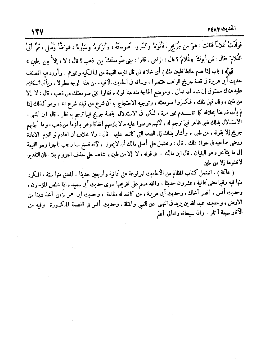 [2482] قَوْلِهِ لَا إِلَّا مِنْ طِينٍ شَاهِدٌ عَلَى حَذْفِ الْمَجْزُومِ بِلَا فَإِنَّ التَّقْدِيرَ لَا نبنوها إِلَّا مِنْ طِينٍ خَاتِمَةٌ اشْتَمَلَ كِتَابُ الْمَظَالِمِ مِنَ الْأَحَادِيثِ الْمَرْفُوعَةِ عَلَى ثَمَانِيَةٍ وَأَرْبَعِينَ حَدِيثًا الْمُعَلَّقُ مِنْهَا سِتَّةٌ الْمُكَرَّرُ مِنْهَا فِيهِ وَفِيمَا مَضَى ثَمَانِيَةٌ وَعِشْرُونَ حَدِيثًا وَافَقَهُ مُسْلِمٌ عَلَى تَخْرِيجِهَا سِوَى حَدِيثِ أَبِي سَعِيدٍ إِذَا خَلَصَ الْمُؤْمِنُونَ وَحَدِيثِ أَنَسٍ انْصُرْ أَخَاكَ وَحَدِيثِ أَبِي هُرَيْرَة من كَانَت لَهُ مظْلمَة وَحَدِيث بن عُمَرَ مَنْ أَخَذَ شَيْئًا مِنَ الْأَرْضِ وَحَدِيثِ عَبْدِ اللَّهِ بْنِ يَزِيدَ فِي النَّهْيِ عَنِ النُّهْبَى وَالْمُثْلَةِ وَحَدِيثِ أَنَسٍ فِي الْقَصْعَةِ الْمَكْسُورَةِ وَفِيهِ مِنَ الْآثَارِ سَبْعَةُ آثَارٍ وَاللَّهُ سُبْحَانَهُ وَتَعَالَى أعلم