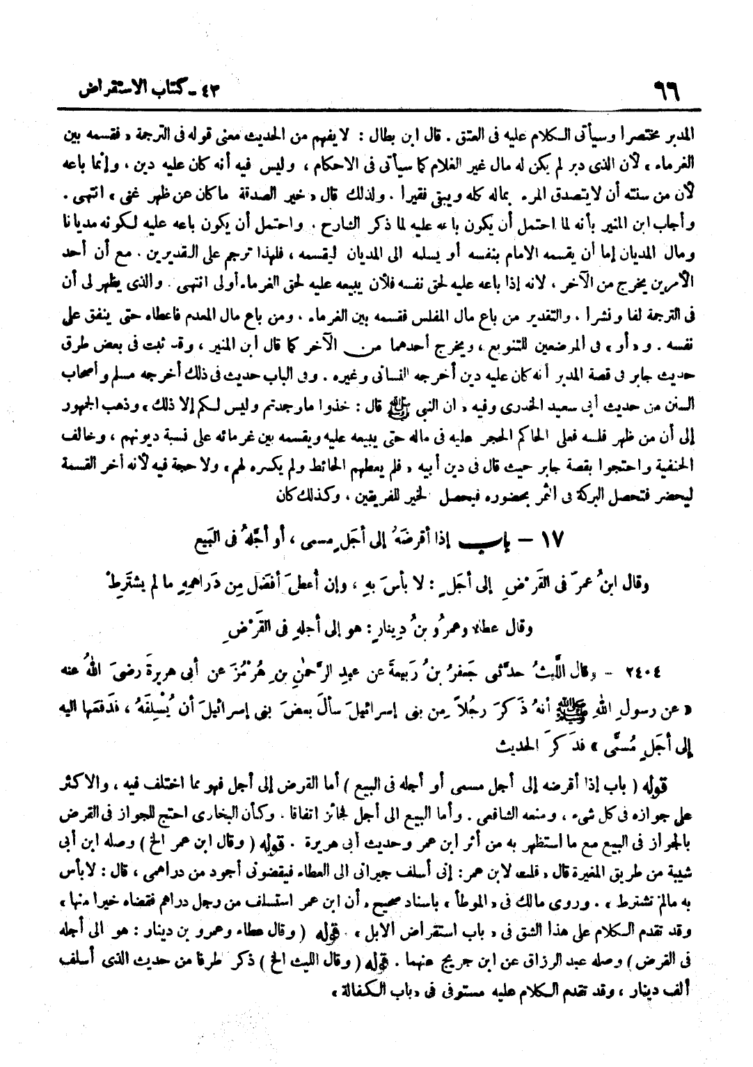 أَمَّا الْقَرْضُ إِلَى أَجَلٍ فَهُوَ مِمَّا اخْتُلِفَ فِيهِ وَالْأَكْثَرُ عَلَى جَوَازِهِ فِي كُلِّ شَيْءٍ وَمَنَعَهُ الشَّافِعِيُّ وَأَمَّا الْبَيْعُ إِلَى أَجَلٍ فَجَائِزٌ اتِّفَاقًا وَكَأَنَّ الْبُخَارِيَّ احْتَجَّ لِلْجَوَازِ فِي الْقَرْضِ بِالْجَوَازِ فِي الْبَيْعِ مَعَ مَا استظهر بِهِ من أثر بن عمر وَحَدِيث أبي هُرَيْرَة قَوْله وَقَالَ بن عمر الخ وَصله بن أَبِي شَيْبَةَ مِنْ طَرِيقِ الْمُغِيرَةِ قَالَ قُلْتُ لِابْنِ عُمَرَ إِنِّي أُسْلِفُ جِيرَانِي إِلَى الْعَطَاءِ فَيَقْضُونِي أَجْوَدَ مِنْ دَرَاهِمِي قَالَ لَا بَأْسَ بِهِ مَا لَمْ تَشْتَرِطْ وَرَوَى مَالِكٌ فِي الْمُوَطَّأ بِإِسْنَاد صَحِيح أَن بن عُمَرَ اسْتَسْلَفَ مِنْ رَجُلٍ دَرَاهِمَ فَقَضَاهُ خَيْرًا مِنْهَا وَقَدْ تَقَدَّمَ الْكَلَامُ عَلَى هَذَا الشِّقِّ فِي بَابِ اسْتِقْرَاضِ الْإِبِلِ قَوْلُهُ وَقَالَ عَطَاءٌ وَعَمْرُو بْنُ دِينَارٍ هُوَ إِلَى أَجَلِهِ فِي الْقَرْض وَصله عبد الرَّزَّاق عَن بن جُرَيْجٍ عَنْهُمَا