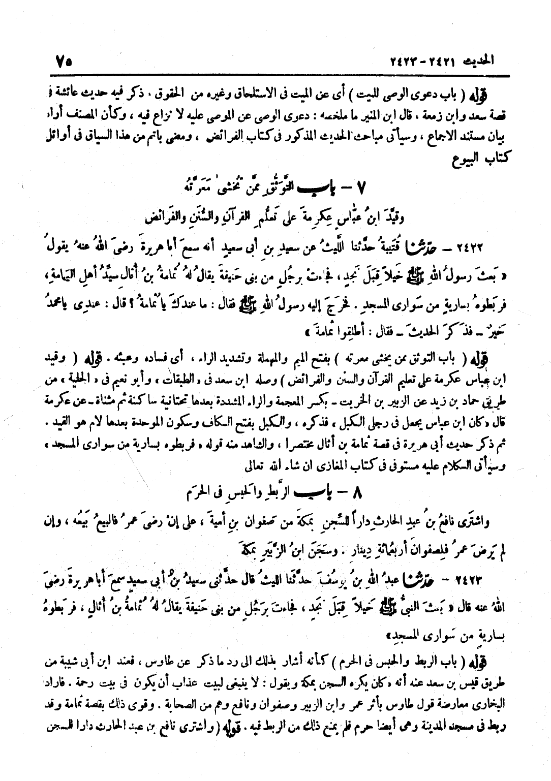 [2422] قَوْلُهُ فَرَبَطُوهُ بِسَارِيَةٍ مِنْ سَوَارِي الْمَسْجِدِ وَسَيَأْتِي الْكَلَامُ عَلَيْهِ مُسْتَوْفًى فِي كِتَابِ الْمَغَازِي إِنْ شَاءَ اللَّهُ تَعَالَى