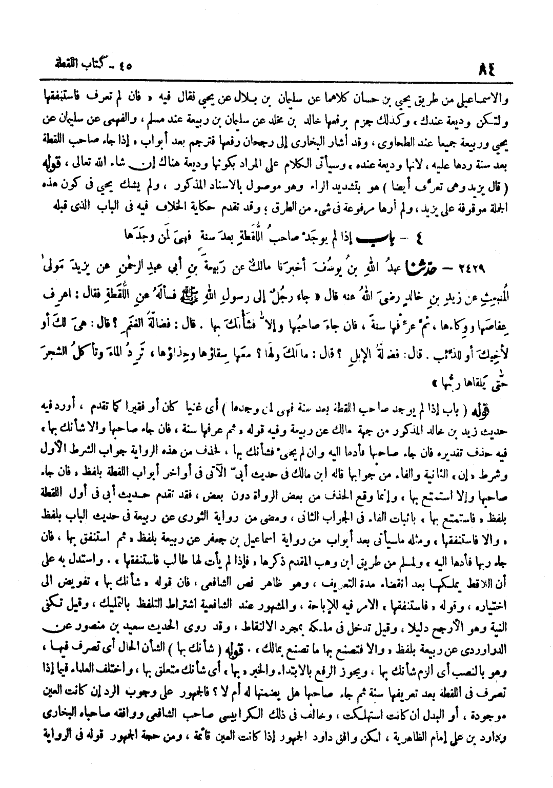 [2429] قَوْلُهُ ثُمَّ عَرِّفْهَا سَنَةً فَإِنْ جَاءَ صَاحِبُهَا وَإِلَّا شَأْنَكَ بِهَا فِيهِ حَذْفٌ تَقْدِيرُهُ فَإِنْ جَاءَ صَاحِبُهَا فَأَدِّهَا إِلَيْهِ وَأَن لم يَجِيء فشأنك بهَا فخذف مِنْ هَذِهِ الرِّوَايَةِ جَوَابَ الشَّرْطِ الْأَوَّلِ وَشَرْطَ إِن الثَّانِيَة وَالْفَاء من جوابها قَالَه بن مَالِكٍ فِي حَدِيثِ أُبَيٍّ الْآتِي فِي أَوَاخِرِ أَبْوَابِ اللُّقَطَةِ بِلَفْظِ فَإِنْ جَاءَ صَاحِبُهَا وَإِلَّا اسْتَمْتِعْ بِهَا وَإِنَّمَا وَقَعَ الْحَذْفُ مِنْ بَعْضِ الرُّوَاةِ دُونَ بَعْضٍ فَقَدْ تَقَدَّمَ حَدِيثُ أُبَيٍّ فِي أَوَّلِ اللُّقَطَةِ بِلَفْظِ فَاسْتَمْتِعْ بِهَا بِإِثْبَاتِ الْفَاءِ فِي الْجَوَابِ الثَّانِي وَمَضَى مِنْ رِوَايَةِ الثَّوْرِيِّ عَنْ رَبِيعَةَ فِي حَدِيثِ الْبَابِ بِلَفْظِ وَإِلَّا فَاسْتَنْفِقْهَا وَمِثْلُهُ مَا سَيَأْتِي بَعْدَ أَبْوَابٍ مِنْ رِوَايَةِ إِسْمَاعِيلَ بْنِ جَعْفَرٍ عَنْ رَبِيعَةَ بِلَفْظِ ثُمَّ اسْتَنْفِقْ بِهَا فَإِنْ جَاءَ رَبُّهَا فأدها إِلَيْهِ وَلمُسلم من طَرِيق بن وَهْبٍ الْمُقْدَّمِ ذِكْرُهَا فَإِذَا لَمْ يَأْتِ لَهَا طَالِبٌ فَاسْتَنْفِقْهَا وَاسْتُدِلَّ بِهِ عَلَى أَنَّ اللَّاقِطَ يَمْلِكُهَا بَعْدَ انْقِضَاءِ مُدَّةِ التَّعْرِيفِ وَهُوَ ظَاهِرُ نَصِّ الشَّافِعِيِّ فَإِنَّ قَوْلَهُ شَأْنَكَ بِهَا تَفْوِيضٌ إِلَى اخْتِيَارِهِ وَقَوْلُهُ فَاسْتَنْفِقْهَا الْأَمْرُ فِيهِ لِلْإِبَاحَةِ وَالْمَشْهُورُ عِنْدَ الشَّافِعِيَّةِ اشْتِرَاطُ التَّلَفُّظِ بِالتَّمْلِيكِ وَقِيلَ تَكْفِي النِّيَّةُ وَهُوَ الْأَرْجَحُ دَلِيلًا وَقِيلَ تَدْخُلُ فِي مِلْكِهِ بِمُجَرَّدِ الِالْتِقَاطِ وَقَدْ رَوَى الْحَدِيثَ سَعِيدُ بْنُ مَنْصُورٍ عَنِ الدَّرَاوَرْدِيِّ عَنْ رَبِيعَةَ بِلَفْظِ وَإِلَّا فَتَصْنَعُ بِهَا مَا تَصْنَعُ بِمَالِكَ قَوْلُهُ شَأْنَكَ بِهَا الشَّأْنُ الْحَالُ أَيْ تَصَرَّفْ فِيهَا وَهُوَ بِالنَّصْبِ أَيِ الْزَمْ شَأْنَكَ بِهَا وَيَجُوزُ الرَّفْعُ بِالِابْتِدَاءِ وَالْخَبَرُ بِهَا أَيْ شَأْنُكَ مُتَعَلِّقٌ بِهَا وَاخْتَلَفَ الْعُلَمَاءُ فِيمَا إِذَا تَصَرَّفَ فِي اللُّقَطَةِ بَعْدَ تَعْرِيفِهَا سَنَةً ثُمَّ جَاءَ صَاحِبُهَا هَلْ يَضْمَنُهَا لَهُ أَمْ لَا فَالْجُمْهُورُ عَلَى وُجُوبِ الرَّدِّ إِنْ كَانَتِ الْعَيْنُ مَوْجُودَةً أَوِ الْبَدَلِ إِنْ كَانَتِ اسْتُهْلِكَتْ وَخَالَفَ فِي ذَلِكَ الْكَرَابِيسِيُّ صَاحِبُ الشَّافِعِيِّ وَوَافَقَهُ صَاحِبَاهُ الْبُخَارِيُّ وَدَاوُدُ بْنُ عَلِيٍّ إِمَامُ الظَّاهِرِيَّةِ لَكِنْ وَافَقَ دَاوُدُ الْجُمْهُورَ إِذَا كَانَتِ الْعَيْنُ قَائِمَةً وَمِنْ حُجَّةِ الْجُمْهُورِ قَوْلُهُ فِي الرِّوَايَةِ