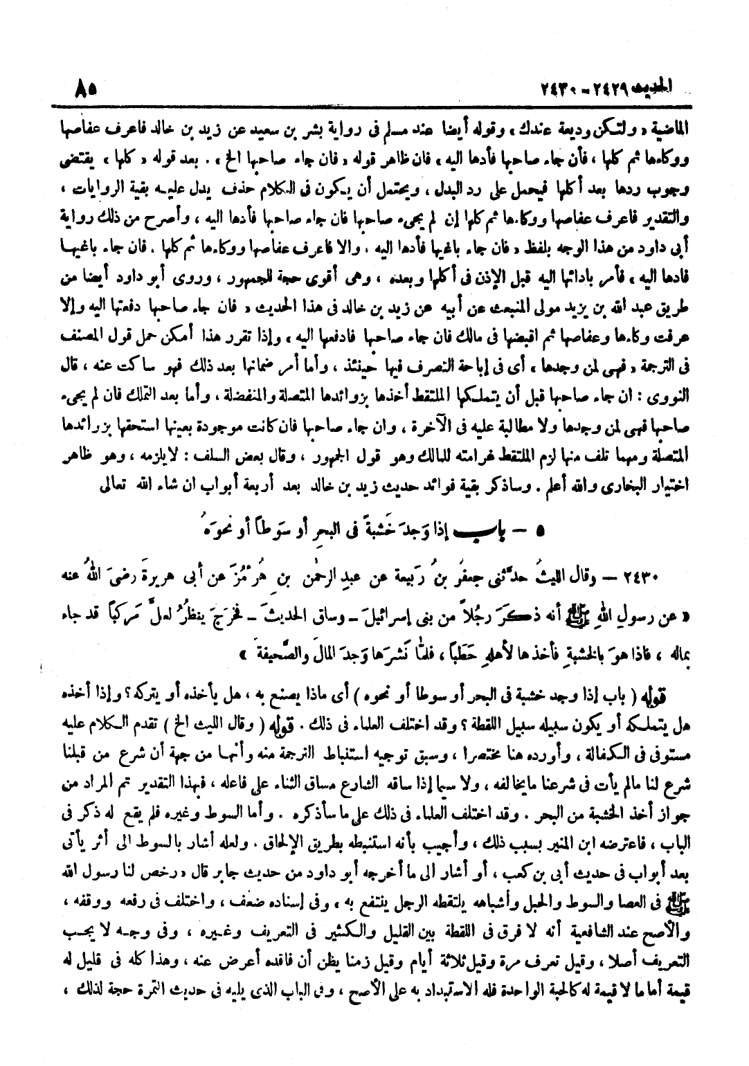[2430] قَوْلُهُ وَقَالَ اللَّيْثُ إِلَخْ تَقَدَّمَ الْكَلَامُ عَلَيْهِ مُسْتَوْفًى فِي الْكَفَالَةِ وَأَوْرَدَهُ هُنَا مُخْتَصَرًا وَسَبَقَ تَوْجِيهُ اسْتِنْبَاطِ التَّرْجَمَةِ مِنْهُ وَأَنَّهَا مِنْ جِهَةِ أَنَّ شَرْعَ مَنْ قَبْلَنَا شَرْعٌ لَنَا مَا لَمْ يَأْتِ فِي شَرْعِنَا مَا يُخَالِفُهُ وَلَا سِيَّمَا إِذَا سَاقَهُ الشَّارِعُ مَسَاقَ الثَّنَاءِ عَلَى فَاعِلِهِ فَبِهَذَا التَّقْدِيرِ تَمَّ الْمُرَادُ مِنْ جَوَازِ أَخْذِ الْخَشَبَةِ مِنَ الْبَحْرِ وَقَدِ اخْتَلَفَ الْعُلَمَاءُ فِي ذَلِكَ عَلَى مَا سَأَذْكُرُهُ وَأَمَّا السَّوْطُ وَغَيْرُهُ فَلَمْ يَقع لَهُ ذكر فِي الْبَاب فاعترضه بن الْمُنِيرِ بِسَبَبِ ذَلِكَ وَأُجِيبَ بِأَنَّهُ اسْتَنْبَطَهُ بِطَرِيقِ الْإِلْحَاقِ وَلَعَلَّهُ أَشَارَ بِالسَّوْطِ إِلَى أَثَرٍ يَأْتِي بَعْدَ أَبْوَابٍ فِي حَدِيثِ أُبَيِّ بْنِ كَعْبٍ أَوْ أَشَارَ إِلَى مَا أَخْرَجَهُ أَبُو دَاوُدَ مِنْ حَدِيثِ جَابِرٍ قَالَ رَخَّصَ لَنَا رَسُولُ اللَّهِ صَلَّى اللَّهُ عَلَيْهِ وَسَلَّمَ فِي الْعَصَا وَالسَّوْطِ وَالْحَبْلِ وَأَشْبَاهِهِ يَلْتَقِطُهُ الرَّجُلُ يَنْتَفِعُ بِهِ وَفِي إِسْنَادِهِ ضَعْفٌ وَاخْتُلِفَ فِي رَفْعِهِ وَوَقْفِهِ وَالْأَصَحُّ عِنْدَ الشَّافِعِيَّةِ أَنَّهُ لَا فَرْقَ فِي اللُّقَطَةِ بَيْنَ الْقَلِيلِ وَالْكَثِيرِ فِي التَّعْرِيفِ وَغَيْرِهِ وَفِي وَجْهٍ لَا يَجِبُ التَّعْرِيفُ أَصْلًا وَقِيلَ تُعَرَّفُ مَرَّةً وَقِيلَ ثَلَاثَةَ أَيَّامٍ وَقِيلَ زَمَنًا يَظُنُّ أَنَّ فَاقِدَهُ أَعْرَضَ عَنْهُ وَهَذَا كُلُّهُ فِي قَلِيلٍ لَهُ قِيمَةٌ أَمَّا مَا لَا قِيمَةَ لَهُ كَالْحَبَّةِ الْوَاحِدَةِ فَلَهُ الِاسْتِبْدَادُ بِهِ عَلَى الْأَصَحِّ وَفِي الْبَابِ الَّذِي يَلِيهِ فِي حَدِيثِ التَّمْرَةِ حُجَّةٌ لِذَلِكَ