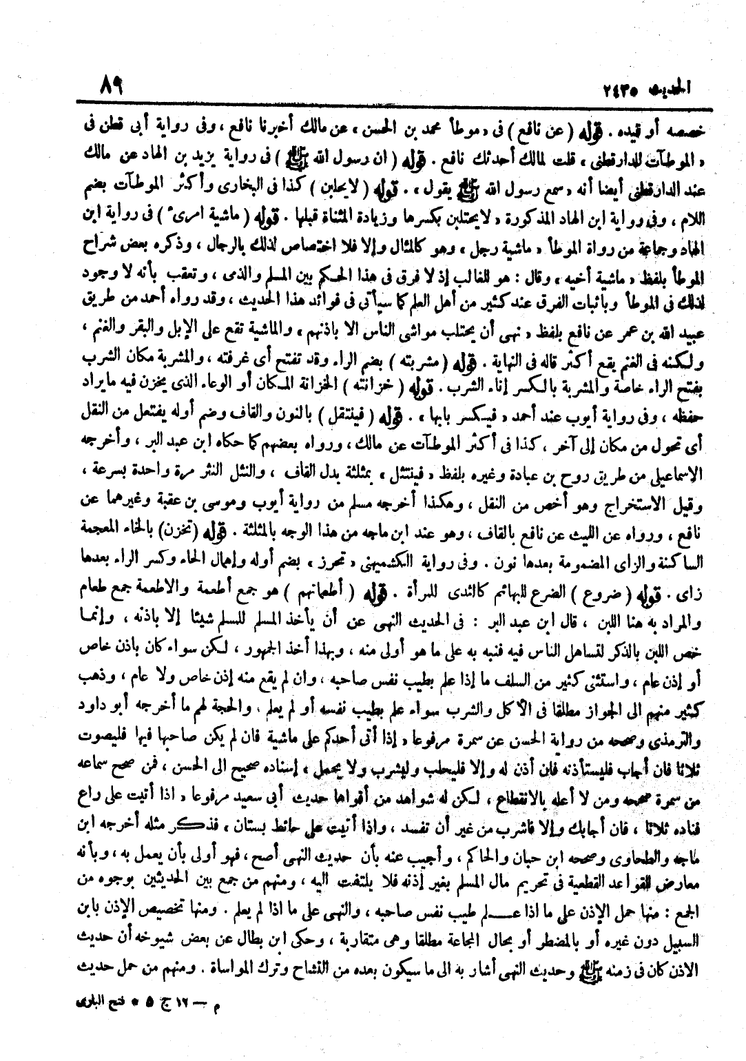 [2435] قَوْلُهُ عَنْ نَافِعٍ فِي مُوَطَّأِ مُحَمَّدِ بْنِ الْحَسَنِ عَنْ مَالِكٍ أَخْبَرَنَا نَافِعٌ وَفِي رِوَايَةِ أَبِي قَطَنٍ فِي الْمُوَطَّآتِ لِلدَّارَقُطْنِيِّ قُلْتُ لِمَالِكٍ أَحَدَّثَكَ نَافِعٌ قَوْلُهُ أَنَّ رَسُولَ اللَّهِ صَلَّى اللَّهُ عَلَيْهِ وَسَلَّمَ فِي رِوَايَةِ يَزِيدَ بْنِ الْهَادِ عَنْ مَالِكٍ عِنْدَ الدَّارَقُطْنِيِّ أَيْضًا أَنَّهُ سَمِعَ رَسُولَ اللَّهِ صَلَّى اللَّهُ عَلَيْهِ وَسَلَّمَ يَقُولُ قَوْلُهُ لَا يَحْلُبَنَّ كَذَا فِي الْبُخَارِيِّ وَأَكْثَرِ الْمُوَطَّآتِ بِضَمِّ اللَّامِ وَفِي رِوَايَة بن الْهَادِ الْمَذْكُورَةِ لَا يَحْتَلِبَنَّ بِكَسْرِهَا وَزِيَادَةِ الْمُثَنَّاةِ قبلهَا قَوْله مَاشِيَة امْرِئ فِي رِوَايَة بن الْهَادِ وَجَمَاعَةٍ مِنْ رُوَاةِ الْمُوَطَّأِ مَاشِيَةَ رَجُلٍ وَهُوَ كَالْمِثَالِ وَإِلَّا فَلَا اخْتِصَاصَ لِذَلِكَ بِالرِّجَالِ وَذَكَرَهُ بَعْضُ شُرَّاحِ الْمُوَطَّأِ بِلَفْظِ مَاشِيَةَ أَخِيهِ وَقَالَ هُوَ لِلْغَالِبِ إِذْ لَا فَرْقَ فِي هَذَا الْحُكْمِ بَيْنَ الْمُسْلِمِ وَالذِّمِّيِّ وَتُعُقِّبَ بِأَنَّهُ لَا وُجُودَ لِذَلِكَ فِي الْمُوَطَّأِ وَبِإِثْبَاتِ الْفَرْقِ عِنْدَ كَثِيرٍ مِنْ أَهْلِ الْعِلْمِ كَمَا سَيَأْتِي فِي فَوَائِدِ هَذَا الْحَدِيثِ وَقَدْ رَوَاهُ أَحْمَدُ مِنْ طَرِيقِ عُبَيْدِ اللَّهِ بْنِ عُمَرَ عَنْ نَافِعٍ بِلَفْظِ نهى أَن يحتلب مَوَاشِي النَّاسِ إِلَّا بِإِذْنِهِمْ وَالْمَاشِيَةُ تَقَعُ عَلَى الْإِبِلِ وَالْبَقَرِ وَالْغَنَمِ وَلَكِنَّهُ فِي الْغَنَمِ يَقَعُ أَكْثَرَ قَالَهُ فِي النِّهَايَةِ قَوْلُهُ مَشْرُبَتُهُ بِضَمِّ الرَّاءِ وَقَدْ تُفْتَحُ أَيْ غُرْفَتُهُ وَالْمَشْرَبَةُ مَكَانُ الشُّرْبِ بِفَتْحِ الرَّاءِ خَاصَّةً وَالْمَشْرِبَةُ بِالْكَسْرِ إِنَاءُ الشُّرْبِ قَوْلُهُ خِزَانَتُهُ الْخِزَانَةُ الْمَكَانُ أَوِ الْوِعَاءُ الَّذِي يُخَزَّنُ فِيهِ مَا يُرَادُ حِفْظُهُ وَفِي رِوَايَةِ أَيُّوبَ عِنْدَ أَحْمَدَ فَيُكْسَرَ بَابُهَا قَوْلُهُ فَيُنْتَقَلَ بِالنُّونِ وَالْقَافِ وَضَمِّ أَوَّلِهِ يُفْتَعَلُ مِنَ النَّقْلِ أَيْ تَحَوَّلَ مِنْ مَكَانٍ إِلَى آخَرَ كَذَا فِي أَكْثَرِ الْمُوَطَّآتِ عَنْ مَالِكٍ وَرَوَاهُ بَعضهم كَمَا حَكَاهُ بن عَبْدِ الْبَرِّ وَأَخْرَجَهُ الْإِسْمَاعِيلِيُّ مِنْ طَرِيقِ رَوْحِ بْنِ عُبَادَةَ وَغَيْرِهِ بِلَفْظِ فَيُنْتَثَلَ بِمُثَلَّثَةٍ بَدَلَ الْقَافِ وَالنَّثْلُ النَّثْرُ مَرَّةً وَاحِدَةً بِسُرْعَةٍ وَقِيلَ الِاسْتِخْرَاجُ وَهُوَ أَخَصُّ مِنَ النَّقْلِ وَهَكَذَا أَخْرَجَهُ مُسْلِمٌ مِنْ رِوَايَةِ أَيُّوبَ وَمُوسَى بْنِ عُقْبَةَ وَغَيْرِهِمَا عَنْ نَافِعٍ وَرَوَاهُ عَنِ اللَّيْثِ عَنْ نَافِع بِالْقَافِ وَهُوَ عِنْد بن مَاجَهْ مِنْ هَذَا الْوَجْهِ بِالْمُثَلَّثَةِ قَوْلُهُ تَخْزُنُ بِالْخَاءِ الْمُعْجَمَةِ السَّاكِنَةِ وَالزَّايِ الْمَضْمُومَةِ بَعْدَهَا نُونٌ وَفِي رِوَايَةِ الْكُشْمِيهَنِيِّ تُحْرِزُ بِضَمِّ أَوَّلِهِ وَإِهْمَالِ الْحَاءِ وَكَسْرِ الرَّاءِ بَعْدَهَا زَايٌ قَوْلُهُ ضُرُوعُ الضَّرع للبهائم كالثدي للْمَرْأَة قَوْله أطعمانهم هُوَ جَمْعُ أَطْعِمَةٍ وَالْأَطْعِمَةُ جَمْعُ طَعَامٍ وَالْمُرَادُ بِهِ هُنَا اللَّبن قَالَ بن عَبْدِ الْبَرِّ فِي الْحَدِيثِ النَّهْيُ عَنْ أَنْ يَأْخُذَ الْمُسْلِمُ لِلْمُسْلِمِ شَيْئًا إِلَّا بِإِذْنِهِ وَإِنَّمَا خَصَّ اللَّبَنَ بِالذِّكْرِ لِتَسَاهُلِ النَّاسِ فِيهِ فَنَبَّهَ بِهِ عَلَى مَا هُوَ أَوْلَى مِنْهُ وَبِهَذَا أَخَذَ الْجُمْهُورُ لَكِنْ سَوَاءٌ كَانَ بِإِذْنٍ خَاصٍّ أَوْ إِذْنٍ عَامٍّ وَاسْتَثْنَى كَثِيرٌ مِنَ السَّلَفِ مَا إِذَا عَلِمَ بِطِيبِ نَفْسِ صَاحِبِهِ وَإِنْ لَمْ يَقَعْ 