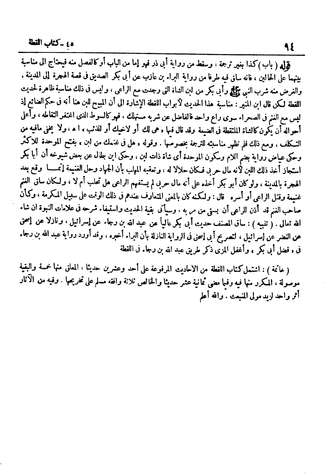 بِغَيْرِ تَرْجَمَةٍ وَسَقَطَ مِنْ رِوَايَةِ أَبِي ذَرٍّ فَهُوَ إِمَّا مِنَ الْبَابِ أَوْ كَالْفَصْلِ مِنْهُ فَيَحْتَاجُ إِلَى مُنَاسَبَةٍ بَيْنَهُمَا عَلَى الْحَالَيْنِ فَإِنَّهُ سَاقَ فِيهِ طَرَفًا مِنْ رِوَايَةِ الْبَرَاءِ بْنِ عَازِبٍ عَنْ أَبِي بَكْرٍ الصِّدِّيقِ فِي قِصَّةِ الْهِجْرَةِ إِلَى الْمَدِينَةِ وَالْغَرَضُ مِنْهُ شُرْبُ النَّبِيِّ صَلَّى اللَّهُ عَلَيْهِ وَسَلَّمَ وَأَبِي بَكْرٍ مِنْ لَبَنِ الشَّاةِ الَّتِي وُجِدَتْ مَعَ الرَّاعِي وَلَيْسَ فِي ذَلِكَ مُنَاسَبَةٌ ظَاهِرَةٌ لحَدِيث اللّقطَة لَكِن قَالَ بن الْمُنِيرِ مُنَاسَبَةُ هَذَا الْحَدِيثِ لِأَبْوَابِ اللُّقَطَةِ الْإِشَارَةُ إِلَى أَنَّ الْمُبِيحَ لِلَّبَنِ هُنَا أَنَّهُ فِي حُكْمِ الضَّائِعِ إِذْ لَيْسَ مَعَ الْغَنَمِ فِي الصَّحْرَاءِ سِوَى رَاعٍ وَاحِدٍ فَالْفَاضِلُ عَنْ شُرْبِهِ مُسْتَهْلَكٌ فَهُوَ كَالسَّوْطِ الَّذِي اغْتُفِرَ الْتِقَاطُهُ وَأَعْلَى أَحْوَالِهِ أَنْ يَكُونَ كَالشَّاةِ الْمُلْتَقَطَةِ فِي الضَّيْعَةِ وَقَدْ قَالَ فِيهَا هِيَ لَكَ أَوْ لِأَخِيكَ أَوْ لِلذِّئْبِ اه وَلَا يَخْفَى مَا فِيهِ من التَّكَلُّف وَمَعَ ذَلِك فَلم نظهر مُنَاسَبَتُهُ لِلتَّرْجَمَةِ بِخُصُوصِهَا وَقَوْلُهُ