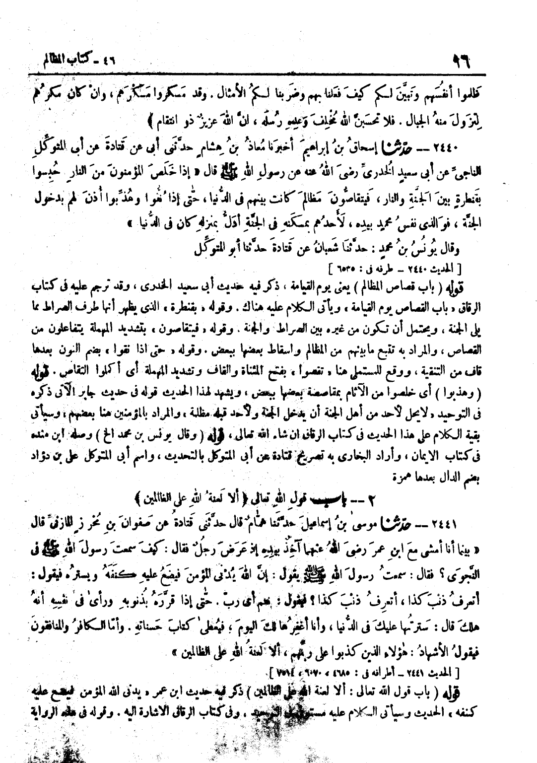 [2440] بِقَنْطَرَةٍ الَّذِي يَظْهَرُ أَنَّهَا طَرَفُ الصِّرَاطِ مِمَّا يَلِي الْجَنَّةَ وَيُحْتَمَلُ أَنْ تَكُونَ مِنْ غَيْرِهِ بَيْنَ الصِّرَاطِ وَالْجَنَّةِ وَقَوْلُهُ فَيَتَقَاصُّونَ بِتَشْدِيدِ الْمُهْمَلَةِ يَتَفَاعَلُونَ مِنَ الْقِصَاصِ وَالْمُرَادُ بِهِ تَتَبُّعُ مَا بَيْنَهُمْ مِنَ الْمَظَالِمِ وَإِسْقَاطُ بَعْضِهَا بِبَعْضٍ وَقَوْلُهُ حَتَّى إِذَا نُقُّوا بِضَمِّ النُّونِ بَعْدَهَا قَافٌ مِنَ التَّنْقِيَةِ وَوَقَعَ لِلْمُسْتَمْلِيِّ هُنَا تَقَصَّوْا بِفَتْحِ الْمُثَنَّاةِ وَالْقَافِ وَتَشْدِيدِ الْمُهْمَلَةِ أَيْ أَكْمَلُوا التَّقَاصَّ قَوْلُهُ وَهُذِّبُوا أَيْ خُلِّصُوا مِنَ الْآثَامِ بِمُقَاصَصَةِ بَعْضِهَا بِبَعْضٍ وَيَشْهَدُ لِهَذَا الْحَدِيثِ قَوْلُهُ فِي حَدِيثِ جَابِرٍ الْآتِي ذِكْرُهُ فِي التَّوْحِيدِ لَا يَحِلُّ لِأَحَدٍ مِنْ أَهْلِ الْجَنَّةِ أَنْ يَدْخُلَ الْجَنَّةَ وَلِأَحَدٍ قِبَلَهُ مَظْلِمَةٌ وَالْمُرَادُ بِالْمُؤْمِنِينَ هُنَا بَعْضُهُمْ وَسَيَأْتِي بَقِيَّةُ الْكَلَامِ عَلَى هَذَا الْحَدِيثِ فِي كِتَابِ الرِّقَاقِ إِنْ شَاءَ اللَّهُ تَعَالَى قَوْلُهُ وَقَالَ يُونُسُ بْنُ مُحَمَّدٍ إِلَخْ وَصَلَهُ بن مَنْدَهْ فِي كِتَابِ الْإِيمَانِ وَأَرَادَ الْبُخَارِيُّ بِهِ تَصْرِيحَ قَتَادَةَ عَنْ أَبِي الْمُتَوَكِّلِ بِالتَّحْدِيثِ وَاسْمُ أَبِي الْمُتَوَكِّلِ عَلِيُّ بْنُ دُؤَادَ بِضَمِّ الدَّالِ بعْدهَا همزَة