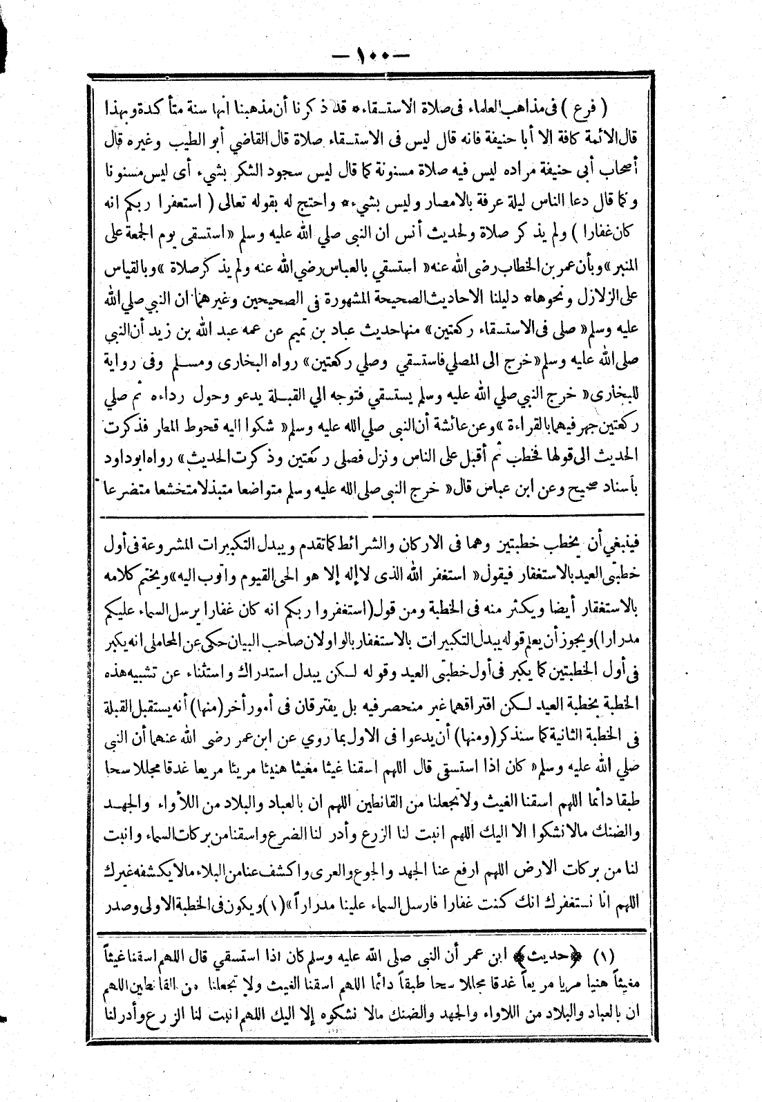 فينبغي أن يخطب خطبتين وهما في الاركان والشرائط كما تقدم ويبدل التكبيرات المشروعة في أول خطبتى العيد بالاستغفار فيقول (استغفر الله الذى لا إله إلا هو الحى القيوم واتوب إليه) ويختم كلامه بالاستغفار أيضا ويكثر منه في الخطبة ومن قول (استغفروا ربكم انه كان غفارا يرسل المساء عليكم مدرارا) ويجوز أن يعلم قوله يبدل التكبيرات بالاستغفار بالواو لان صاحب البيان حكى عن المحاملى انه يكبر في أول الخطبتين كما يكبر في أول خطبتى العيد وقوله لكن يبدل استدراك واستثناء عن تشبيه هذه الخطبة بخطبة العيد لكن افتراقهما غير منحصر فيه بل يفترقان في أمور أخر (منها) أنه يستقبل القبلة في الخطبة الثانية كما سنذكر (ومنها) أن يدعوا في الاول بما روي عن ابن عمر رضى الله عنهما أن النبي صلي الله عليه وسلم (كان إذا استسقى قال اللهم اسقنا غيثا معيثا هنيئا مريئا مريعا غدقا مجللا سحا طبقا دائما اللهم استقنا الغيث ولا تجعلنا من القانطين اللهم ان بالعباد والبلاد من اللاواء والجهد والضنك ما لا نشكوا الا اليك اللهم انبت لنا الزرع وأدر لنا الضرع واسقنا من بركات السماء وانبت لنا من بركات الارض اللهم ارفع عنا الجهد والجوع والعرى واكشف عنا من البلاء ما لا يشفه غيرك اللهم انا نستغفرك انك كنت غفارا فارسل السماء علينا مدرارا) ويكون في الخطبة الاولى وصدر