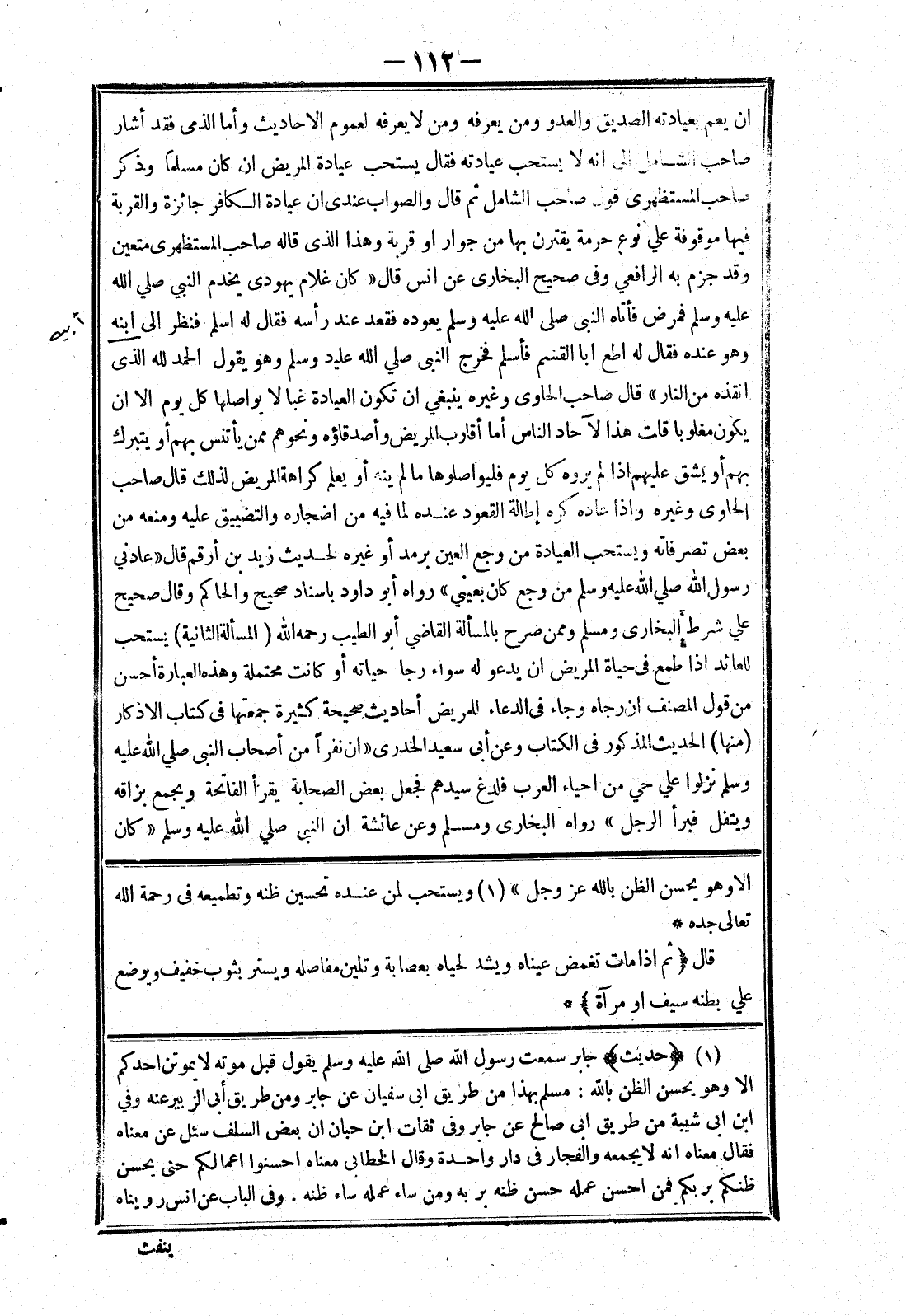 الا وهو يحسن الظن بالله عزوجل) ويستحب لمن عنده تحسين ظنه وتطميعه في رحمة الله تعالى جده قال (ثم إذا مات تغمض عيناه ويشد لحياه بعصابة وتلين مفاصله ويستر بثوب خفيف ويوضع علي بطنه سيف أو مرآة)