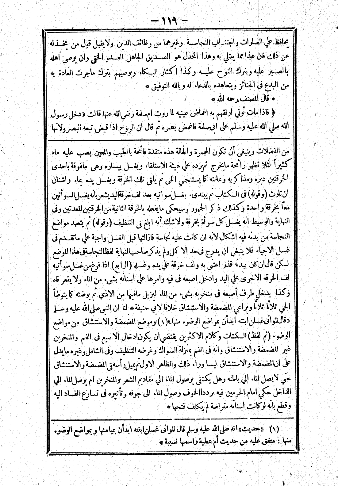 (قال للواتي غسلن ابنته ابدأن بمواضع الوضوء منها) وموضع المضمضة والاستنشاق من مواضع الوضوء (ثم لفظ) الكتات وكلام الاكثرين يقتضي ان يكون ادخال الاصبع في الفم والمنخرين غير المضمضة والاستنشاق وانه في الفم بمنزلة السواك وغرضه التنظيف وفي الشامل وغيره ما يدل على ان المضمضة والاستنشاق ليسا وراء ذلك والظاهر الاول ثم يميل رأسه في المضمضة والاستنشاق حتي لا يصل الماء الي باطنه وهل يكتفى بوصول الماء الي مقاديم الشعر والمنخرين ام يوصل الماء الي الداخل حكي امام الحرمين فيه ترددا الخوف وصول الماء إلى جوفه وتأثيره في تسارع الفساد إليه وقطع بانه لو كانت اسنانه متراصة لم يكلف فتحها *