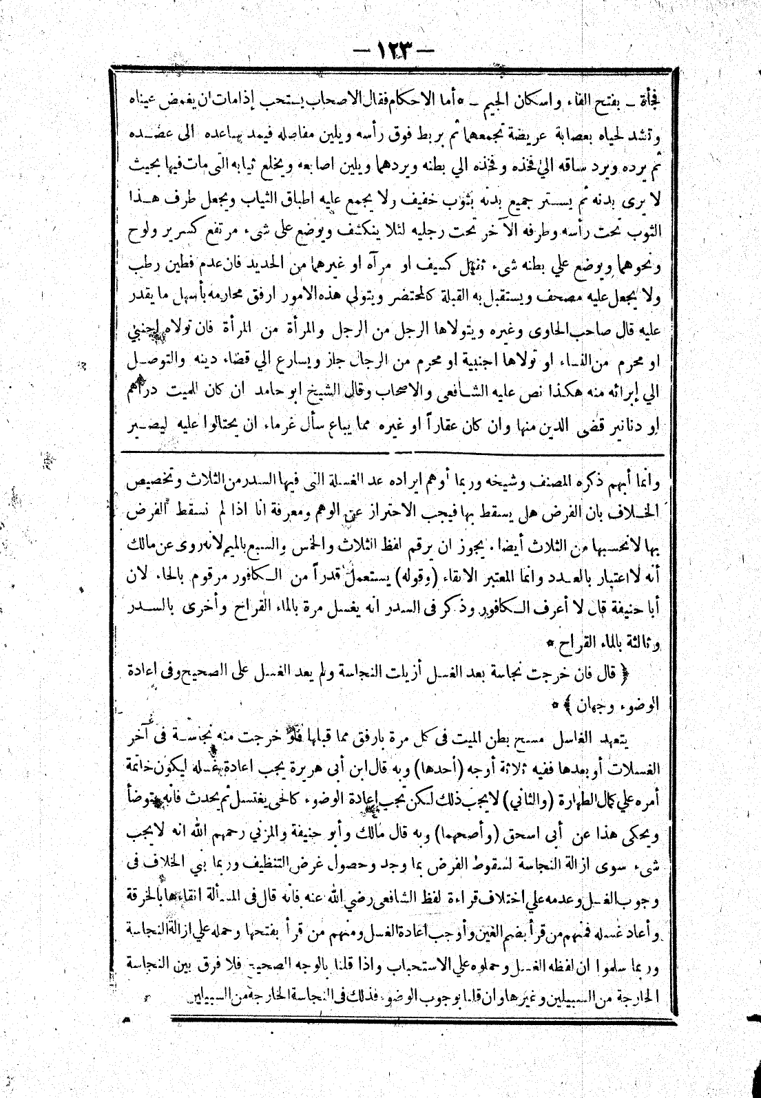 وانما أبهم ذكره المصنف وشيخه وربما أوهم ايراده عد الغسلة التى فيها السدر من الثلاث وتخصيص الخلاف بان الفرض هل يسقط بها فيجب الاحتراز عن الوهم ومعرفة انا إذا لم نسقط الفرض بها لا نحسبها من الثلاث أيضا يجوز ان يرقم لفظ الثلاث والخمس والسبع بالميم لانه روى عن مالك أنه لا اعتبار بالعدد وانما المعتبر الابقاء (وقوله) يستعمل قدرا من الكافور مرقوم بالحاء لان أبا حنيفه قل لا أعرف الكافور وذكر في السدر انه يغسل انه يغسل مرة بالماء القراح وأخرى بالسدر وثالثة بالماء القراح * (قال فان خرجت نجاسة بعد الغسل أزيلت النجاسة ولم يعد الغسل على الصحيح وفي اعادة الوضوء وجهان) * يتعهد الغاسل مسح بطن الميت في كل مرة بارفق مما قبلها فلو خرجت منه نجاسة في آخر الغسلات أو بعدها ففيه ثلاثة أوجه (احدها) وبه قال ابن أبى هريرة يجب اعادة غسله ليكون خاتمة أمره علي كمال الطهارة (وأصحهما) وبه قال مالك وأبو حنيفة والمزني رحمهم الله انه لا يجب