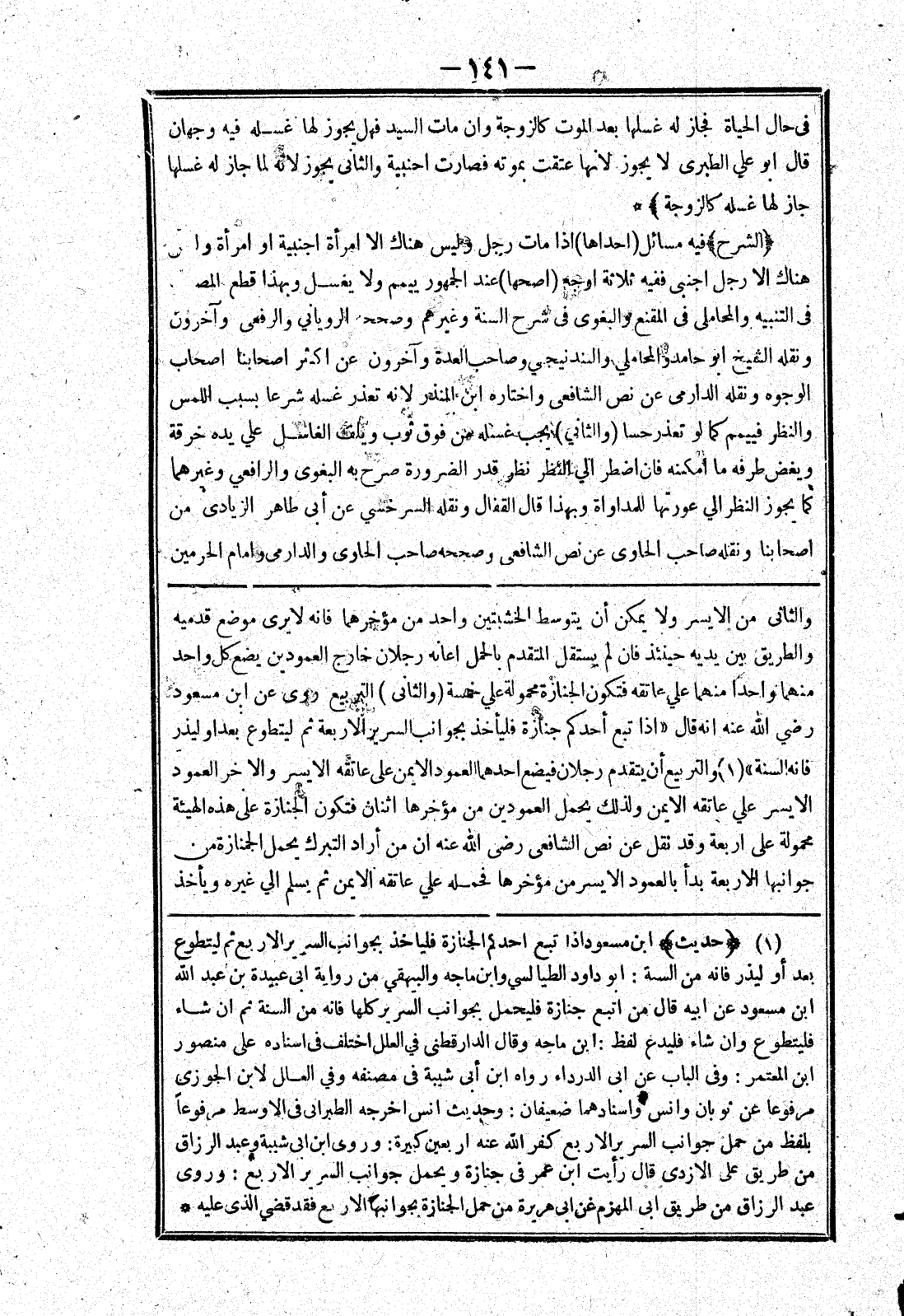 والثانى من الايسر ولا يمكن أن يتوسط الخشبتين واحد من مؤخرهما فانه لا يرى موضع قدميه والطريق بين يديه حينئذ فان لم يستتقل المتقدم بالحمل اعانه رجلان خارج العمودين يضع كل واحد منهما واحدا منهما علي عاتقه فتكون الجنازة محمولة علي خمسة (والثانى) التربيع روى عن ابن مسعود رضي الله عنه انه قال (إذا تبع أحد كم جنازة فليأخذ بجوانب السرير الاربعة ثم ليتطوع بعد أو ليذر فانه السنة) والتربيع أن يتقدم رجلان فيضع احدهما العمود الايمن على عاتقه الا يسر والاخر العمود الايسر علي عاتقه الايمن ولذلك يحمل العمودين من مؤخرها اثنان فتكون الجنازة على هذه الهيئة محمولة على اربعة وقد نقل عن نص الشافعي رضى الله عنه ان من أراد التبرك يحمل الجنازة من جوانبها الاربعة بدأ بالعمود الايسر من مؤخرها فحمله علي عاتقه الايمن ثم يسلم الي غيره ويأخذ